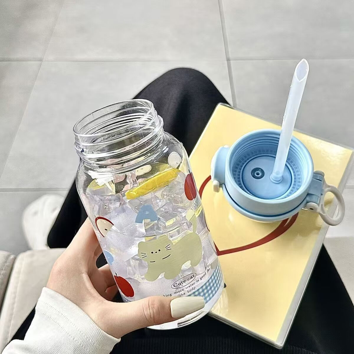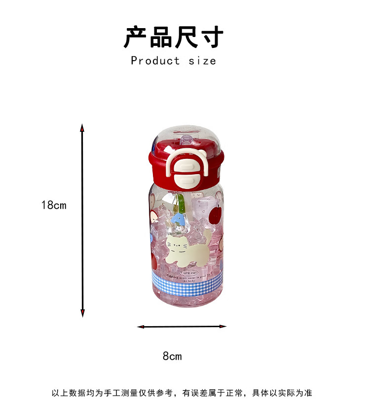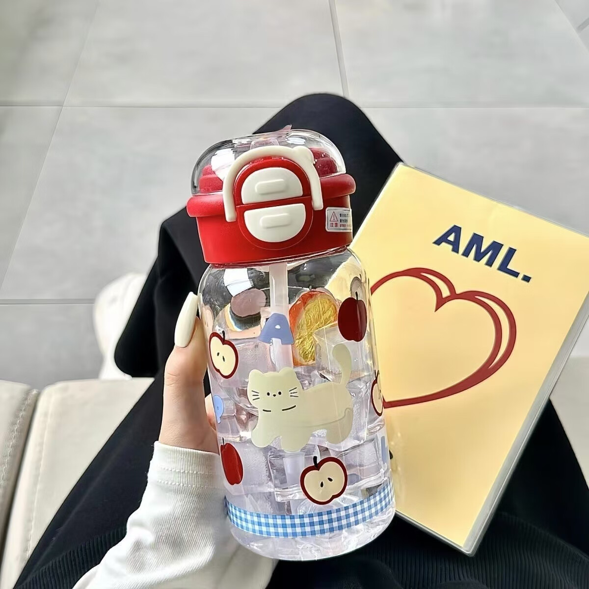 Internet celebrity ins style portable plastic water cup cartoon large capacity straw cup double drinking student male and female red apple cat 500ml