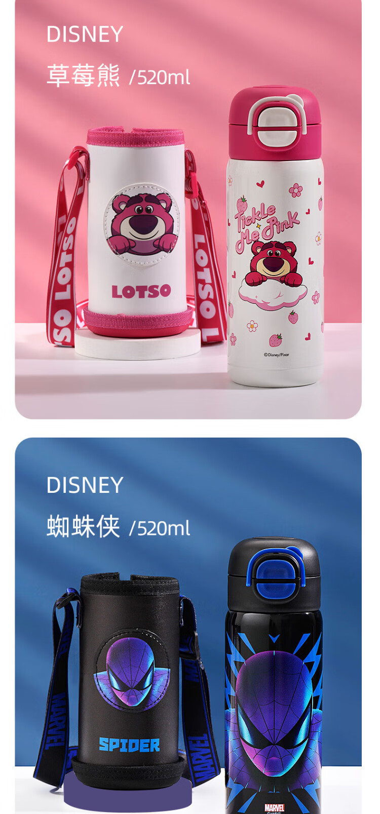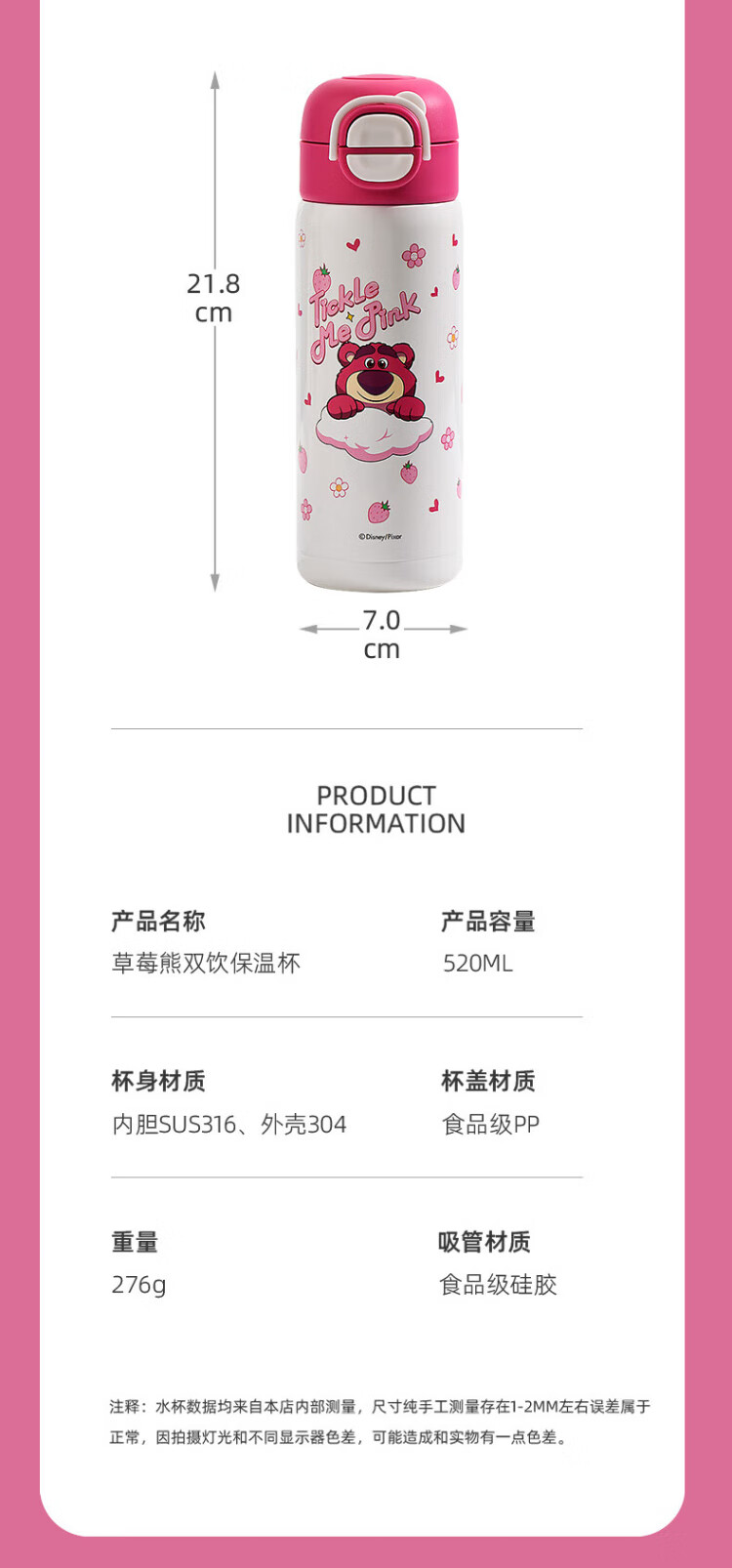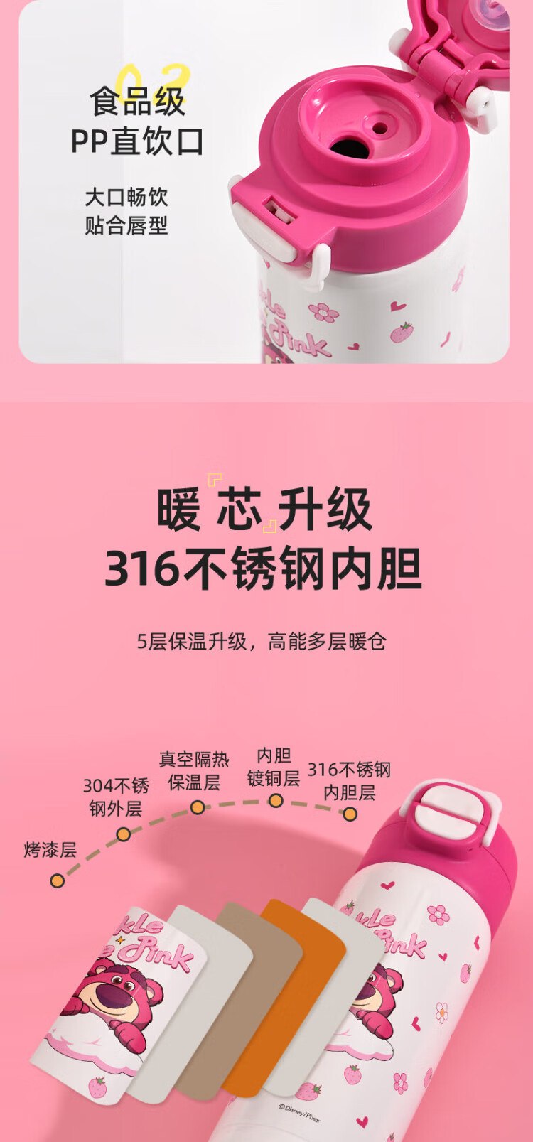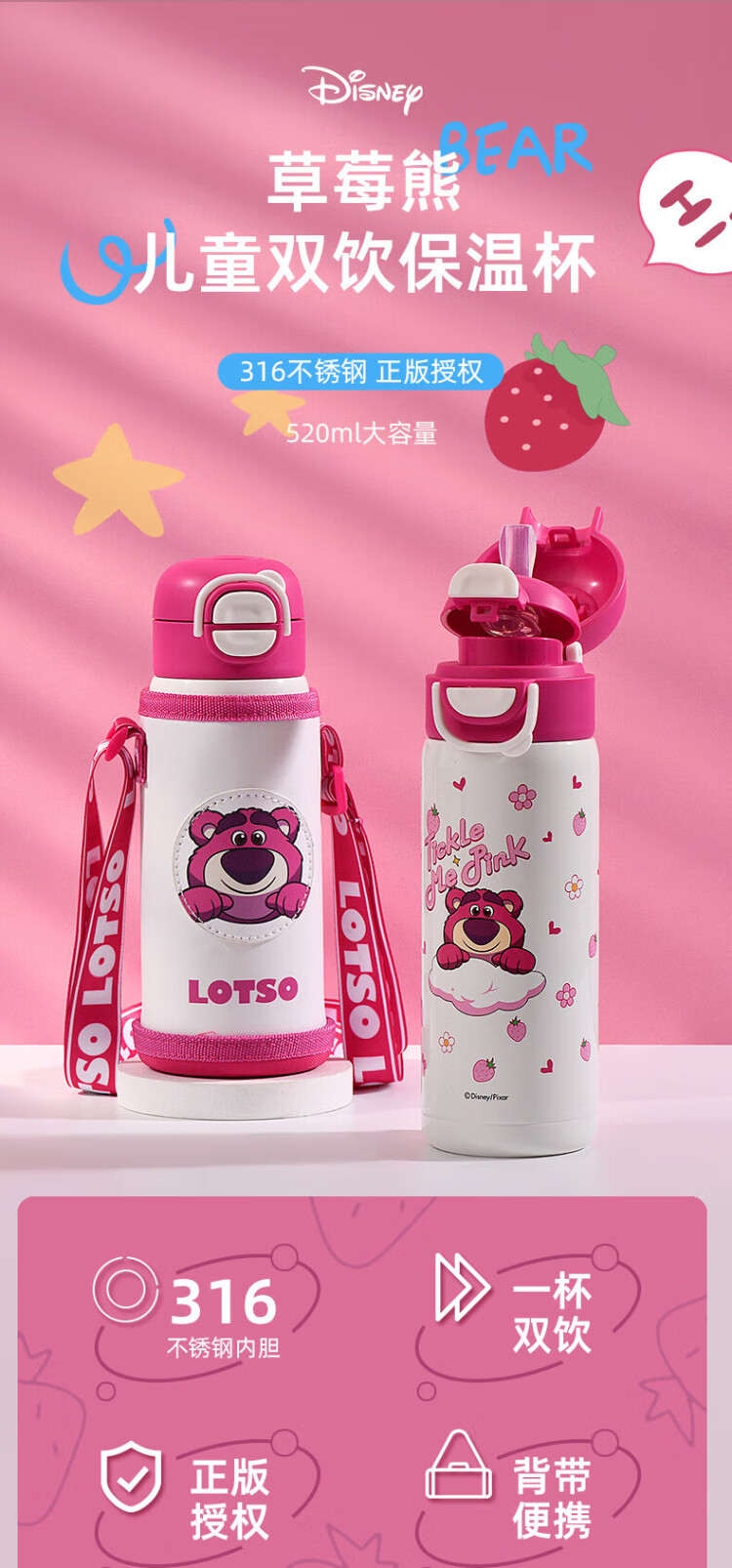 Disney Insulated Cup Children's Double Drinking Cup with Straw 316 Stainless Steel Male and Female Elementary School Large Capacity 6296 Strawberry Bear