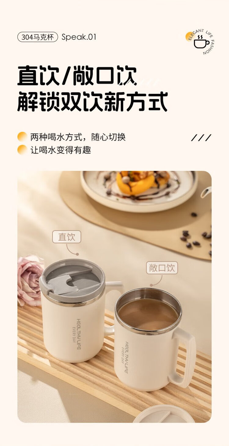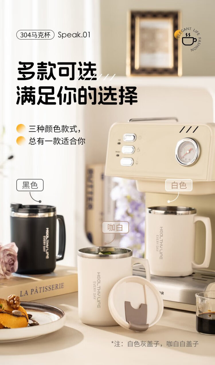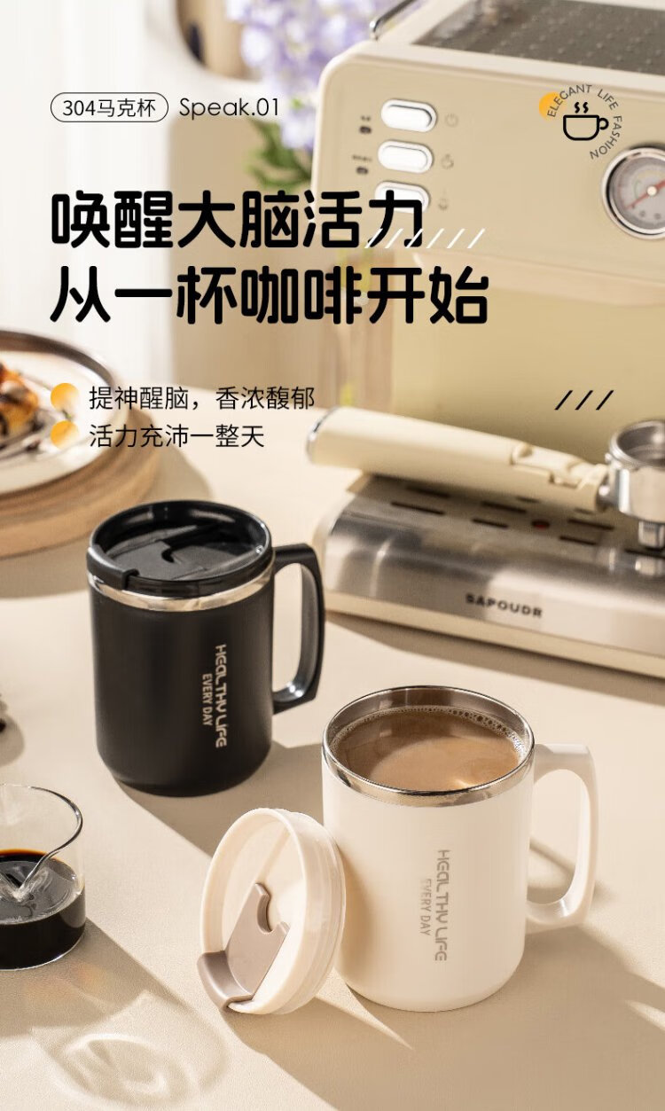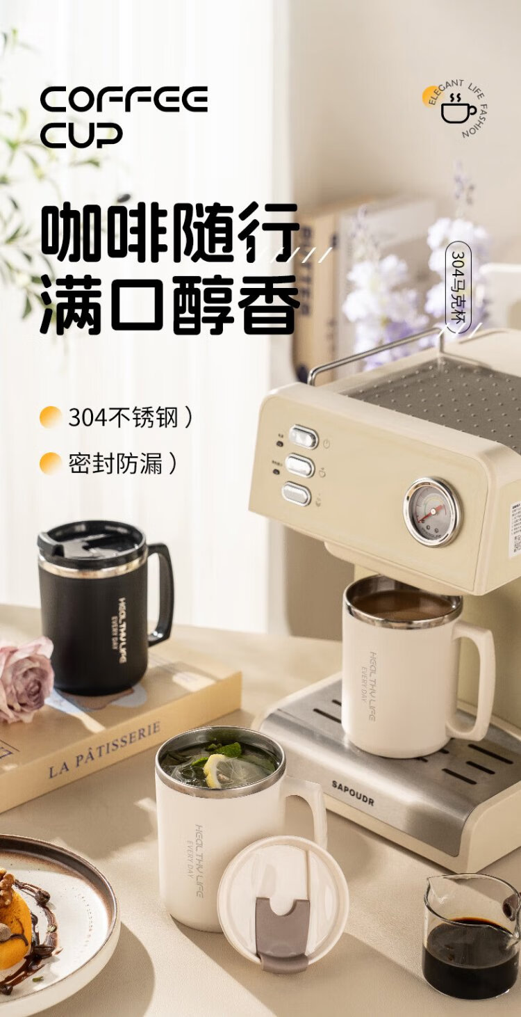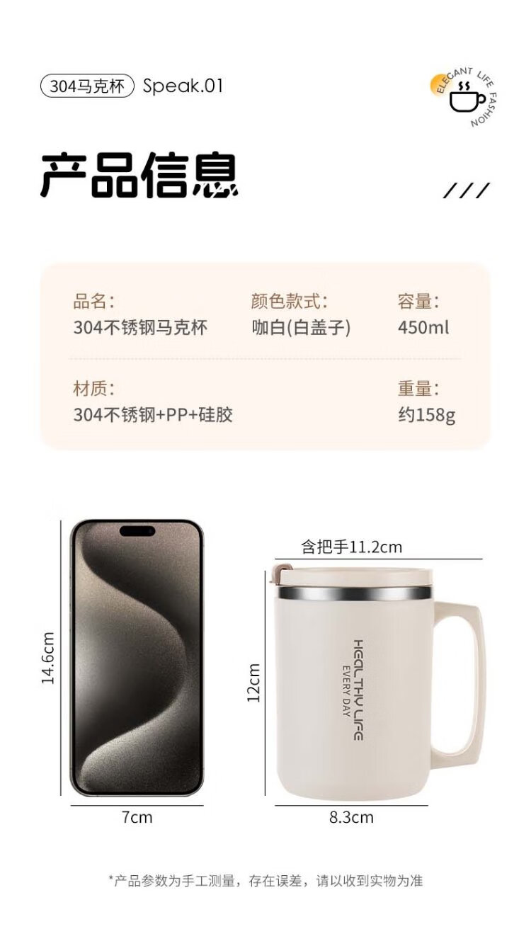 CAIZHI 304 stainless steel water cup, mug, coffee cup with lid, household double-layer anti-scald drinking cup, coffee white CZ6228