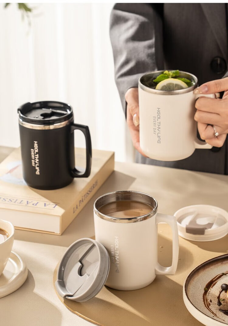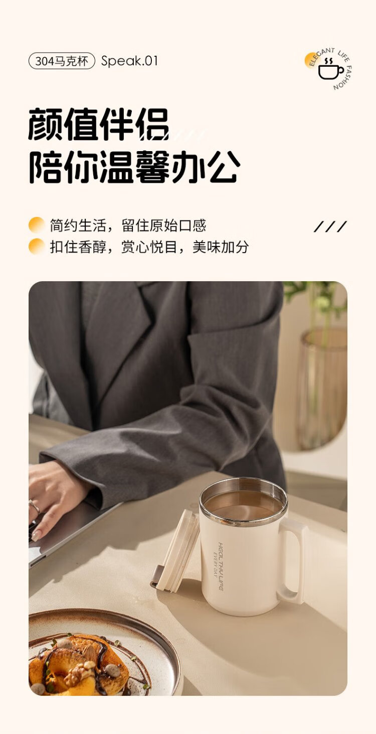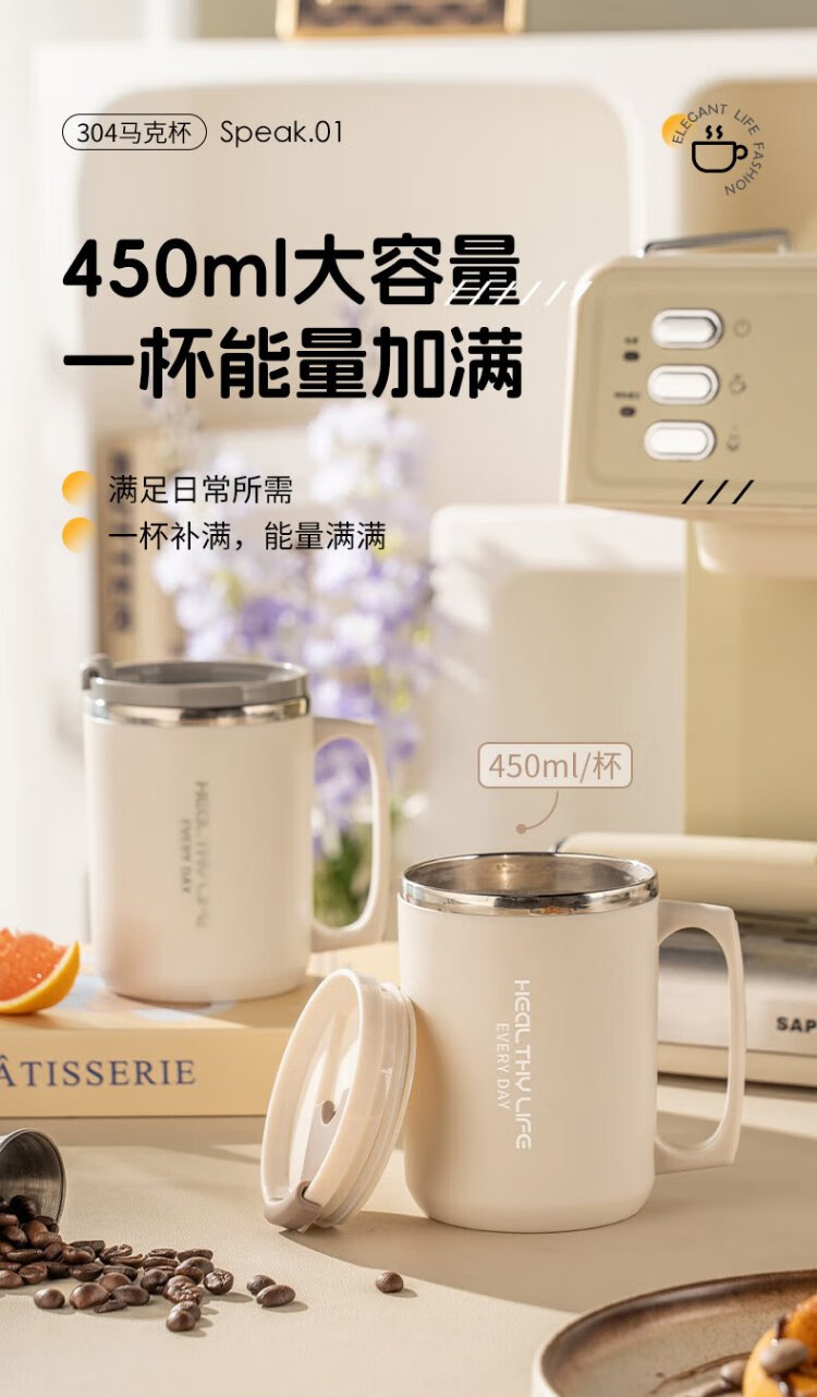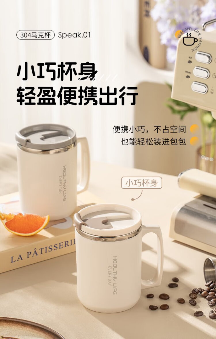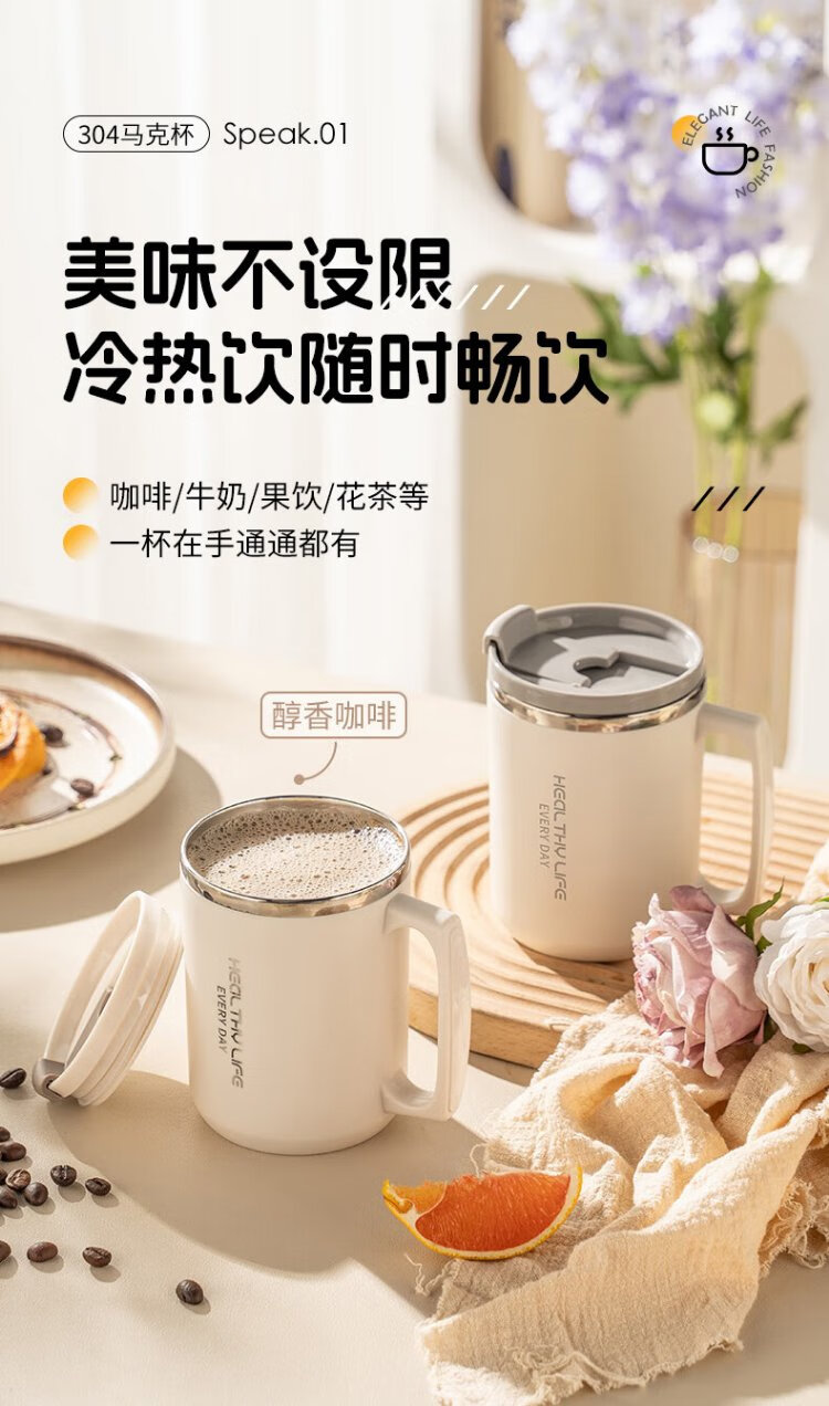 CAIZHI 304 stainless steel water cup, mug, coffee cup with lid, household double-layer anti-scald drinking cup, coffee white CZ6228