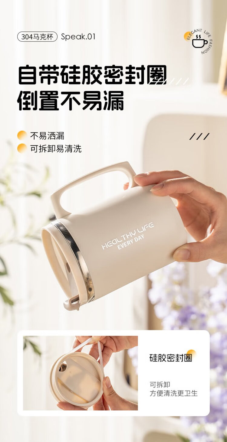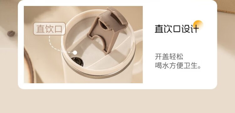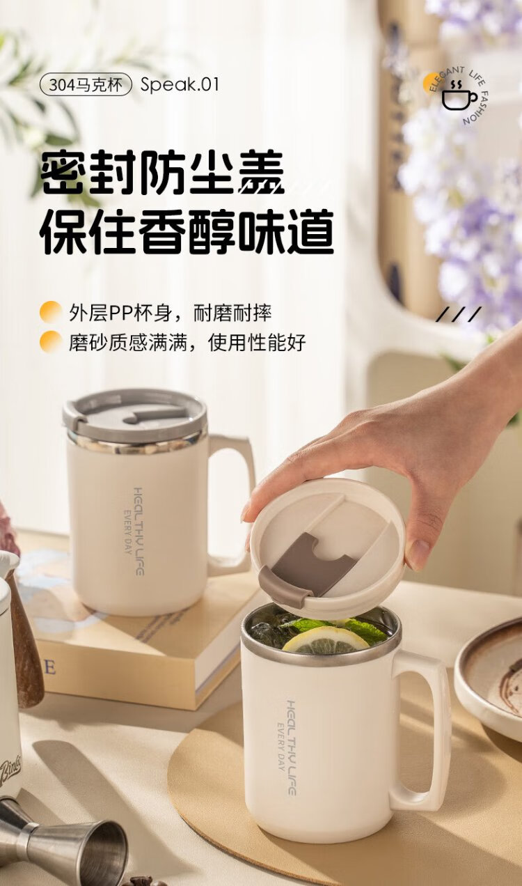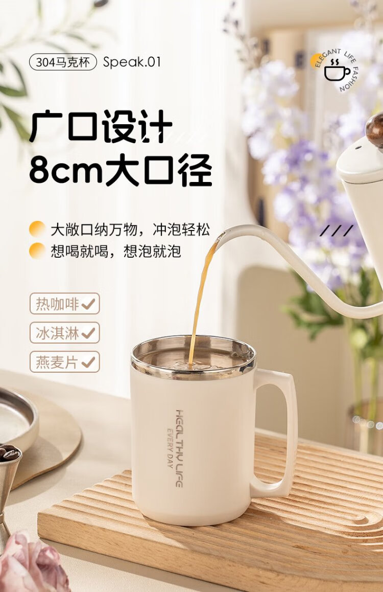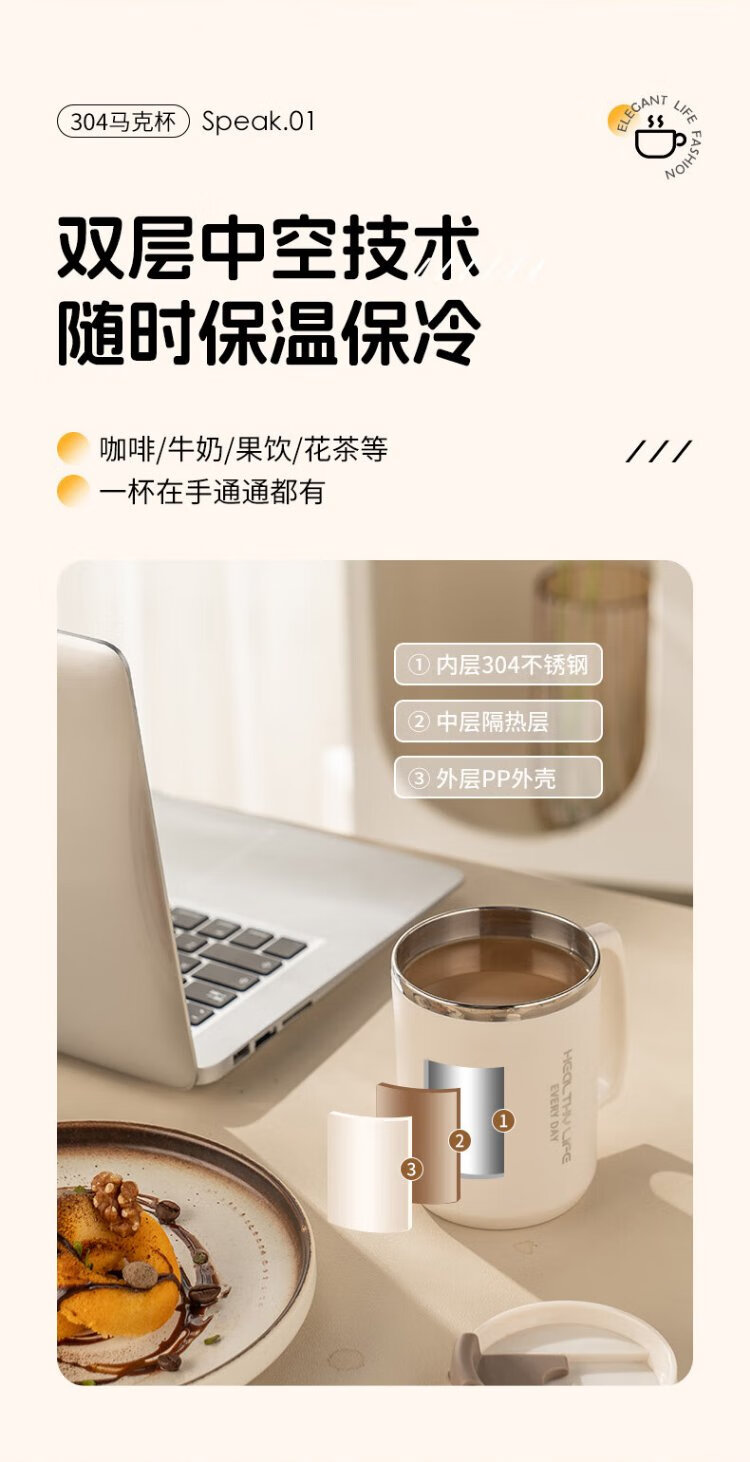 CAIZHI 304 stainless steel water cup, mug, coffee cup with lid, household double-layer anti-scald drinking cup, coffee white CZ6228