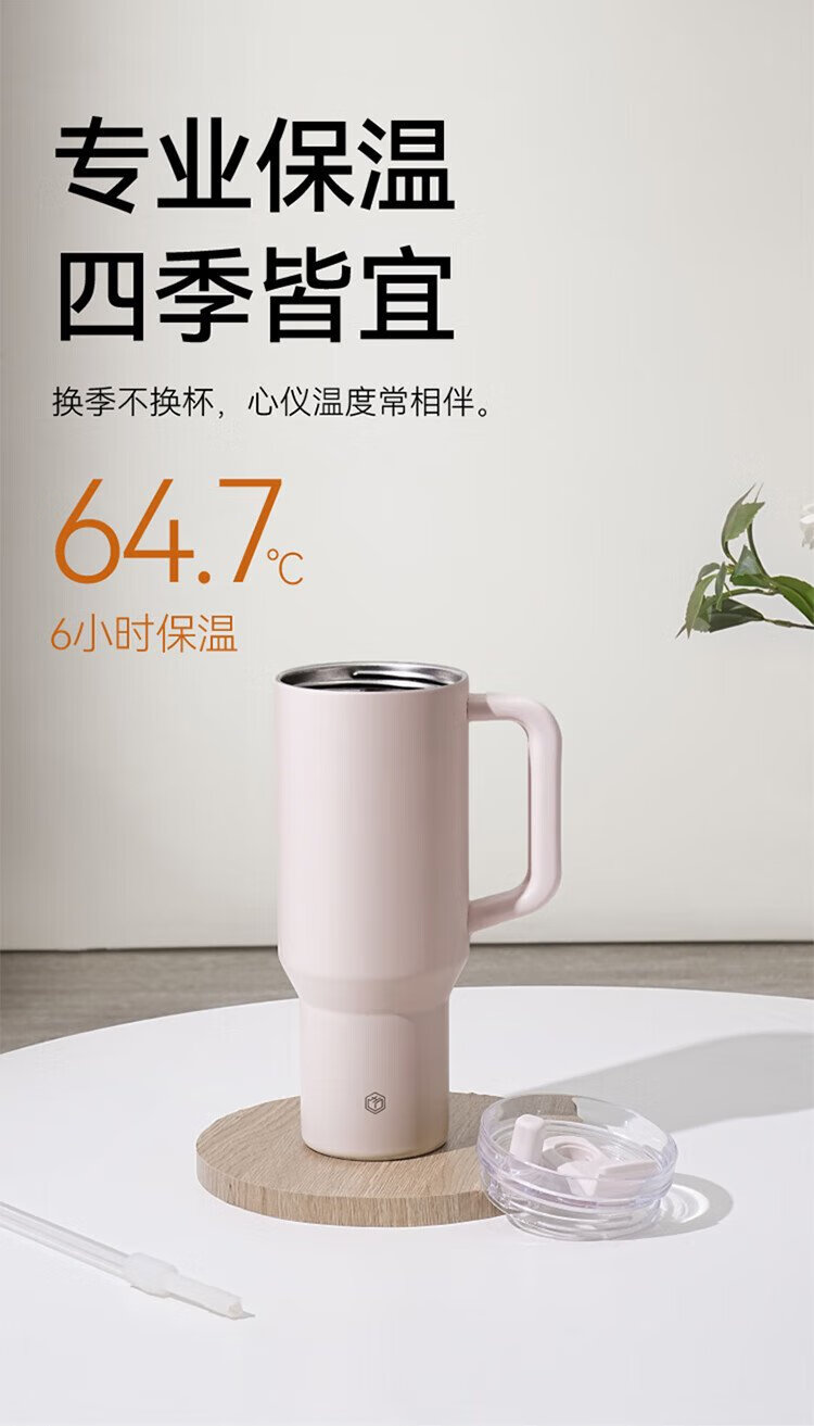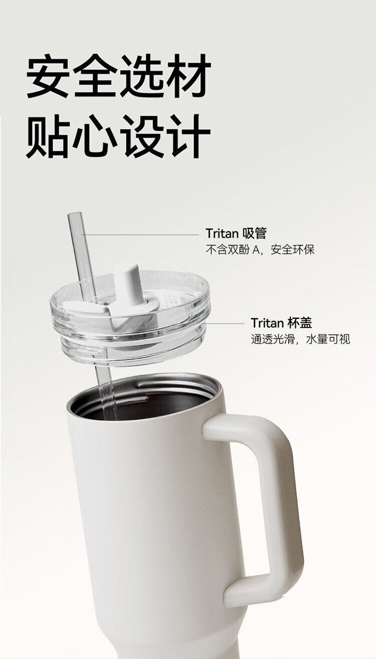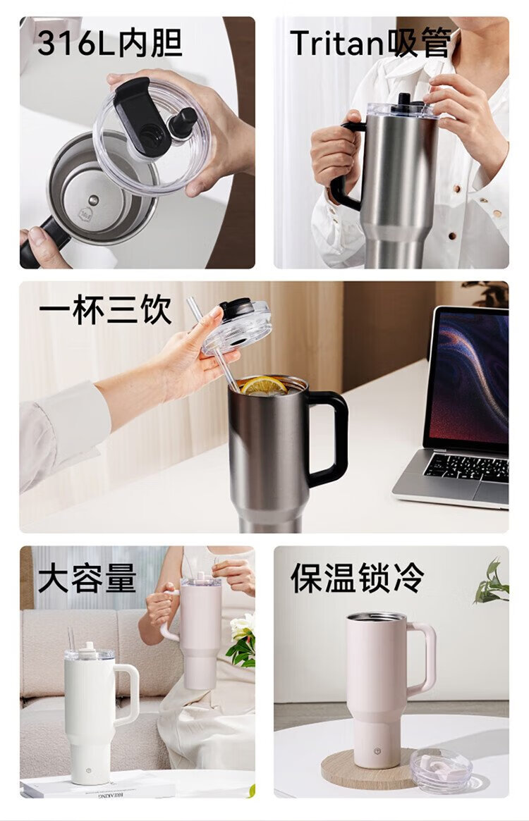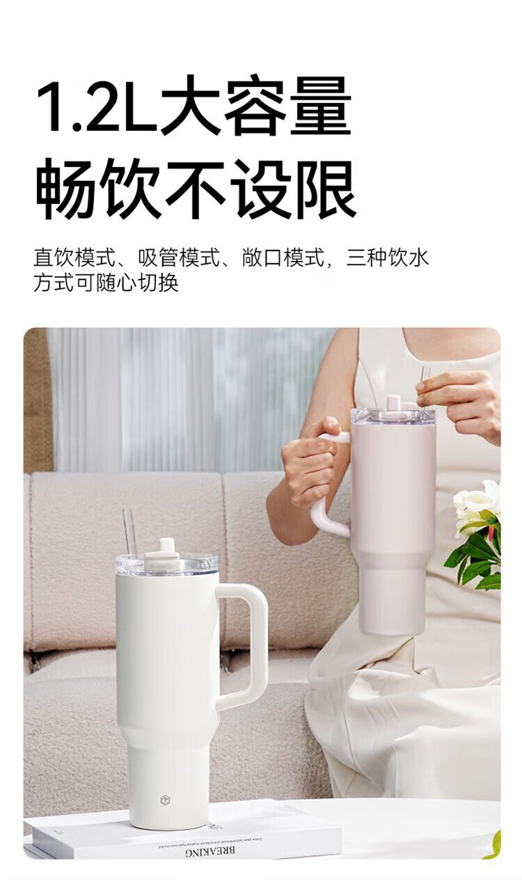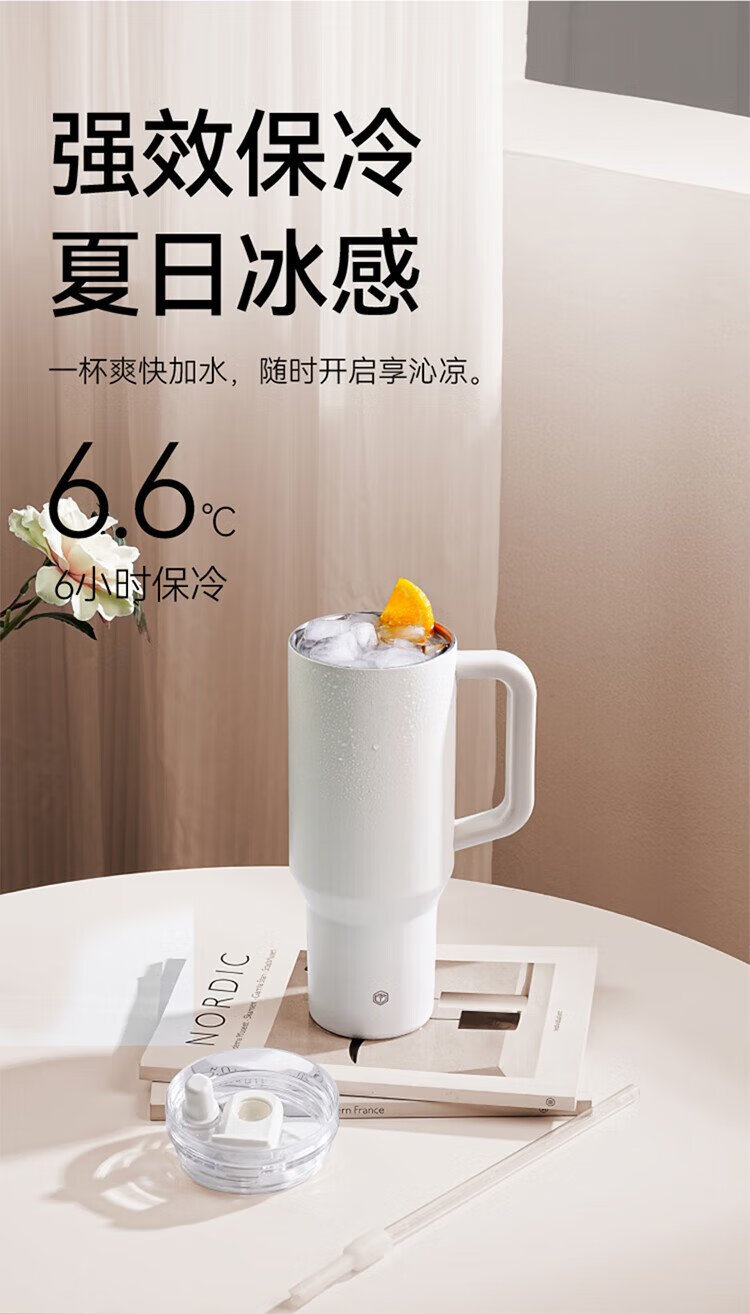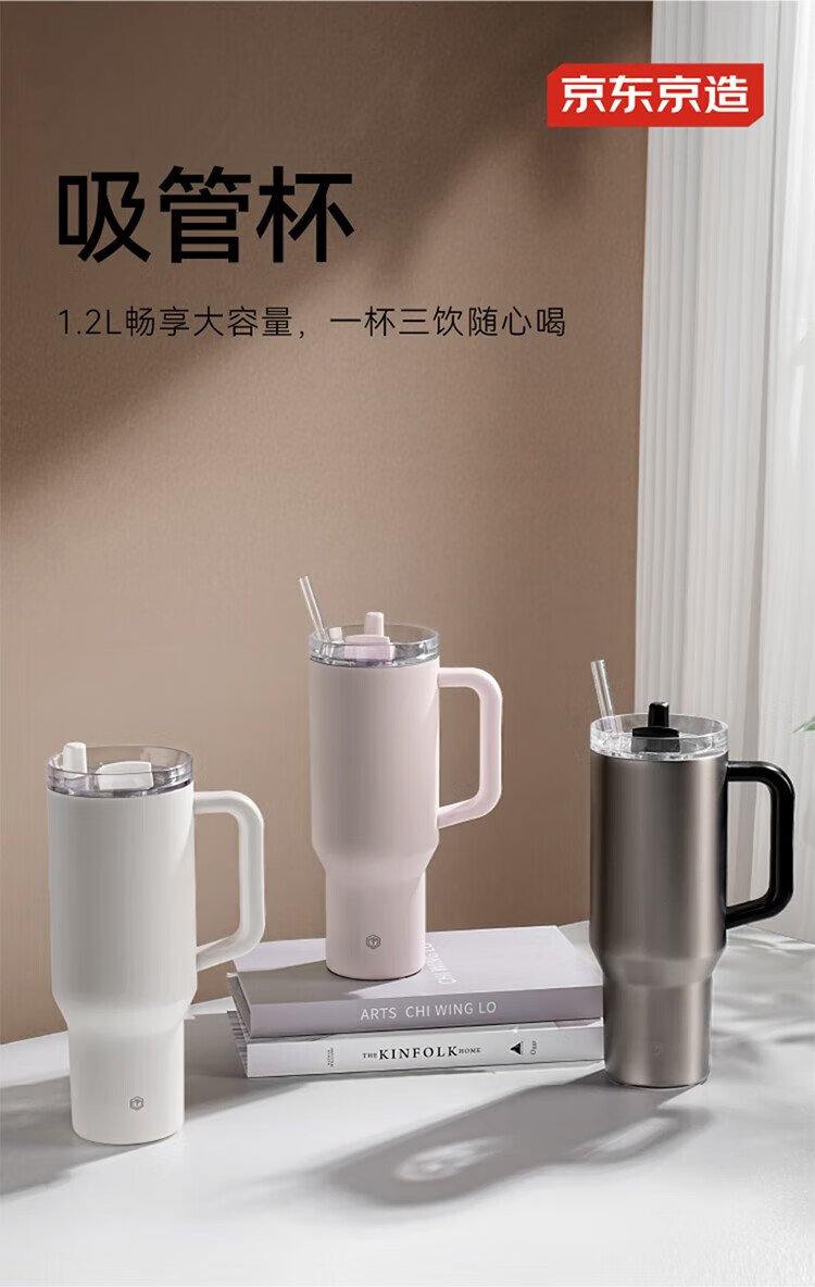 Jingdong large-capacity straw thermos cup 316L stainless steel boys and girls gift desktop office water cup 1.2L white