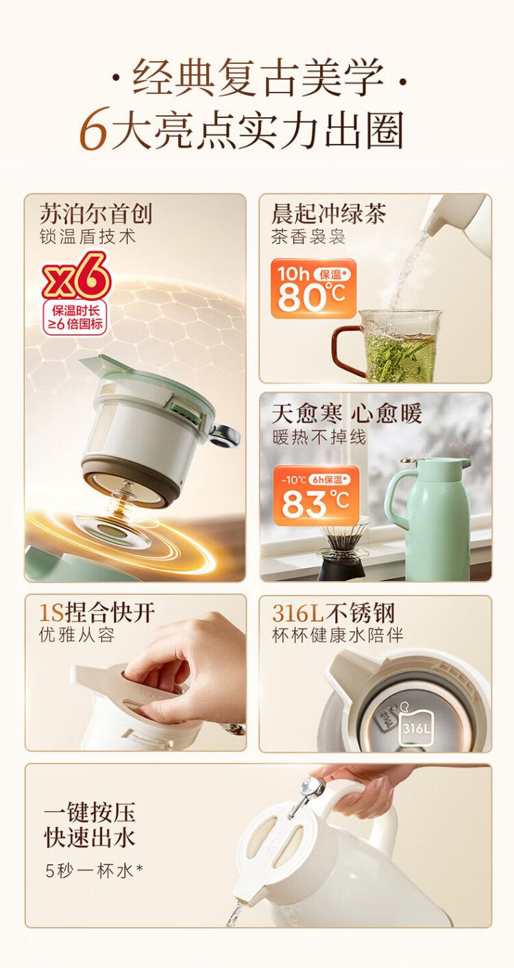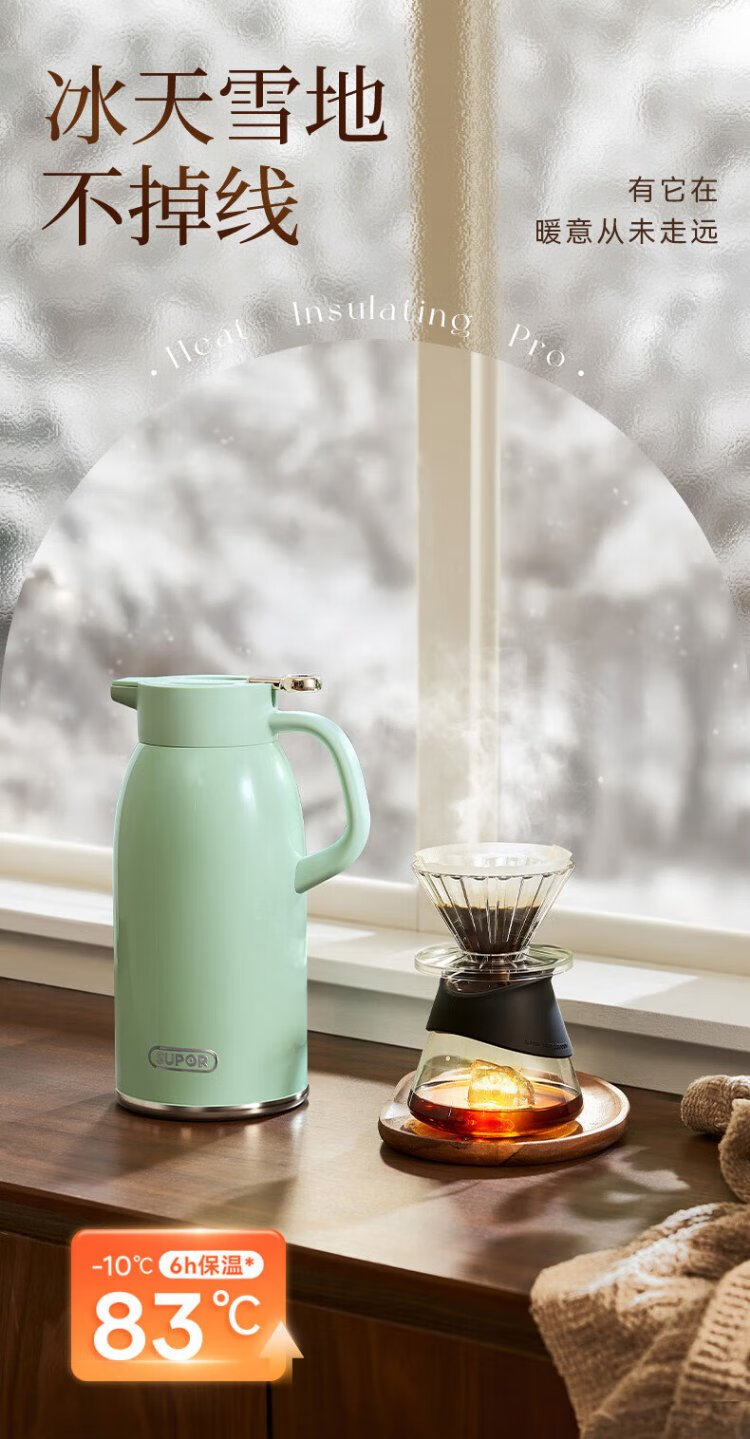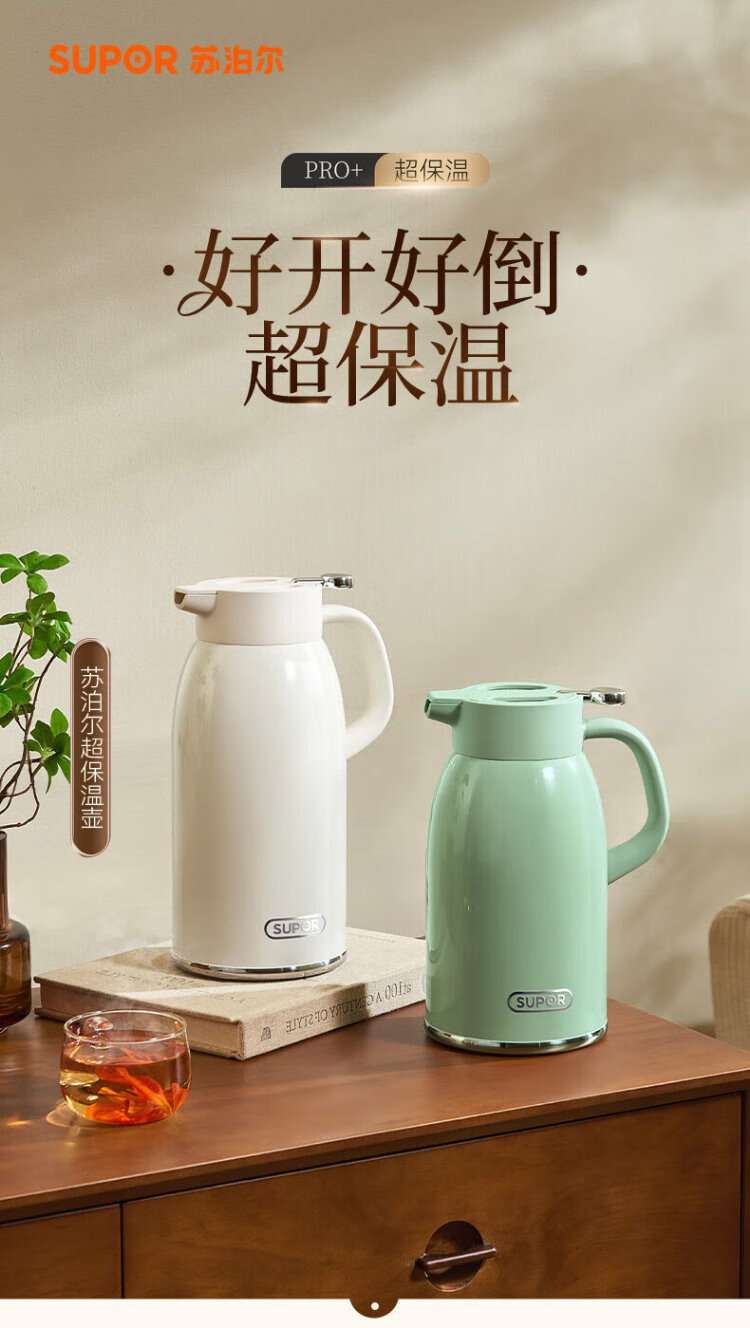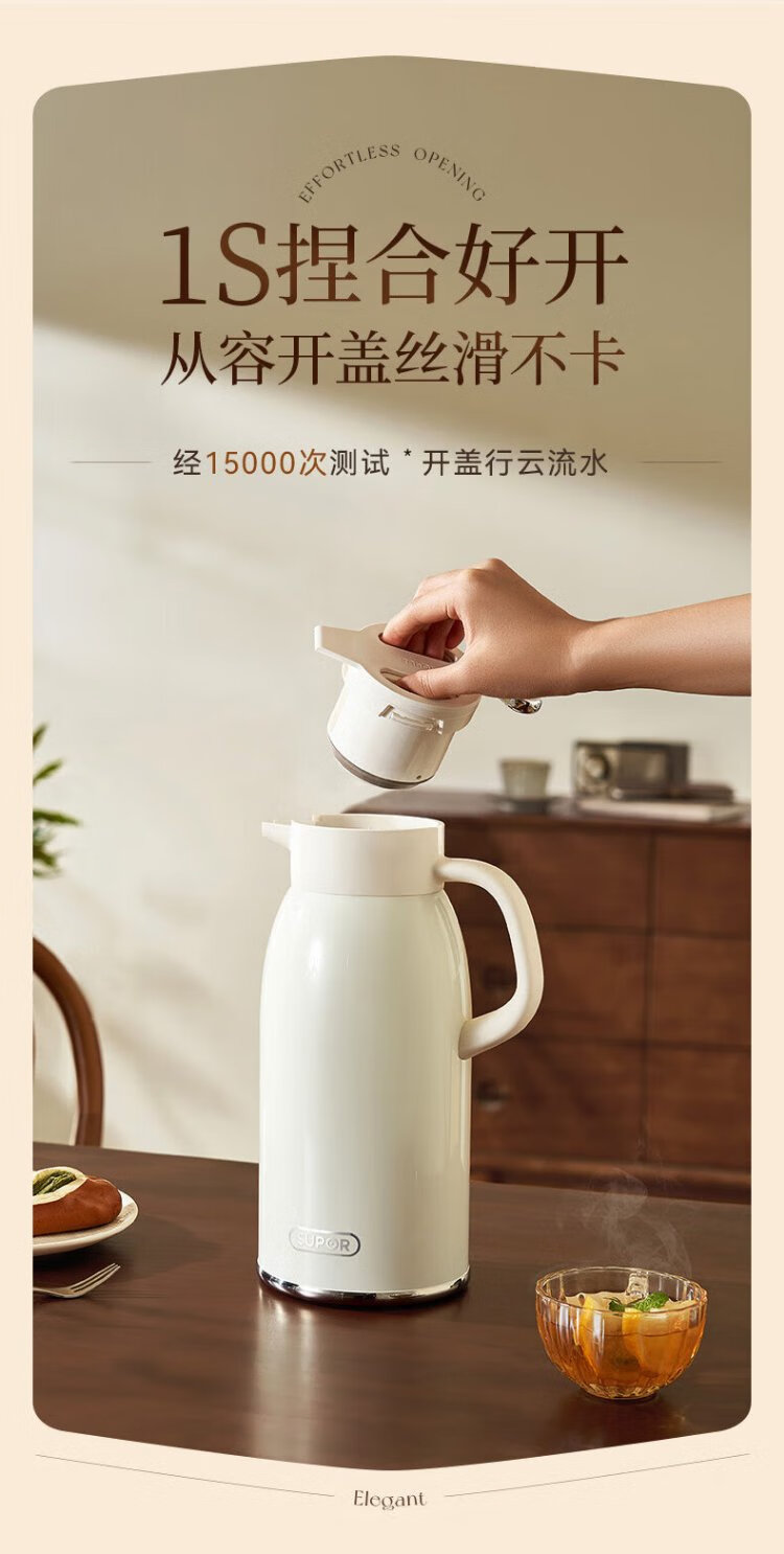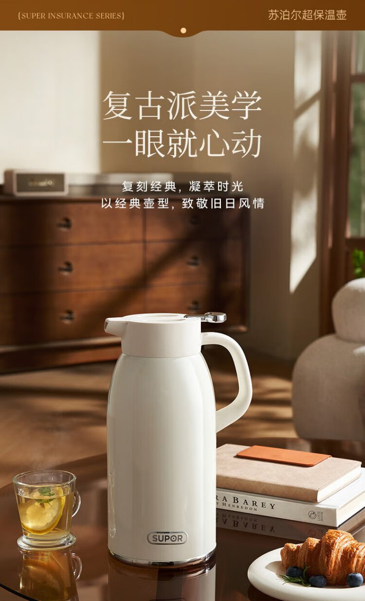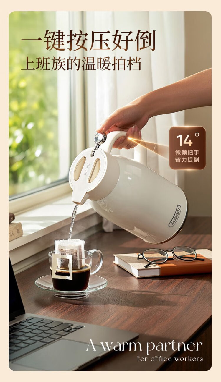 SUPOR thermos kettle 316L stainless steel large capacity household hot water kettle office thermos thermos 2L cream white