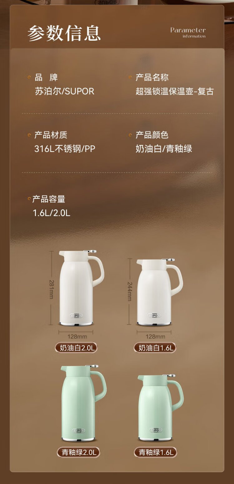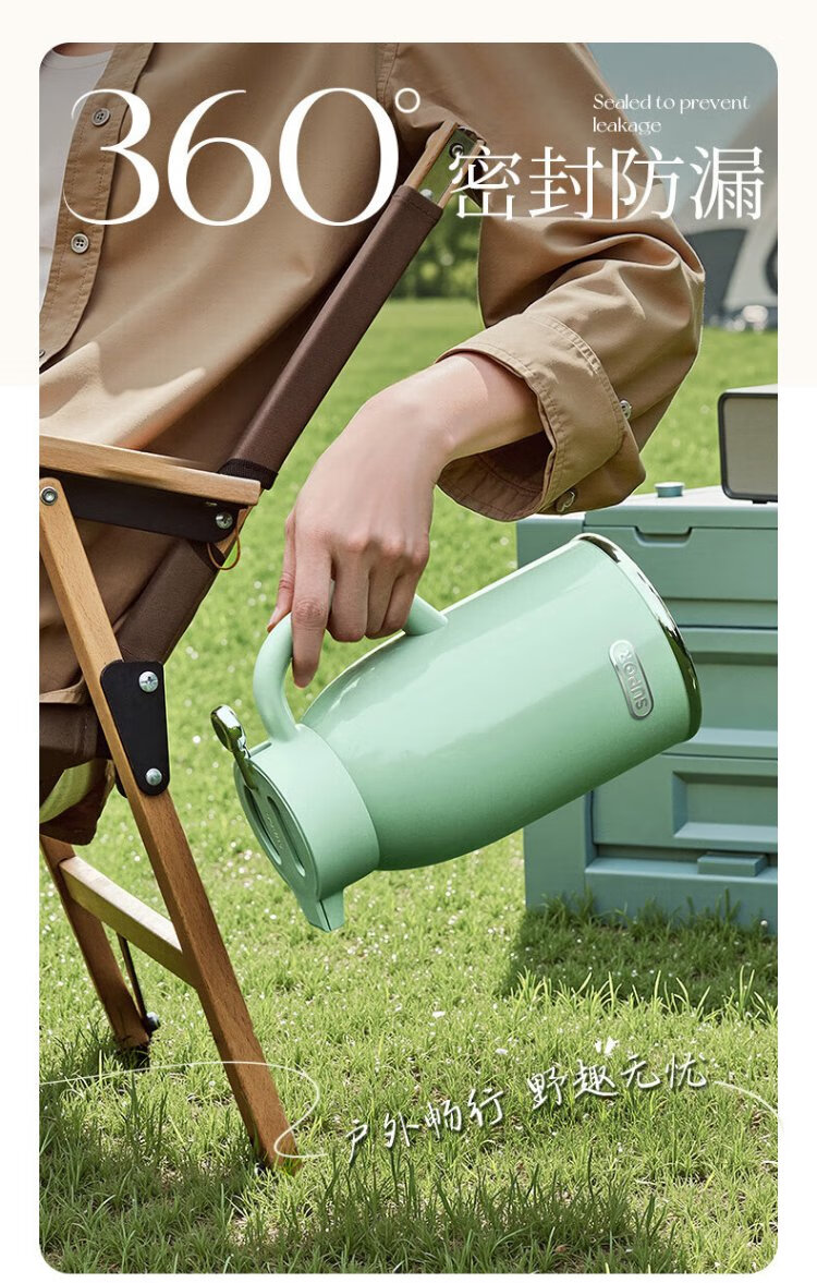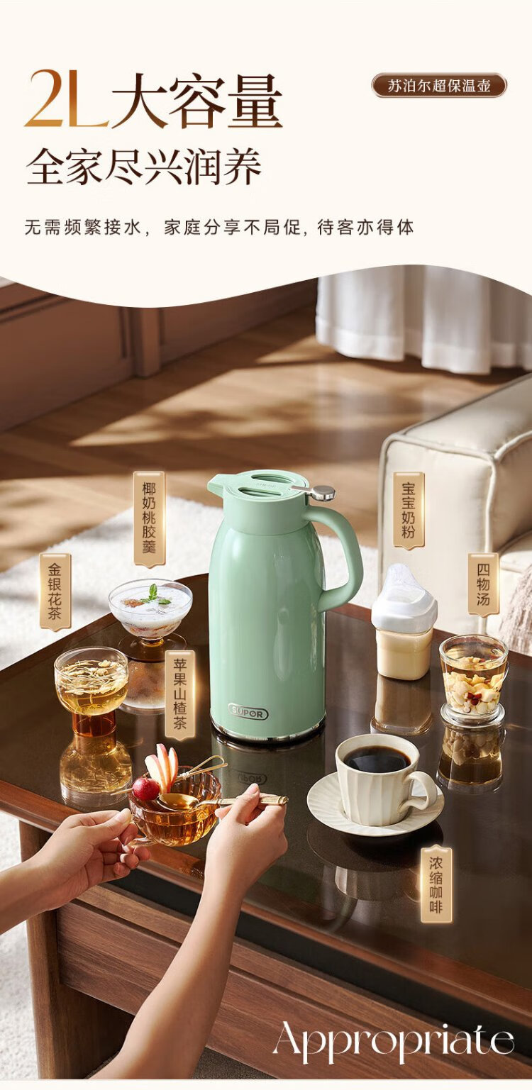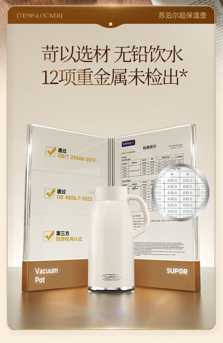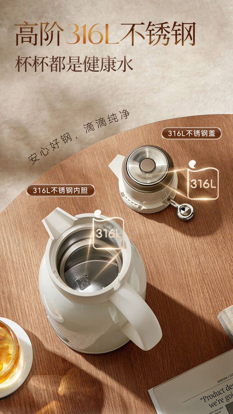 SUPOR thermos kettle 316L stainless steel large capacity household hot water kettle office thermos thermos 2L cream white