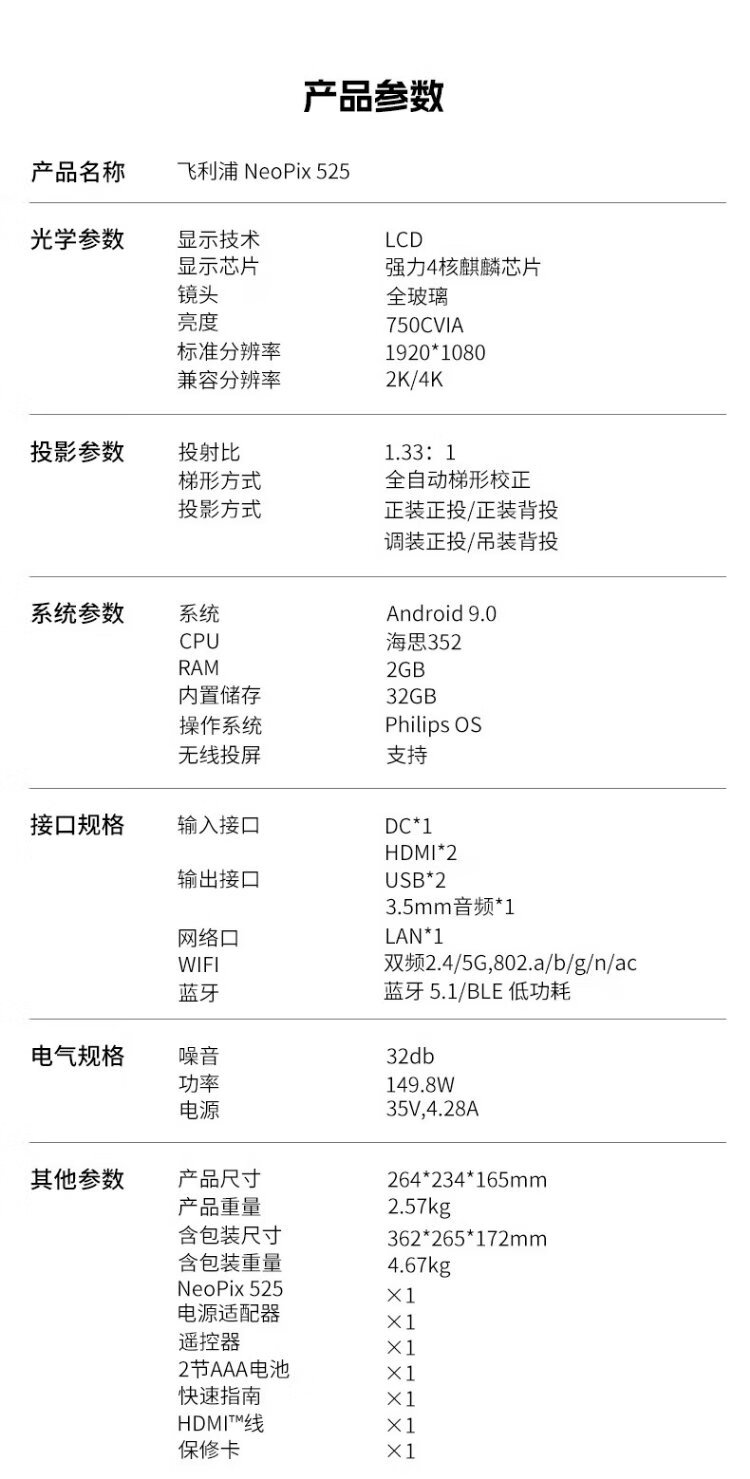 Philips (PHILIPS) NeoPix 525 Projektor Heimbüro Heimkino Wohnzimmer Schlafzimmer Großbildfernseher HD tagsüber Mobiltelefon drahtloser Computerprojektionsbildschirm Lehrkonferenzprojektor