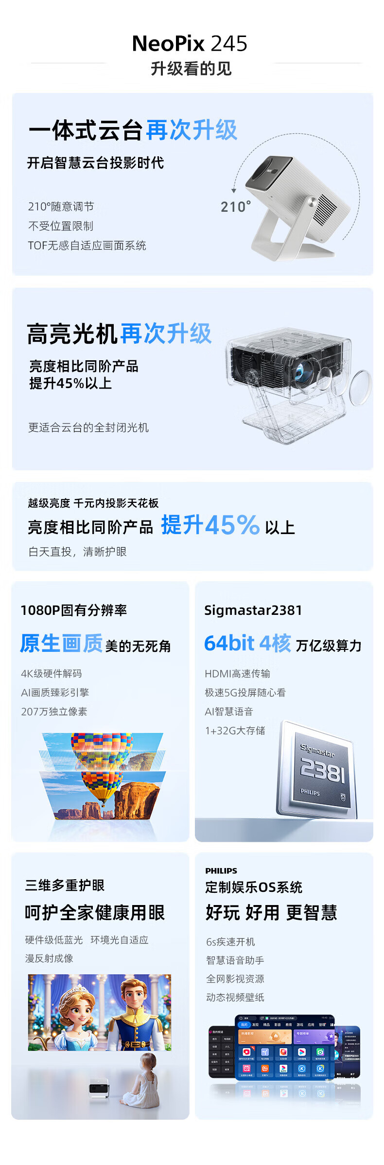 Philips (PHILIPS) NeoPix 245 Projektor für Zuhause, 1080P, Büroprojektor, Schlafzimmer, Fernseher, Heimkino, tragbare Smartphone-Projektion, Heimkino, Ultra-High-Definition, tagsüber, integriertes Doppelarm-Schwenken/Neigen + tausend Yuan Flaggschiff-Maschinenkönig