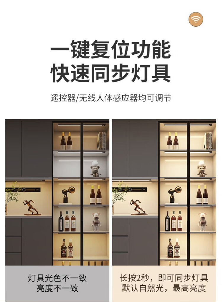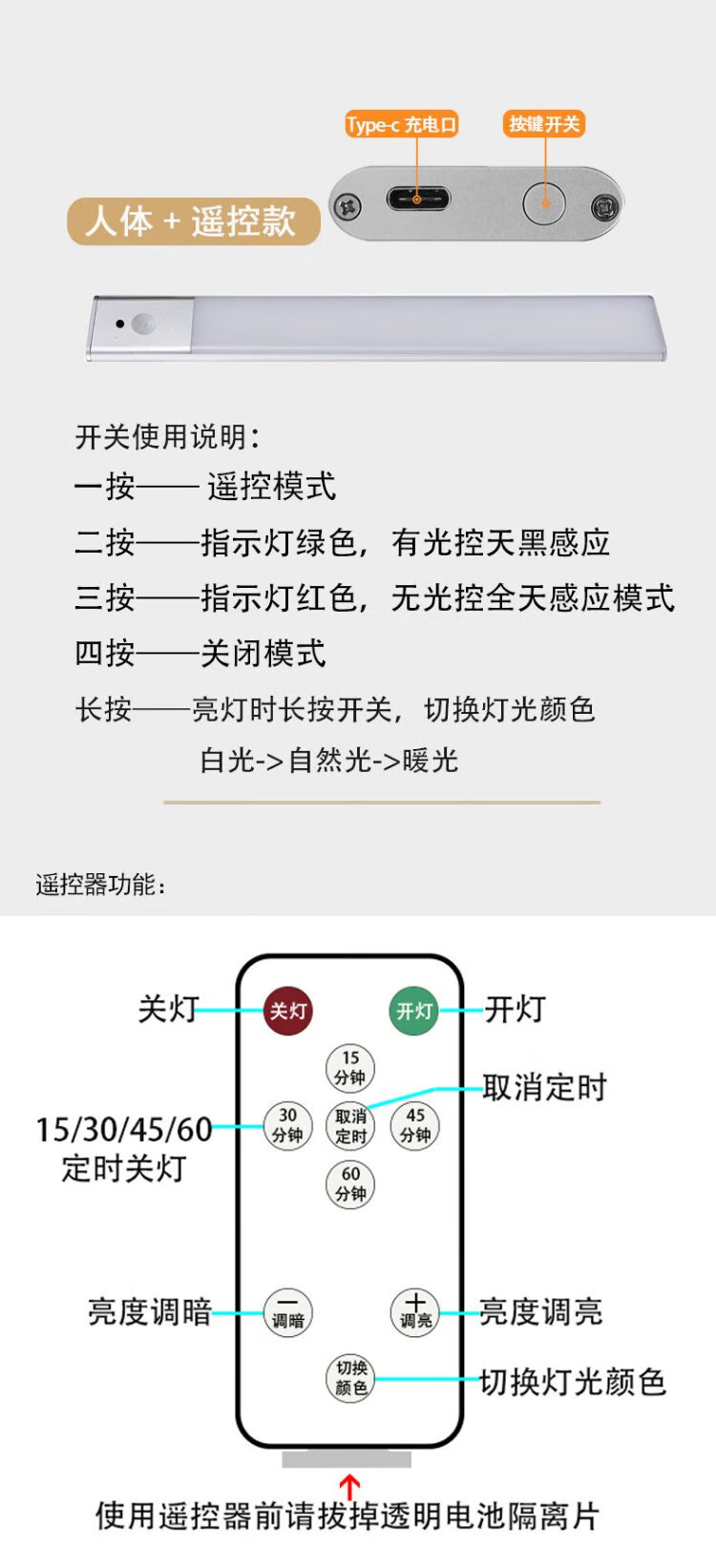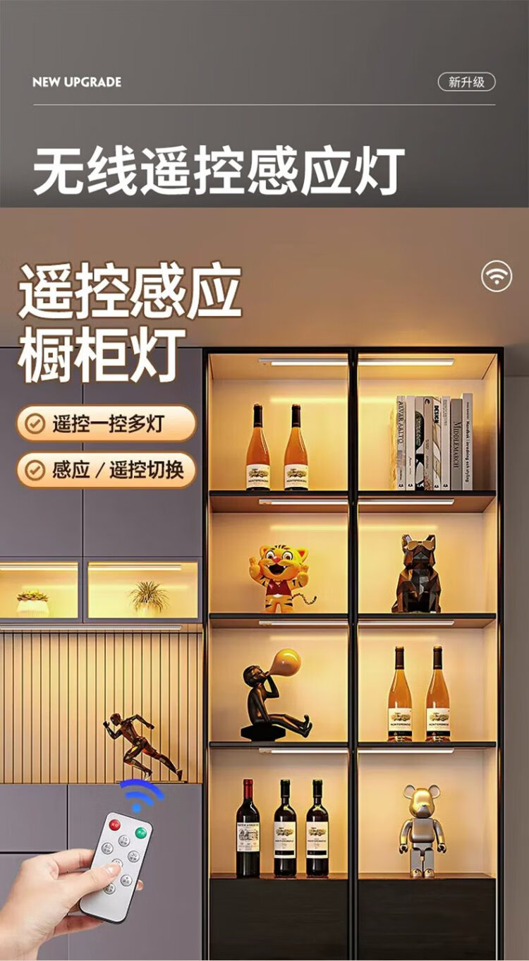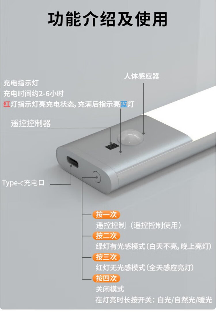Zhite kabelloses Sensorlicht, Garderobenlicht, Schranklicht, Weinschranklicht, Eingang, Sensorlicht für den menschlichen Körper, ultradünne, verkabelungsfreie LED-Lichtleiste, 60 cm, dreifarbig, schwarz, Fernbedienung + Induktion des menschlichen Körpers, Dual-Modus