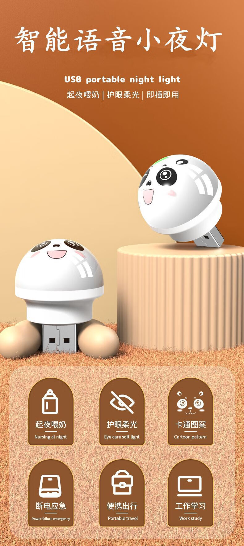 Qifan Panda Creative Night Light Smart Voice Lamp Bedside Mini Night Light Convenient Round Light Cartoon Holiday Gift USB Direct Plug Night Light 2 pcs
