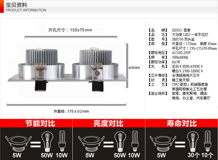 西索 LED射灯天花灯筒灯射灯6W 格栅灯斗胆灯 双头方形 黑银色 拉丝银双头射灯 6W暖白光开孔155x75mm