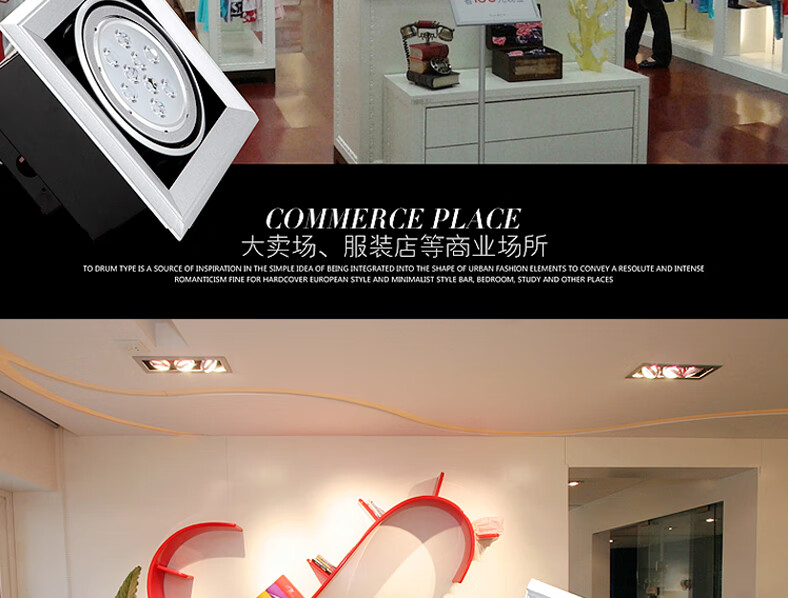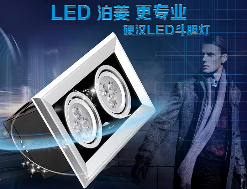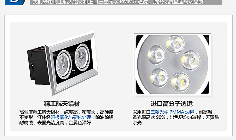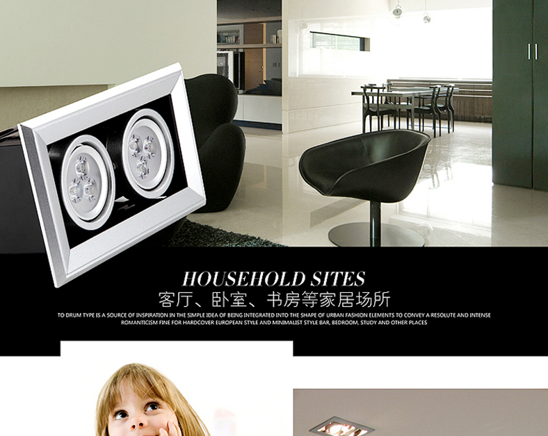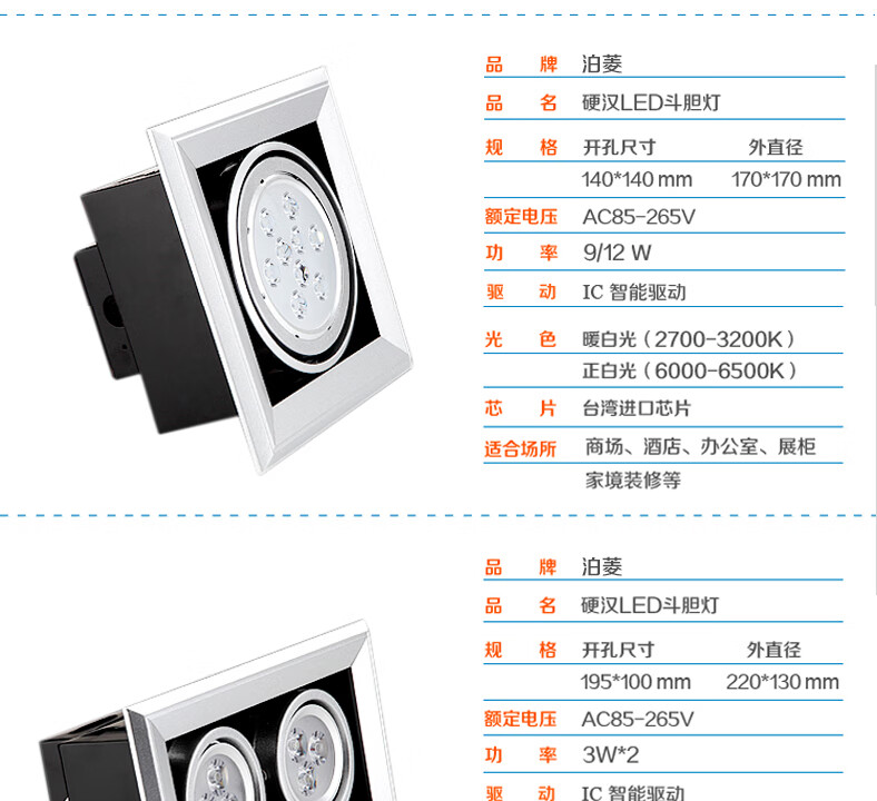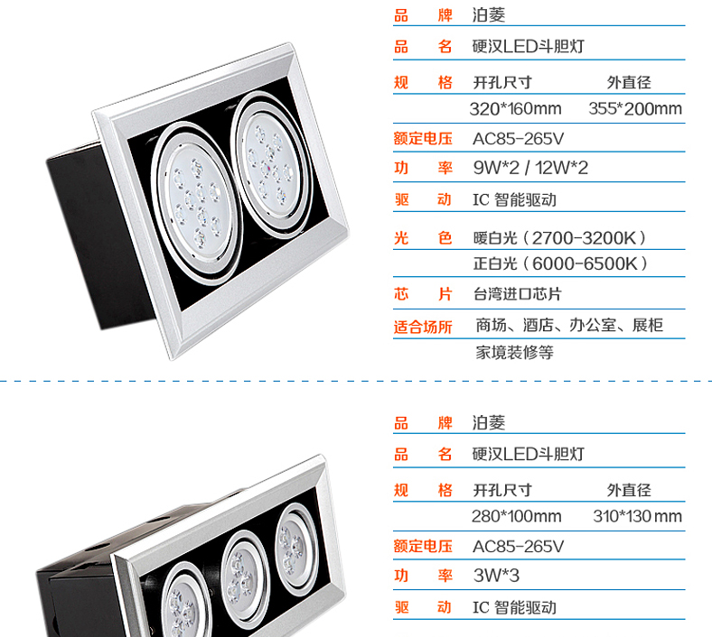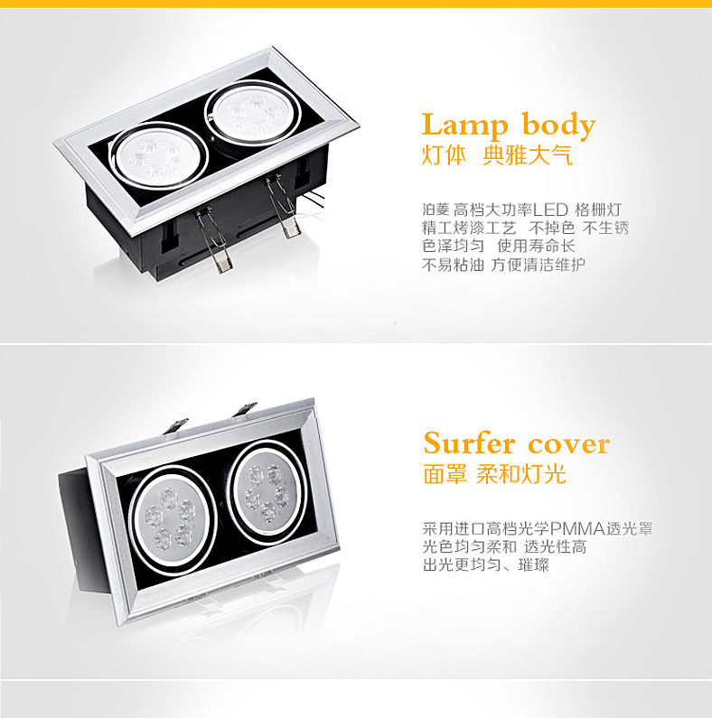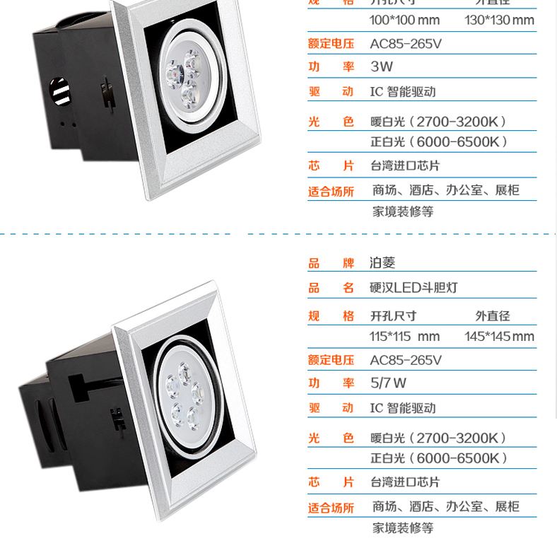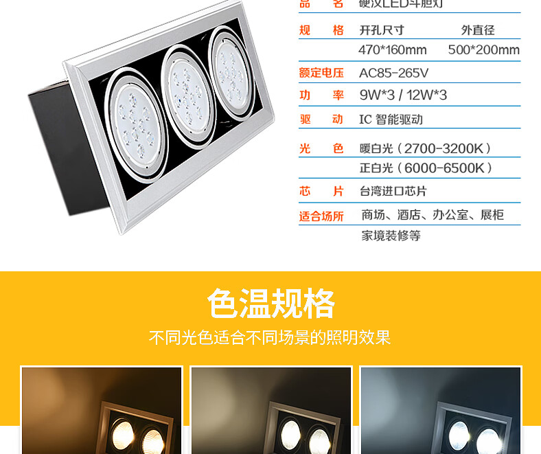 Boling led bold light spotlight single head two heads three heads 5w7W12w15W black embedded opening square grille spotlight three heads 36w opening 40*14cm positive white light 6000K