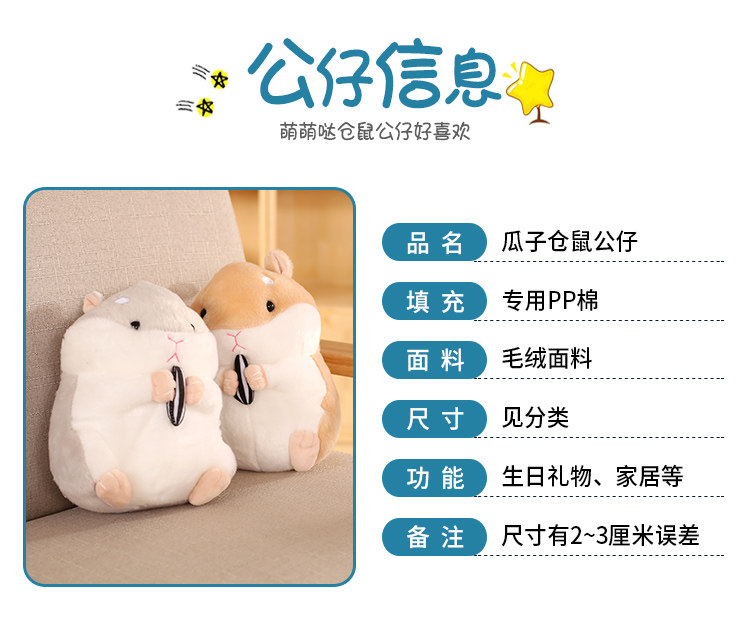 Sort by color Off white,Pink,blue,Light brown,grey,Hamster holding melon seeds (random color),Gray (gift box + string lights),Pink (gift box + string lights),Blue (gift box + string lights),Light brown (gift box + string lights),Off-white (gift box + string lights)