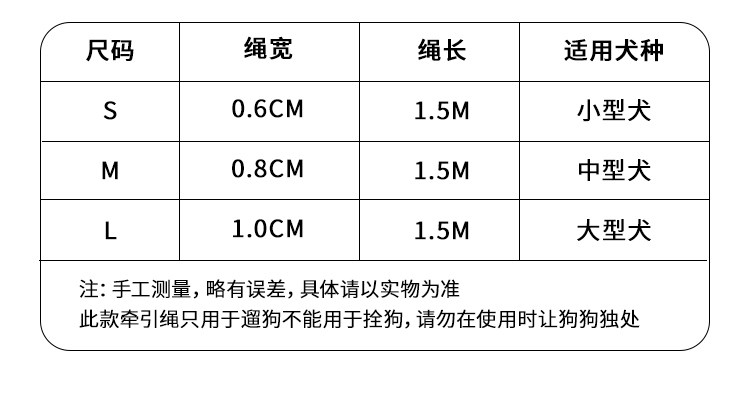 Applicable size S-diameter 0.6, length 150cm, recommended for small dogs,M-diameter 0.8, length 150cm, recommended for small and medium-sized dogs,L-diameter 1.0, length 150cm, recommended for medium and large dogs