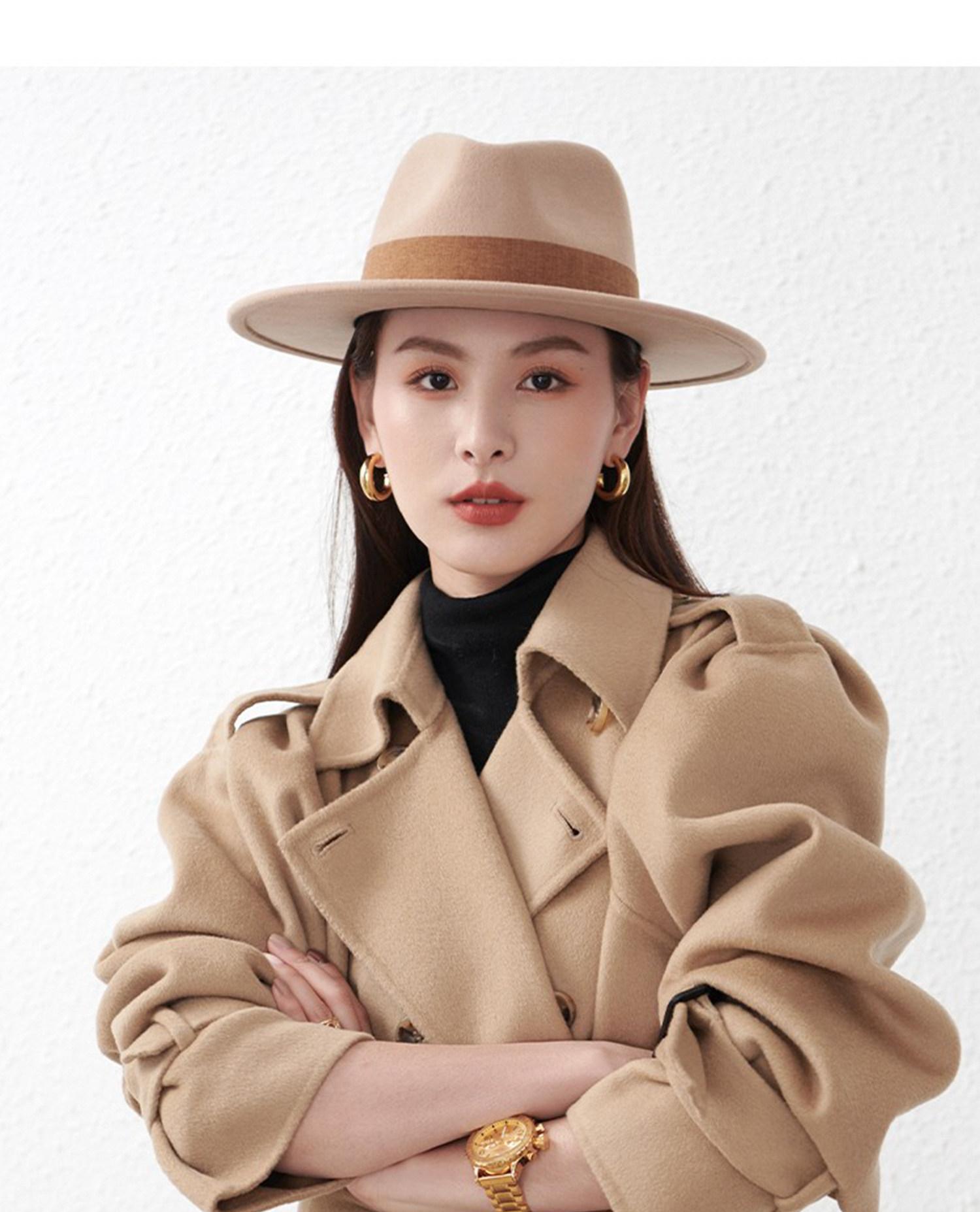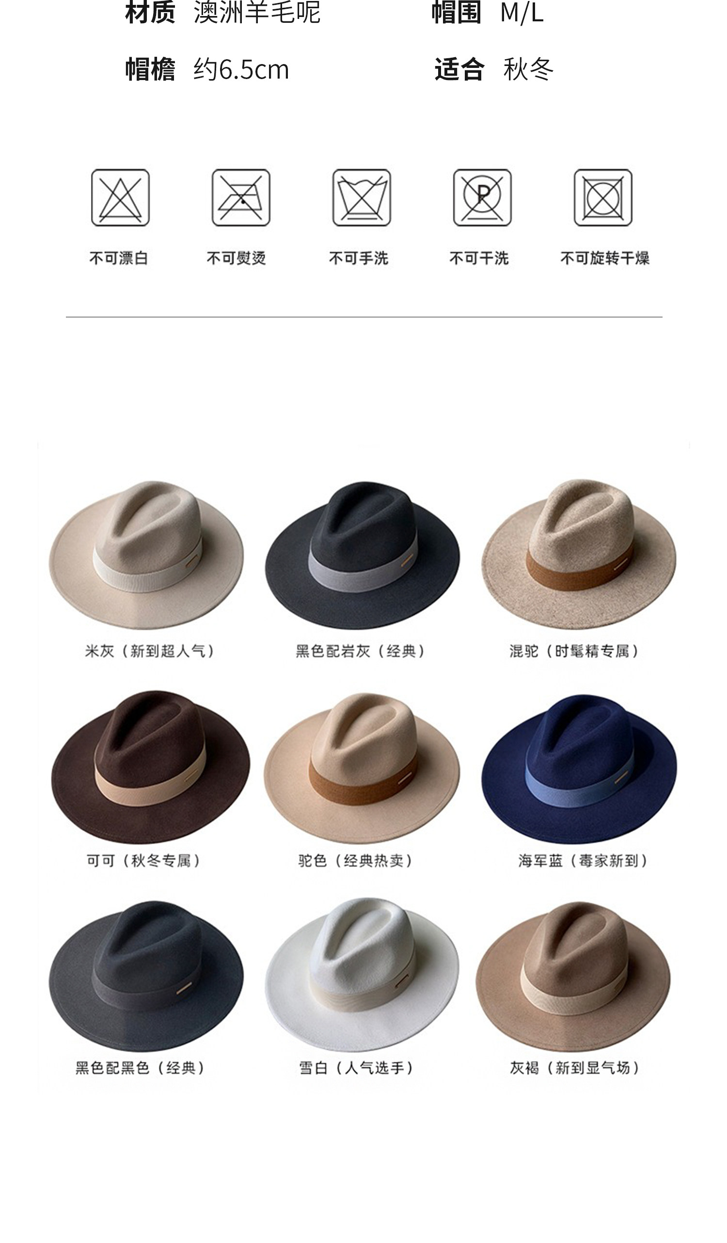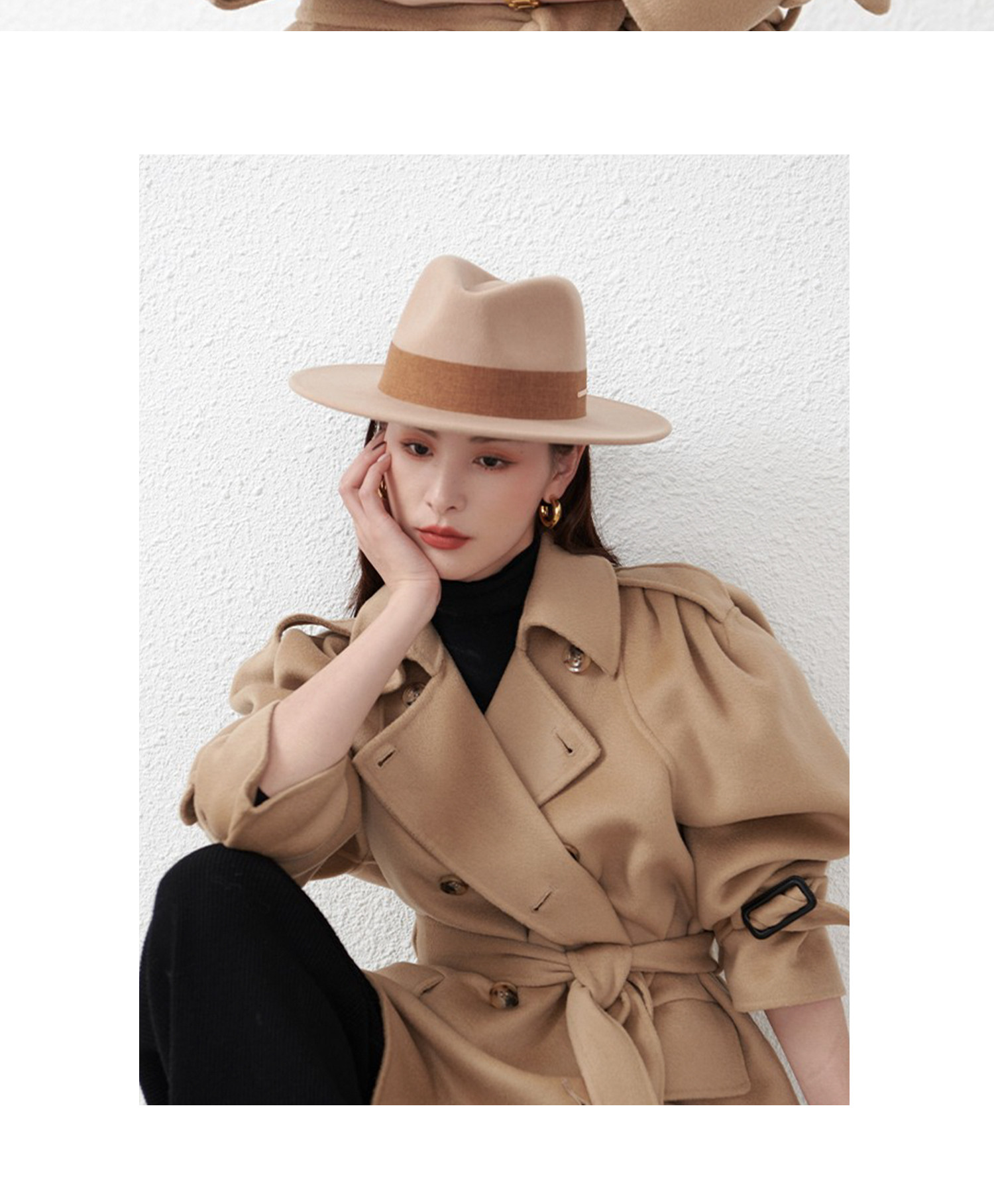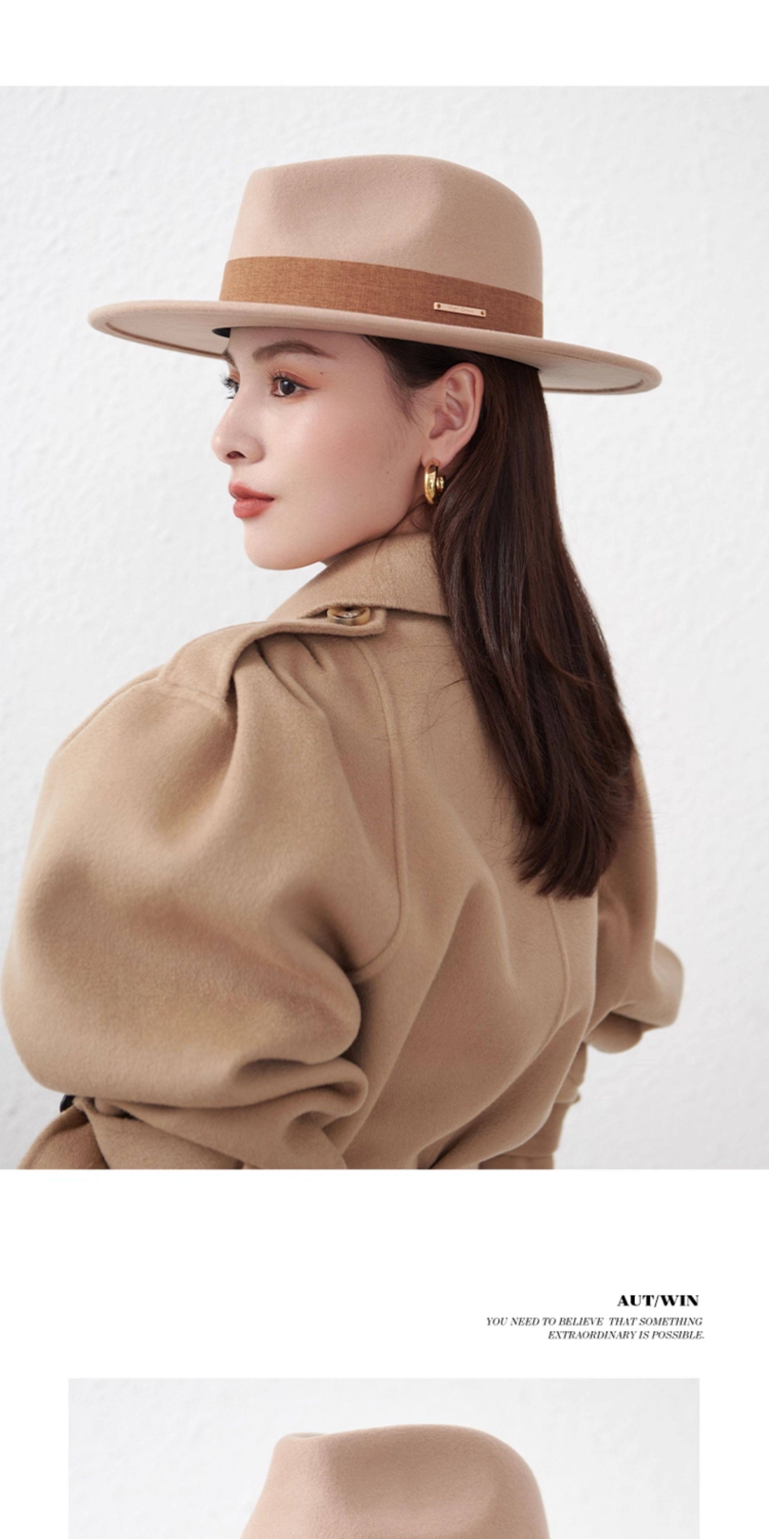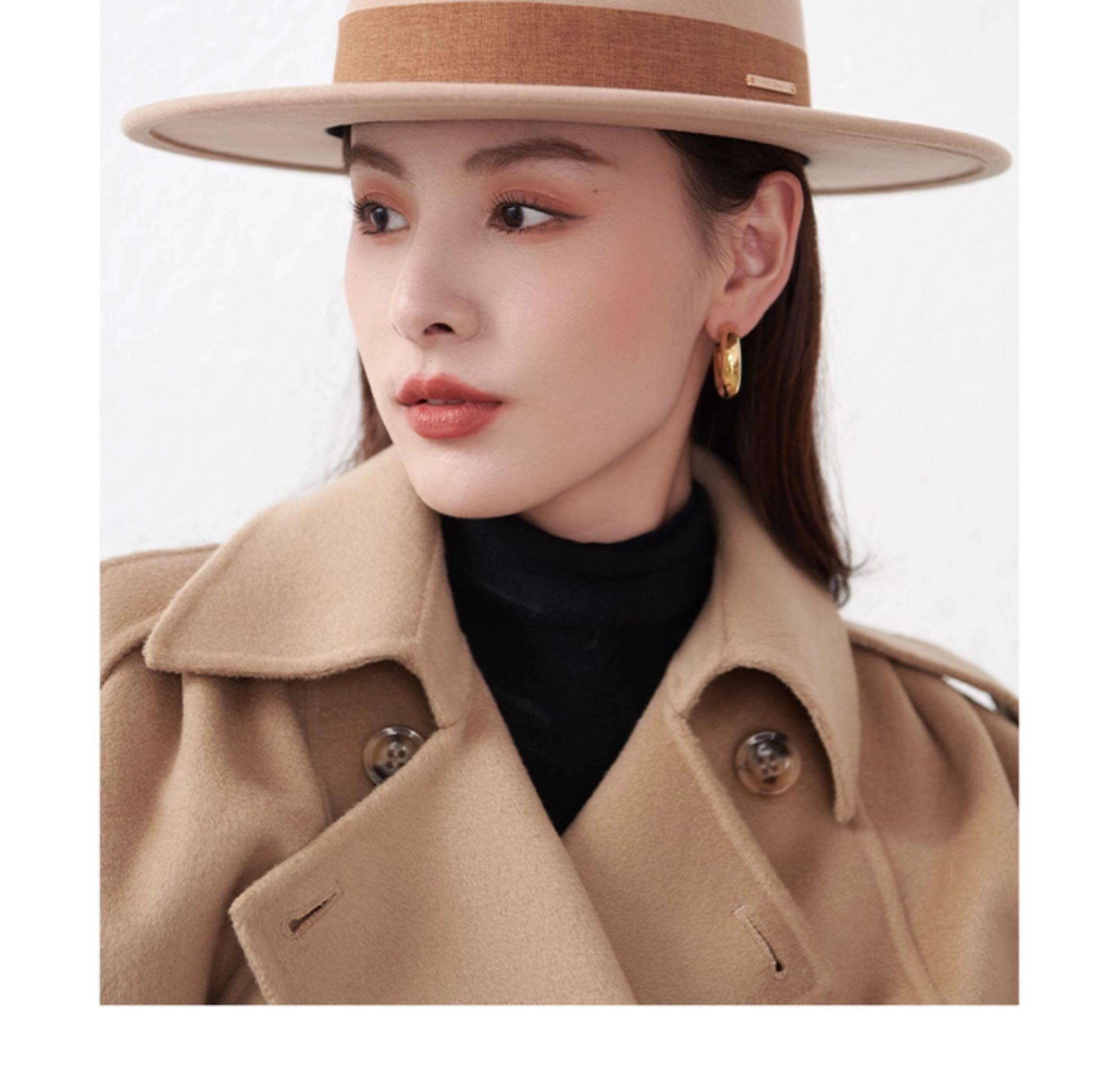 French new autumn and winter flat-brimmed woolen hat for men and women, fashionable wide-brim jazz versatile European and American large head circumference camel