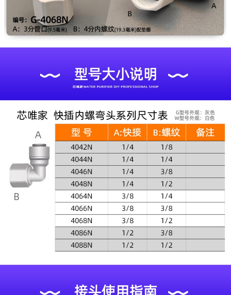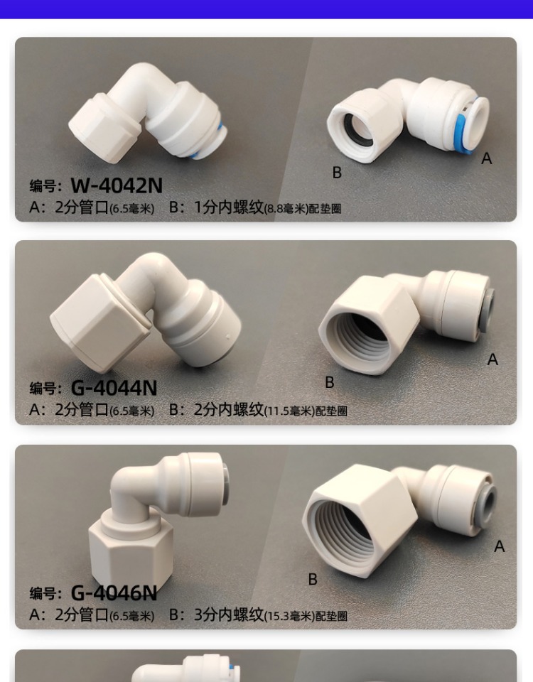 Color Classification (4040) 2-Tube to 2-Tube Bend Connection,(6040) 2-Tube to 3-Tube Bend Connection,(6060) 3-Pipe to 3-Pipe Bend Connection,(4042) 1 Minute Outer Wire to 2 Minutes Pipe Elbow,(4044) 2 Points Outer Wire to 2 Points Pipe Elbow,(4046) 3 Points Outer Wire to 2 Points Pipe Elbow,(4048) 4 Points Outer Wire to 2 Points Pipe Elbow,(4049) Combination 6 Outer Wire to 2 Elbows,(4064) 2 Points Outer Wire to 3 Points Pipe Elbow,(4066) 3 Points Outer Wire to 3 Points Pipe Elbow,(4068) 4 Points Outer Wire to 3 Points Pipe Elbow,(4044N) 1/4" Male to 1/4" Female Elbow with Gasket,(4046N) 2-Point to 3-Point Inner Wire Elbow with Gasket,(4048N) 2-Point Pipe to 4-Point Inner Wire Elbow with Gasket,(4049N) 6 Points Internal Thread to 2 Points Pipe Elbow + Washer,(4064N) 3-Point Pipe to 2-Point Inner Wire Elbow with Gasket,(4066N) 3-Point Pipe to 3-Point Inner Wire Elbow with Gasket,(4068N) 3-Point Pipe to 4-Point Inner Wire Elbow with Gasket,(4069N) 6 Points Internal Thread to 3 Points Pipe Elbow + Washer,(4049N) Combination 6 Inner Turn 2 Elbow Rotatable + Washer,(4069N) Combination 6 Inner Turn 3 Elbow Rotatable + Washer