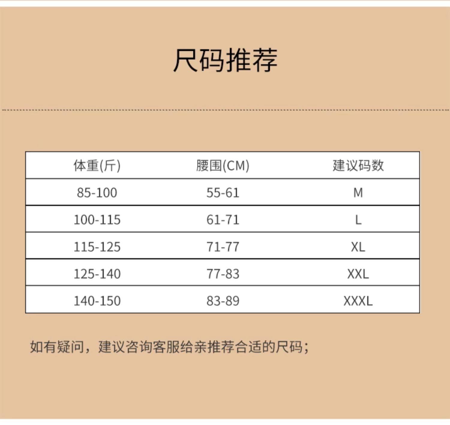 尺码 M(85-100斤),L(100-115斤),XL(115-125斤),XXL(125-140斤),XXXL(140-150斤)