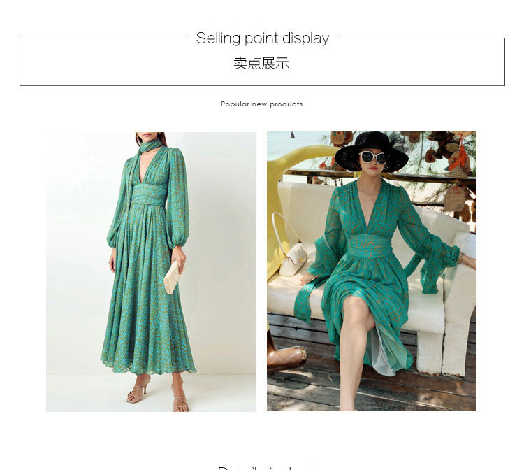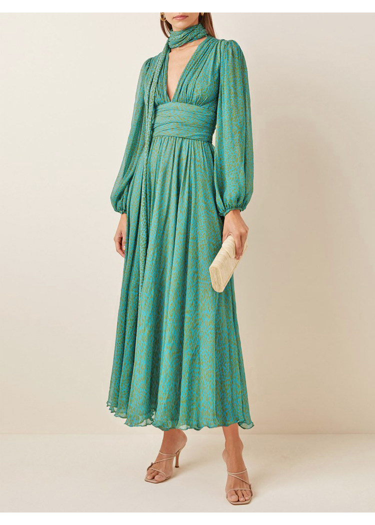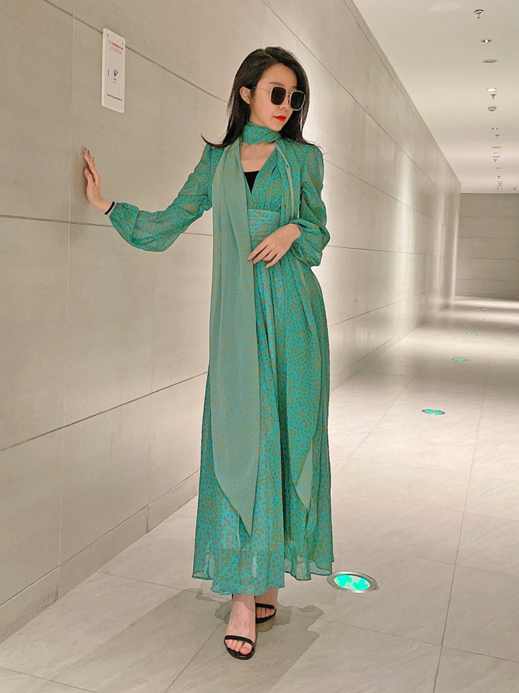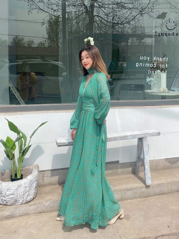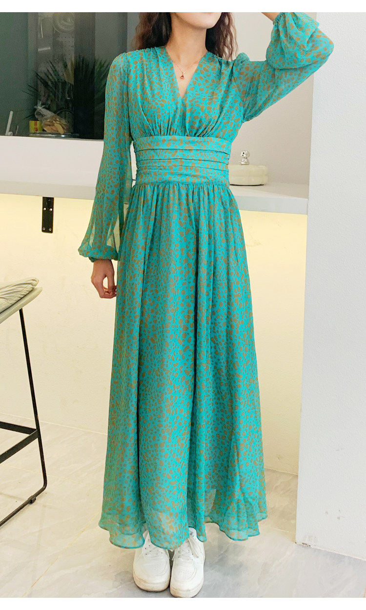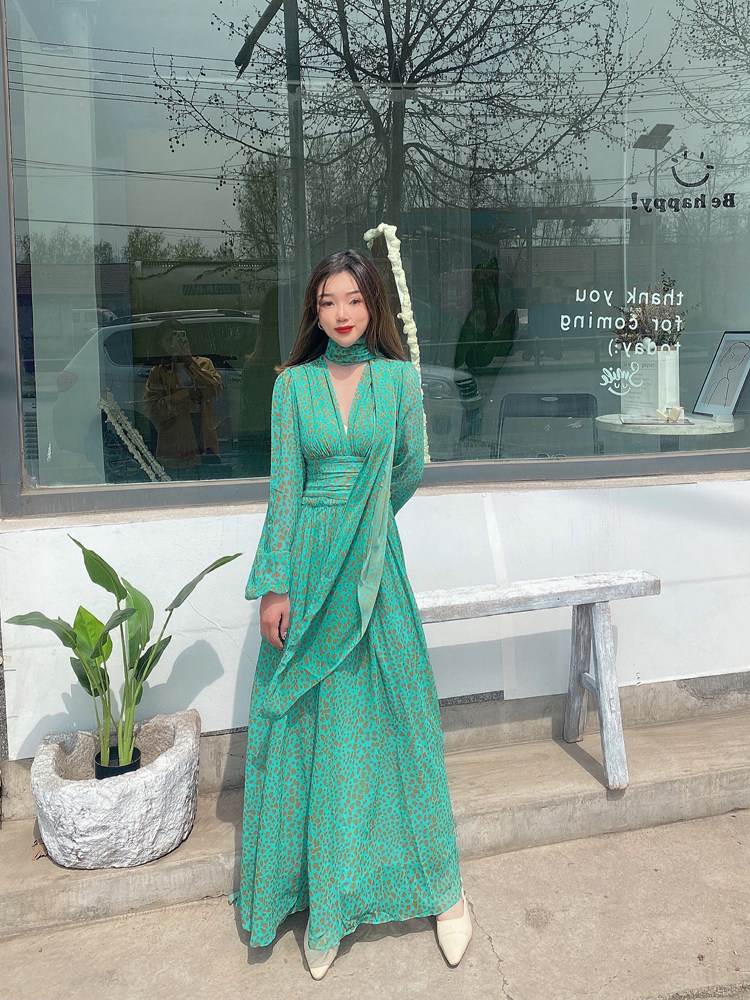 French retro green long-sleeved dress, high-end chiffon skirt, temperament v-neck waist slimming long skirt 2023 autumn