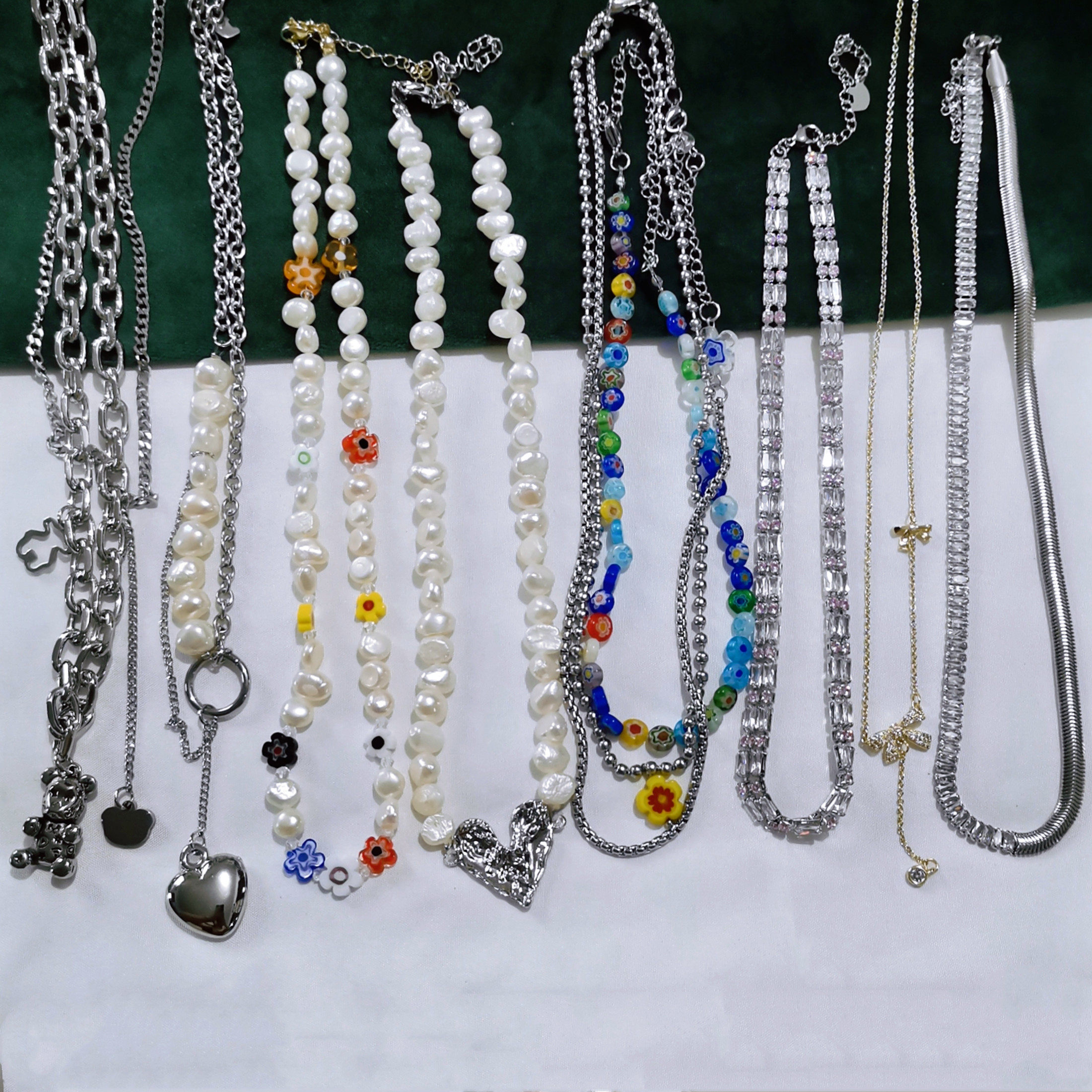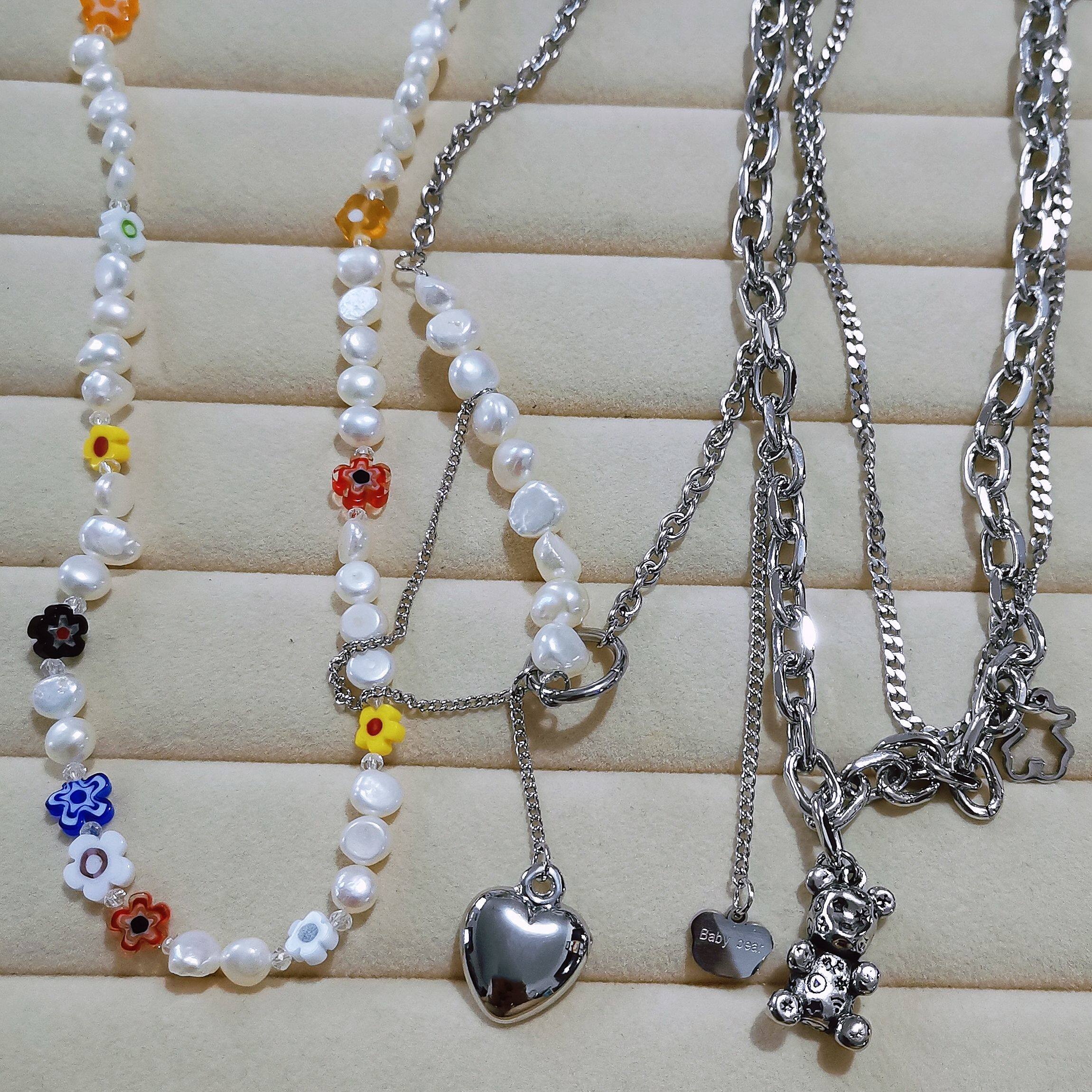 Trendy dopamine freshwater pearl metal care bear flower sweater necklace clavicle chain necklace 245