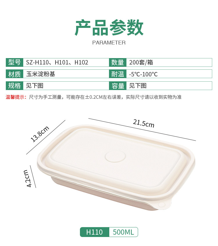 Sort by color 500ml corn starch square box 200 sets H110,750ml corn starch square box 200 sets H101,1000ml corn starch square box 200 sets H102