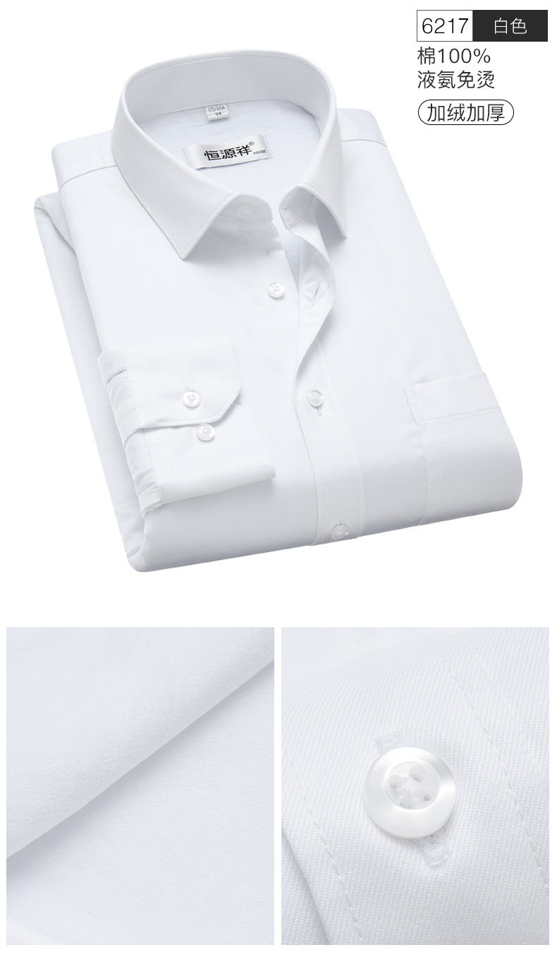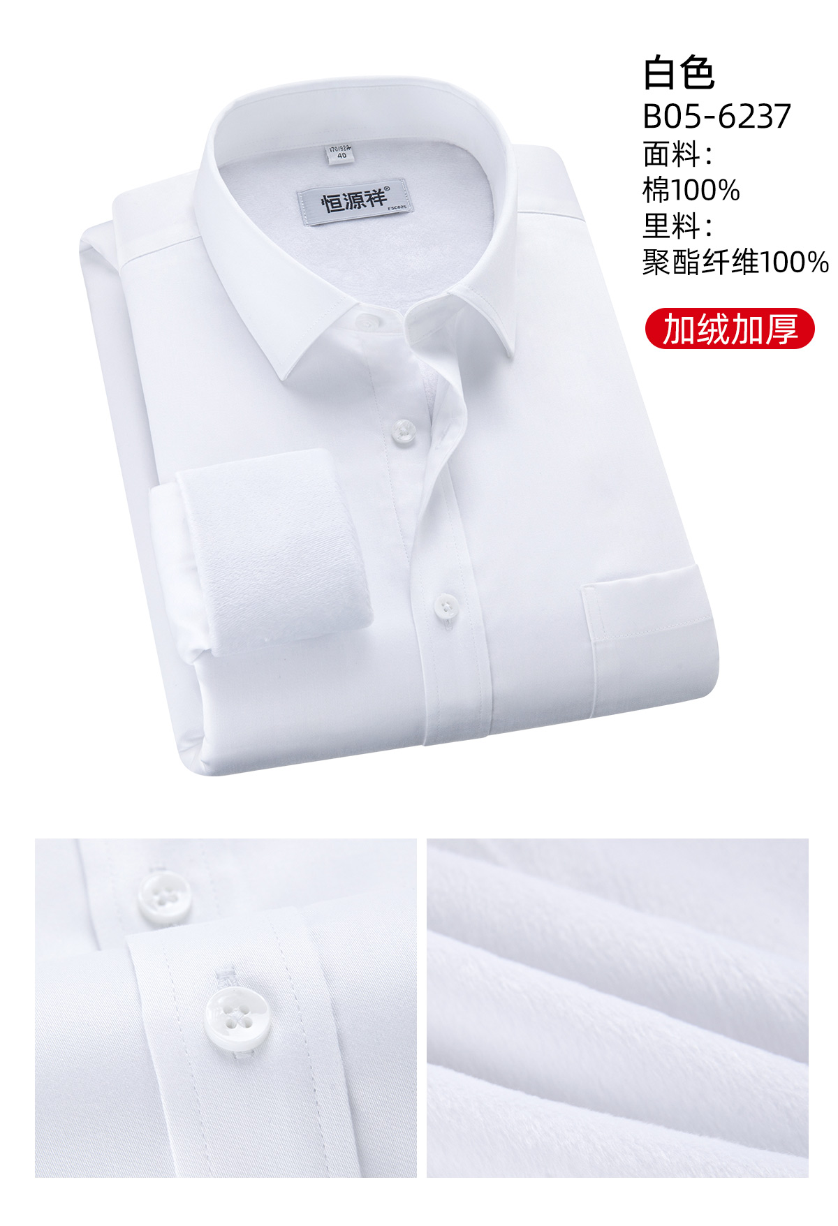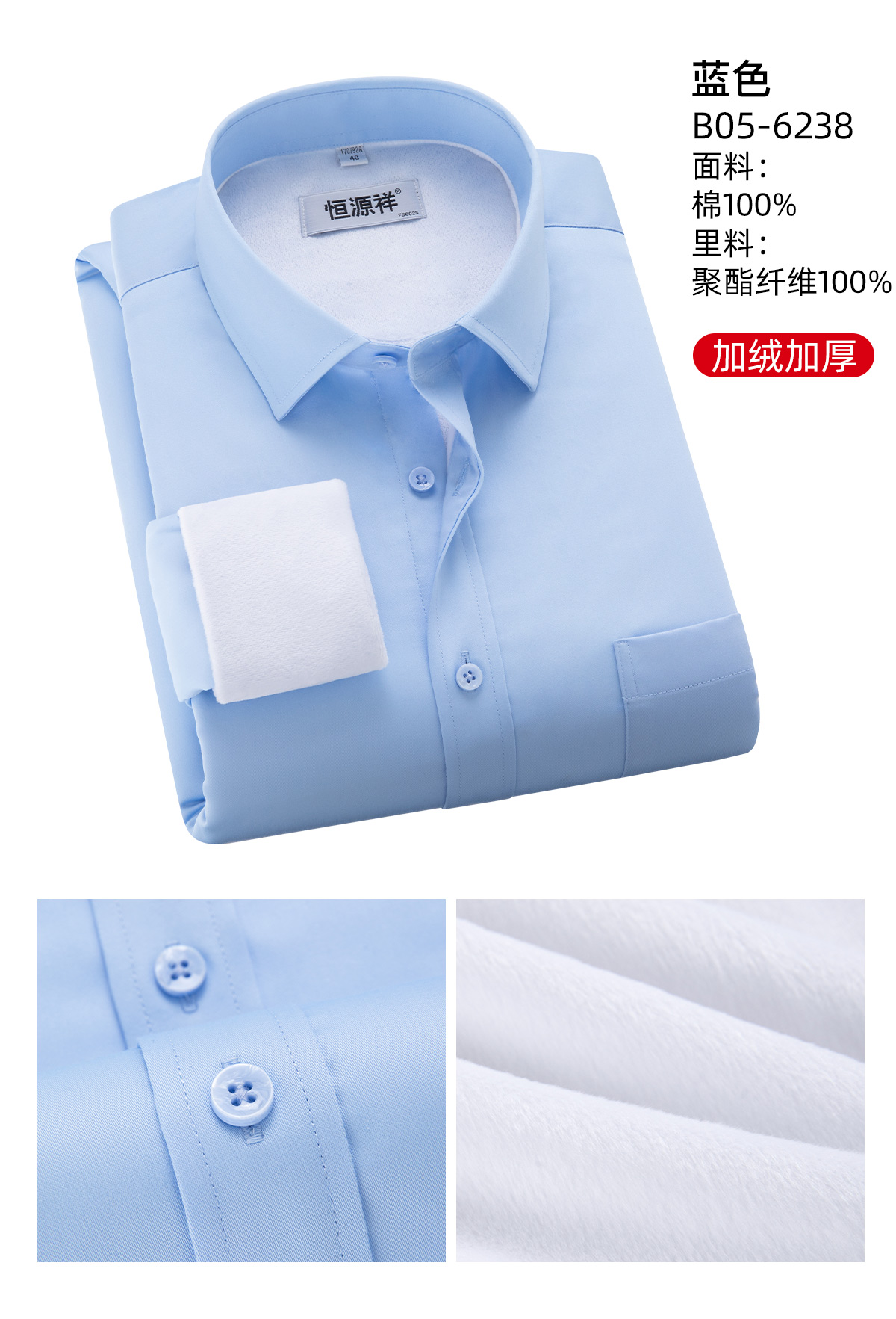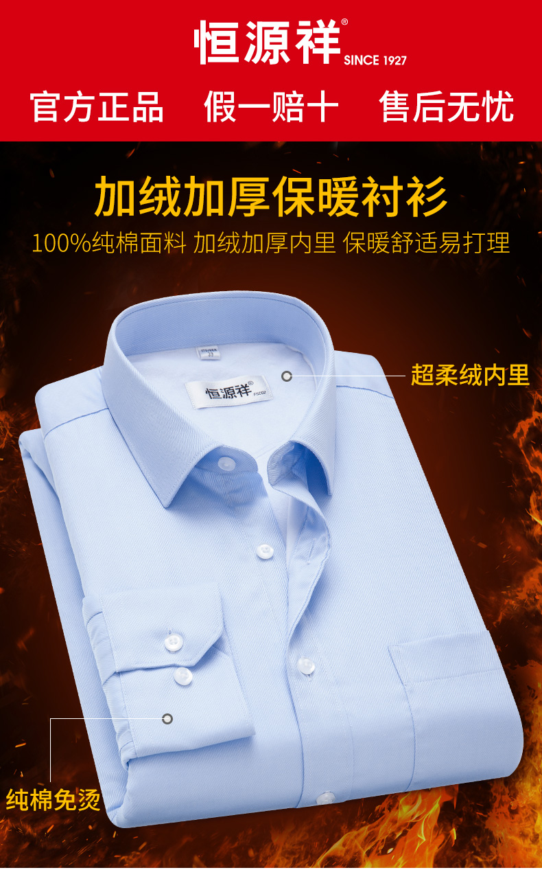 Hengyuanxiang Pure Cotton Non-Iron Fleece-Lined Shirt for Men, Thickened Winter Blue Business Formal Wear, Men's Long-Sleeved Warm White Shirt