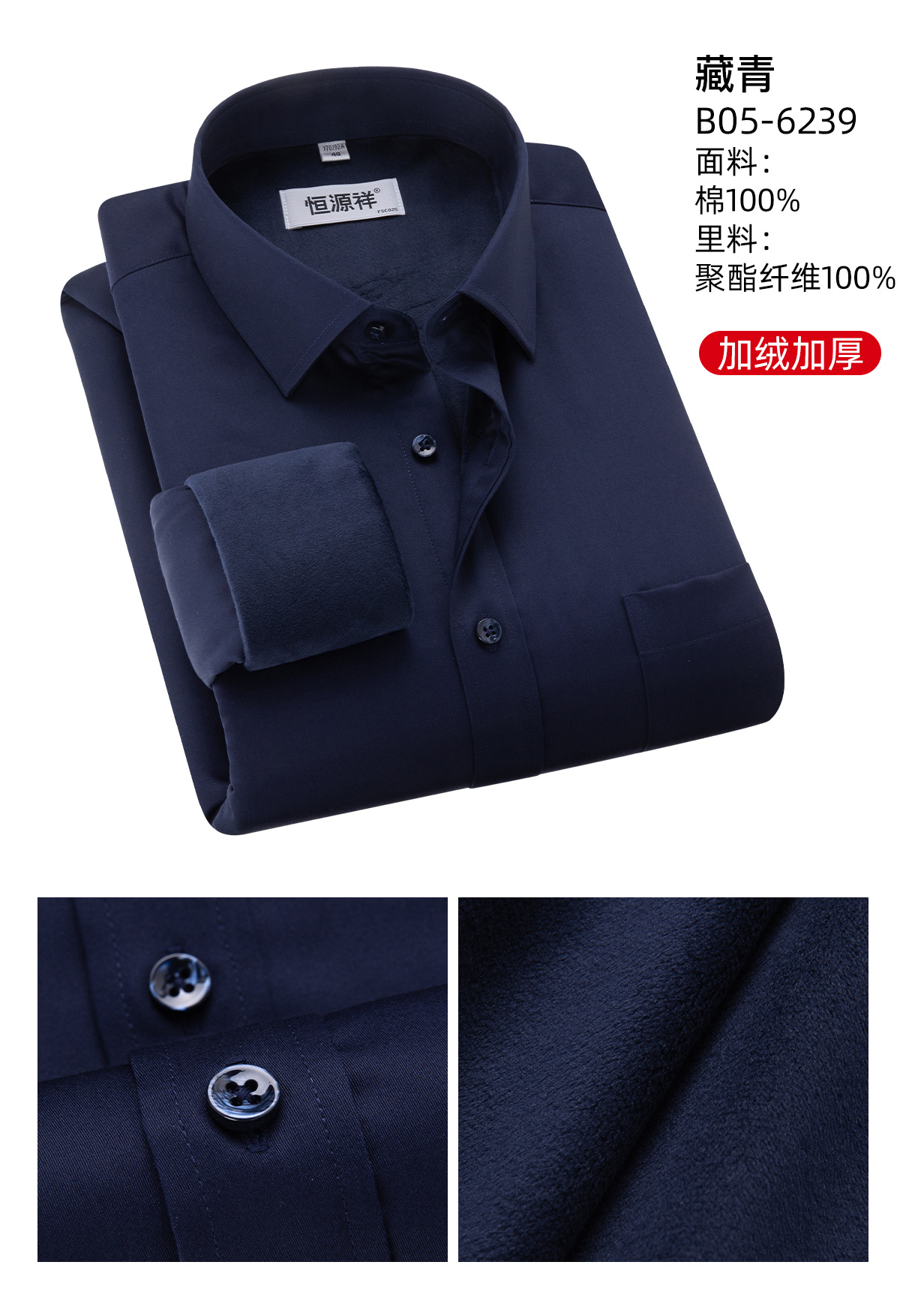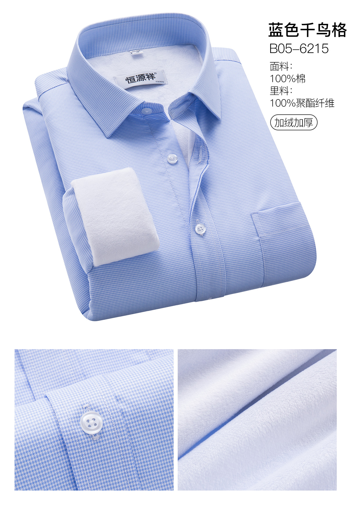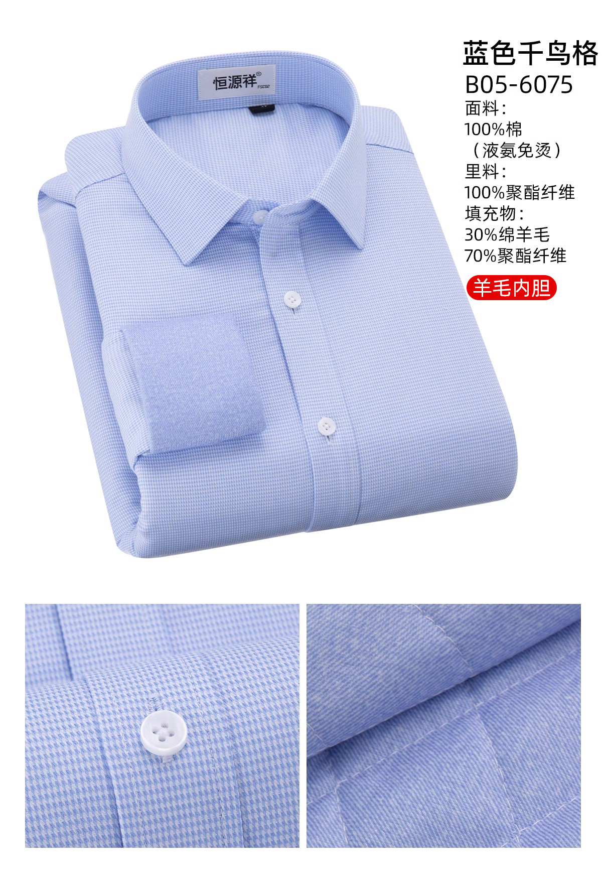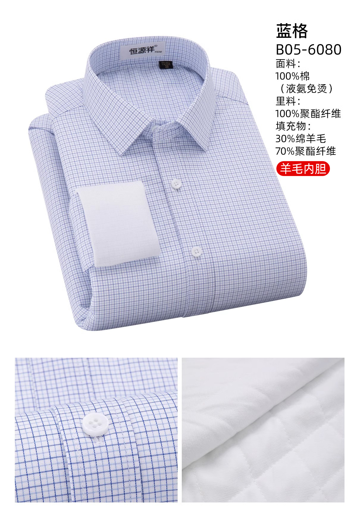 Hengyuanxiang Pure Cotton Non-Iron Fleece-Lined Shirt for Men, Thickened Winter Blue Business Formal Wear, Men's Long-Sleeved Warm White Shirt