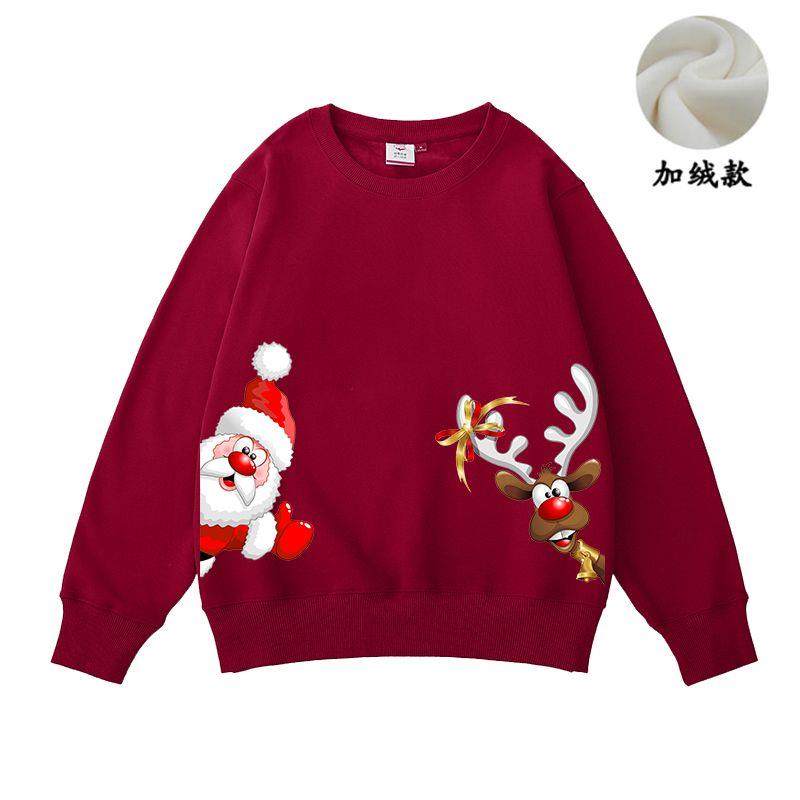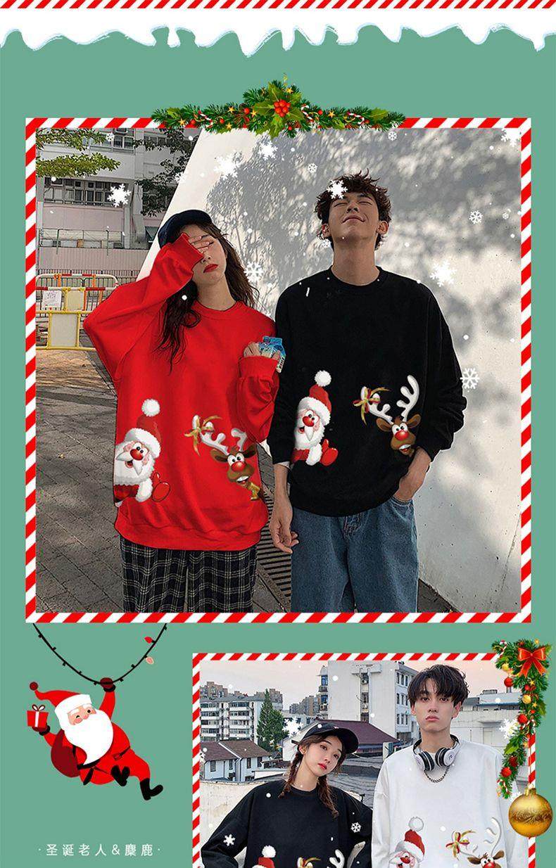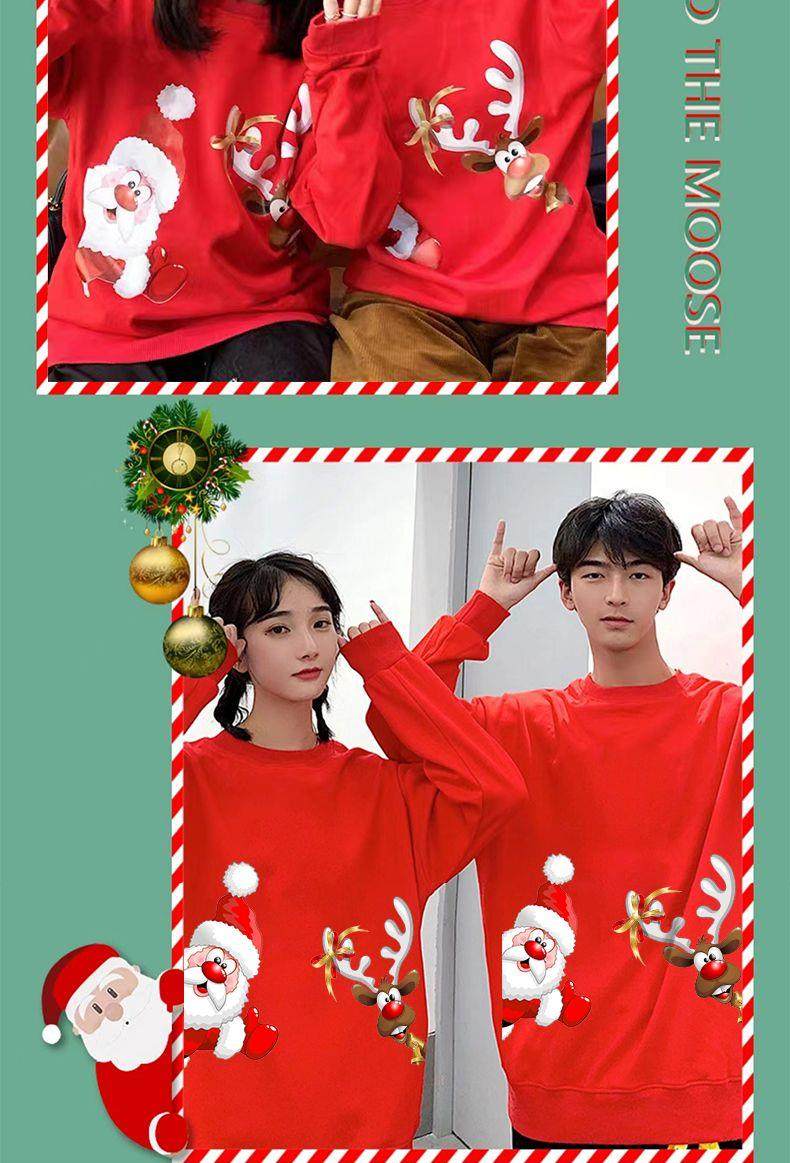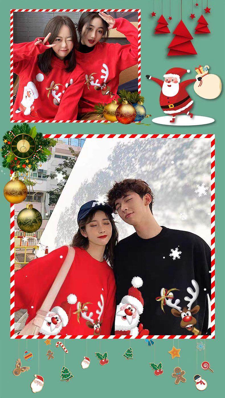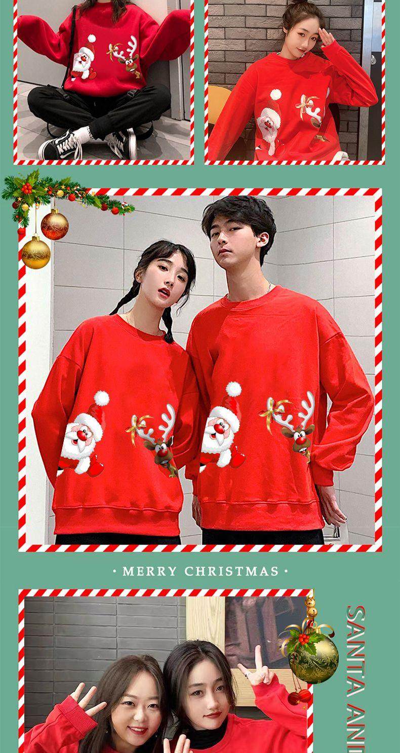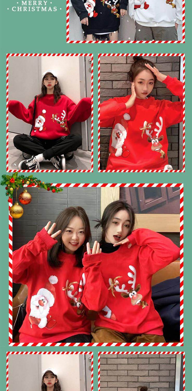 New christmas couple sweatshirt autumn and winter new loose plus velvet burgundy round neck printed elk set trendy