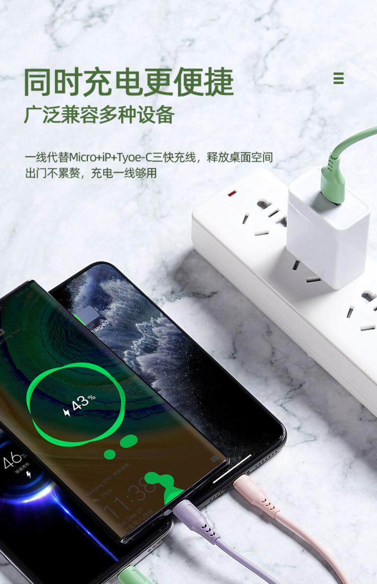 Data cable three-in-one charging cable one-to-three fast charging flash charging liquid soft glue three-head multi-function device car multi-head apple android type-c mobile phone type-c suitable for huawei xiaomi vivo