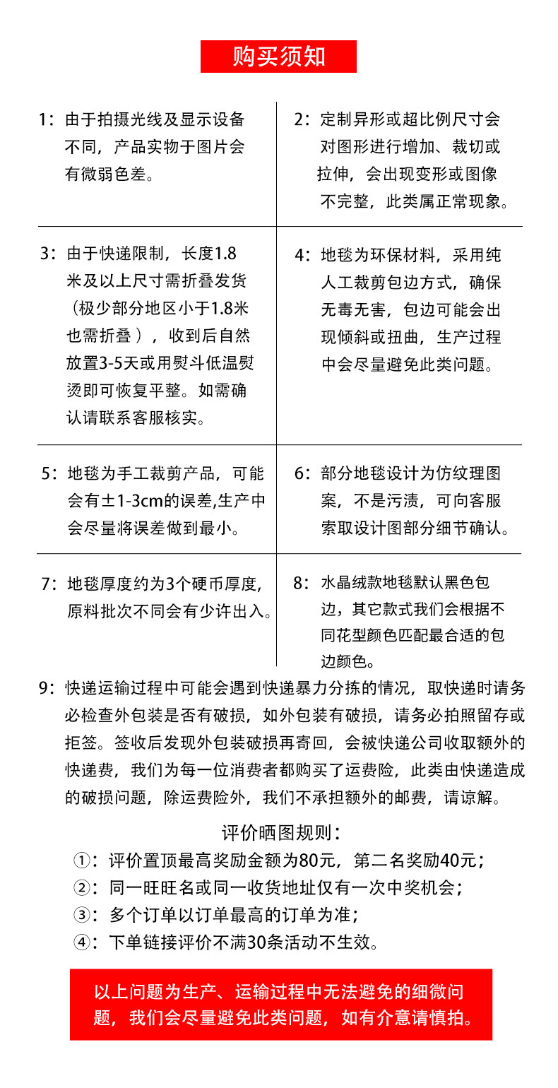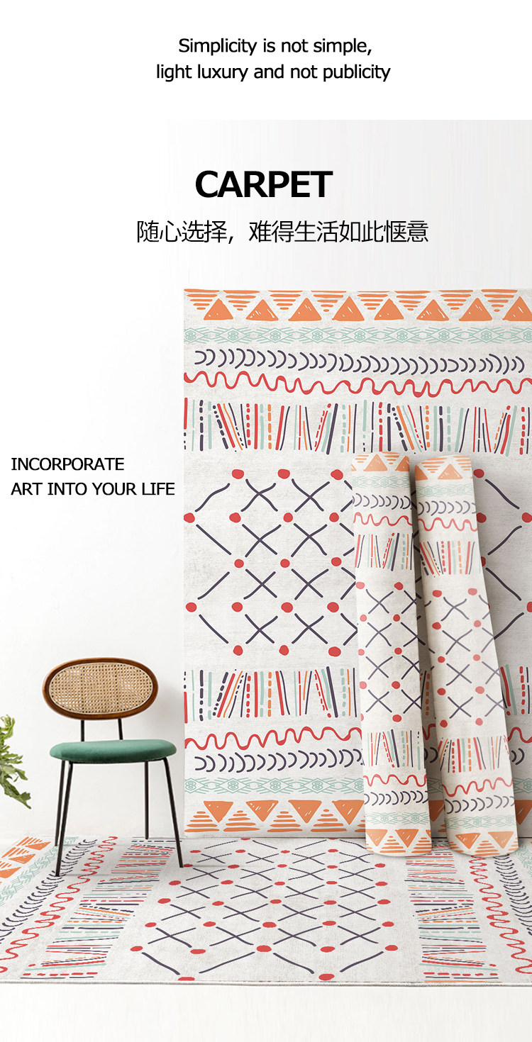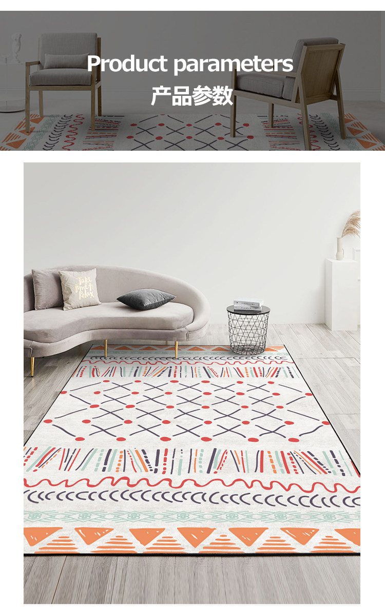 Carpet size 40x60cm (mite-free process),50x80cm (environmentally friendly and odorless),60x120cm (no lint or color fading),80x120cm (limited loss),80x160cm (suitable for bedside bay window),80x200cm (suitable for bedside),100x160cm (characteristic ethnic style),100x200cm (generous and versatile),120x160cm (nine colors optional),120x200cm (artwork on the ground),140x200cm (suitable for small living room),150x200cm (suitable for small living room),160x230cm (suitable for medium living room),180x200cm (suitable for medium living room),180x250cm (suitable for larger living rooms),200x300cm (suitable for larger living rooms),Custom size contact customer service