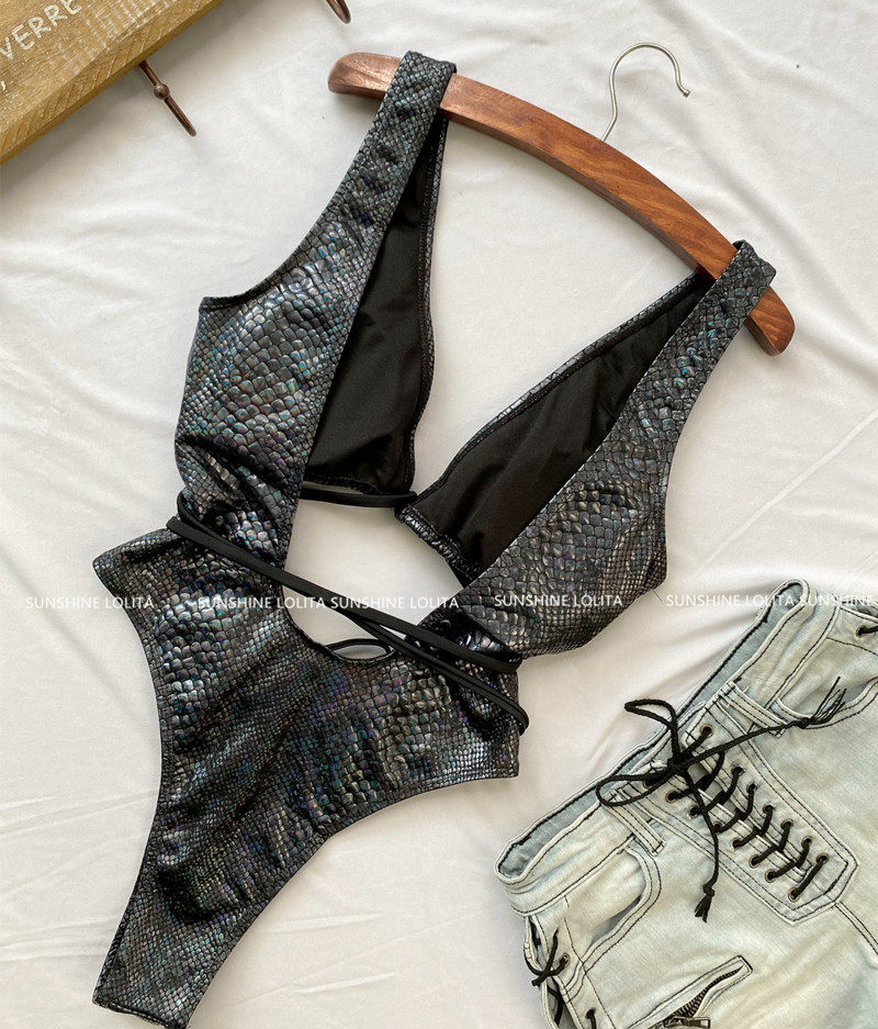 Ins style European and American big-breasted sexy crocodile pattern one-piece deep V high-cut bikini U-shaped backless slim vacation swimsuit