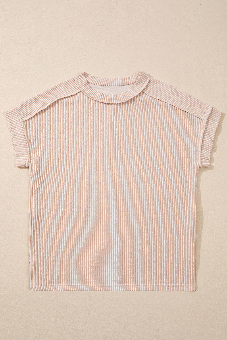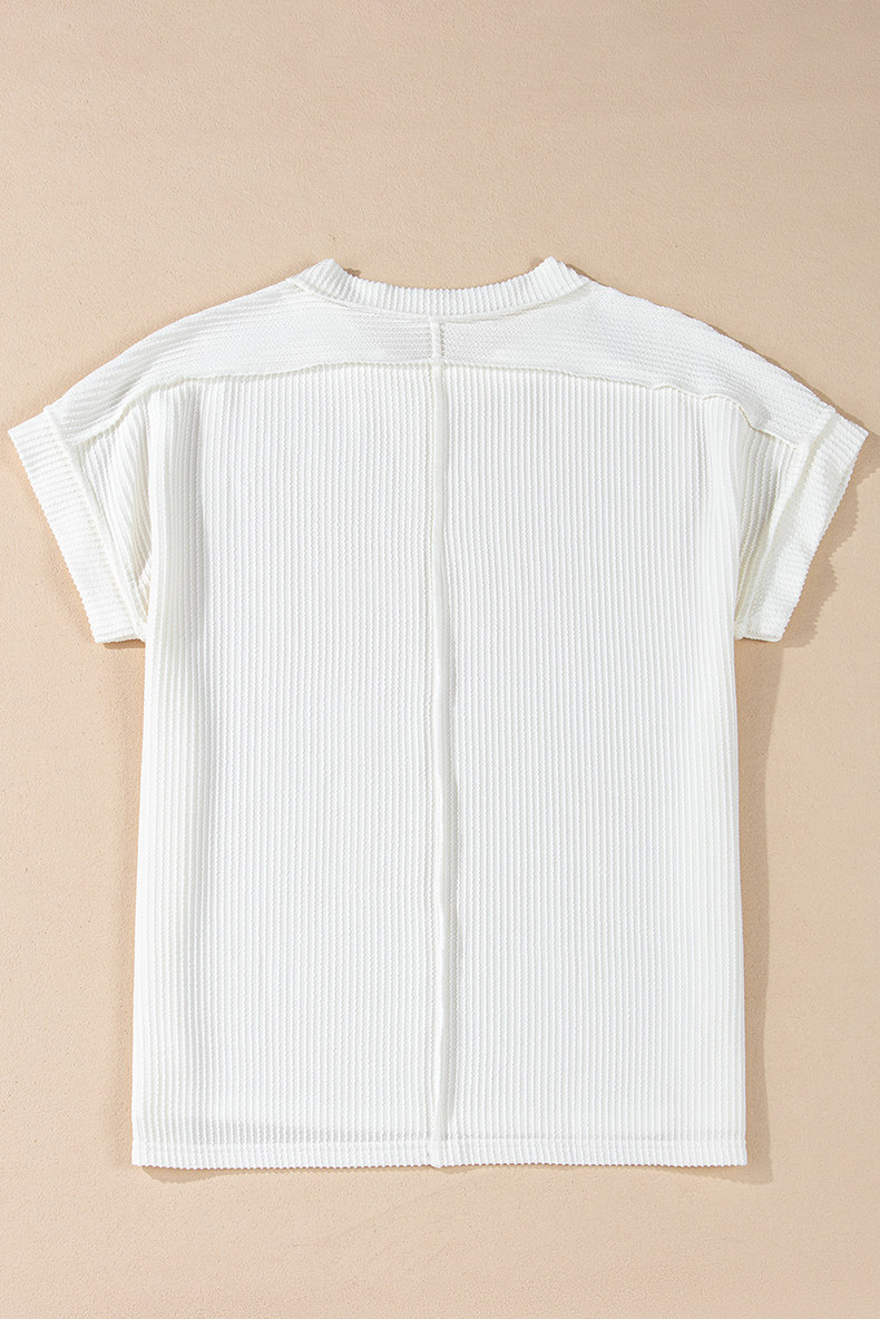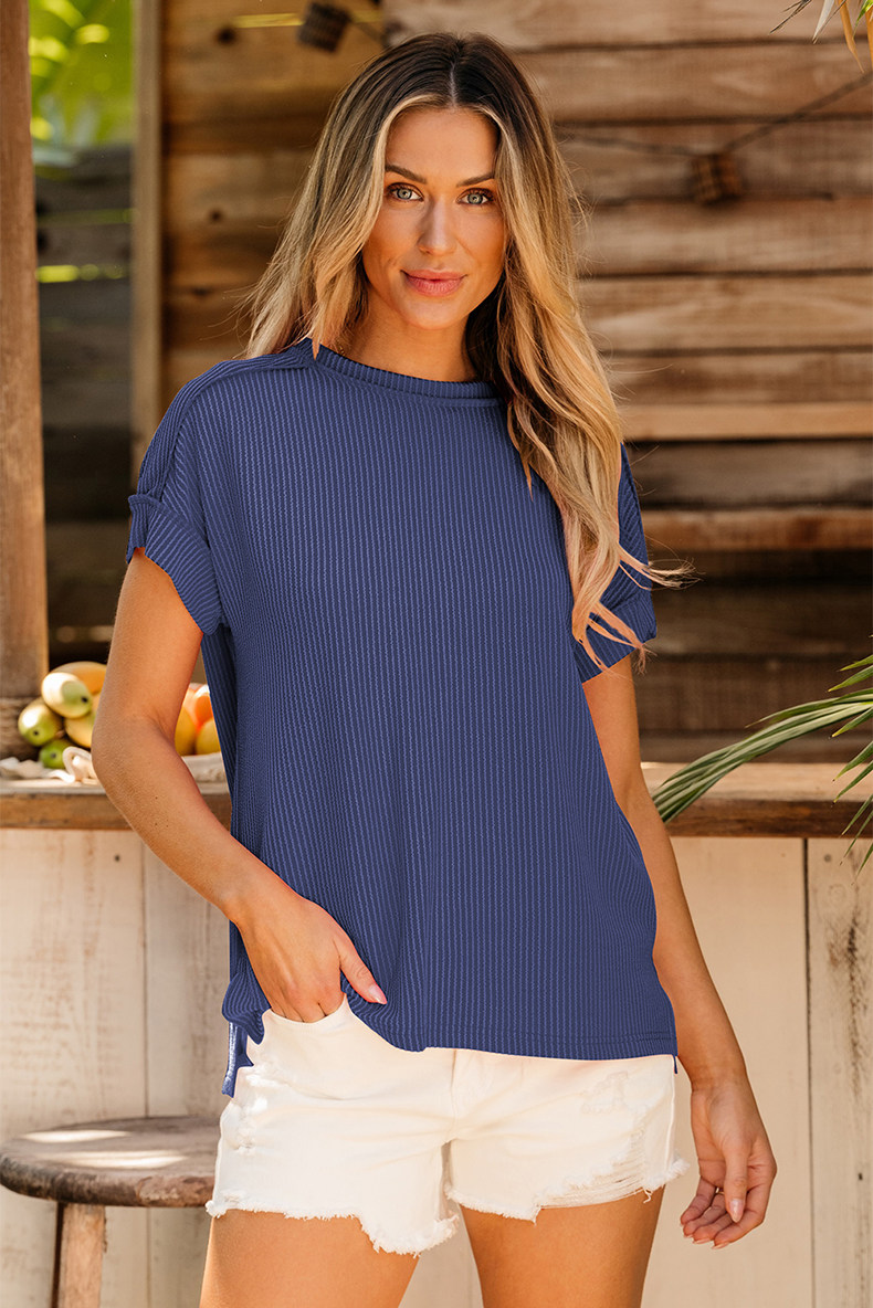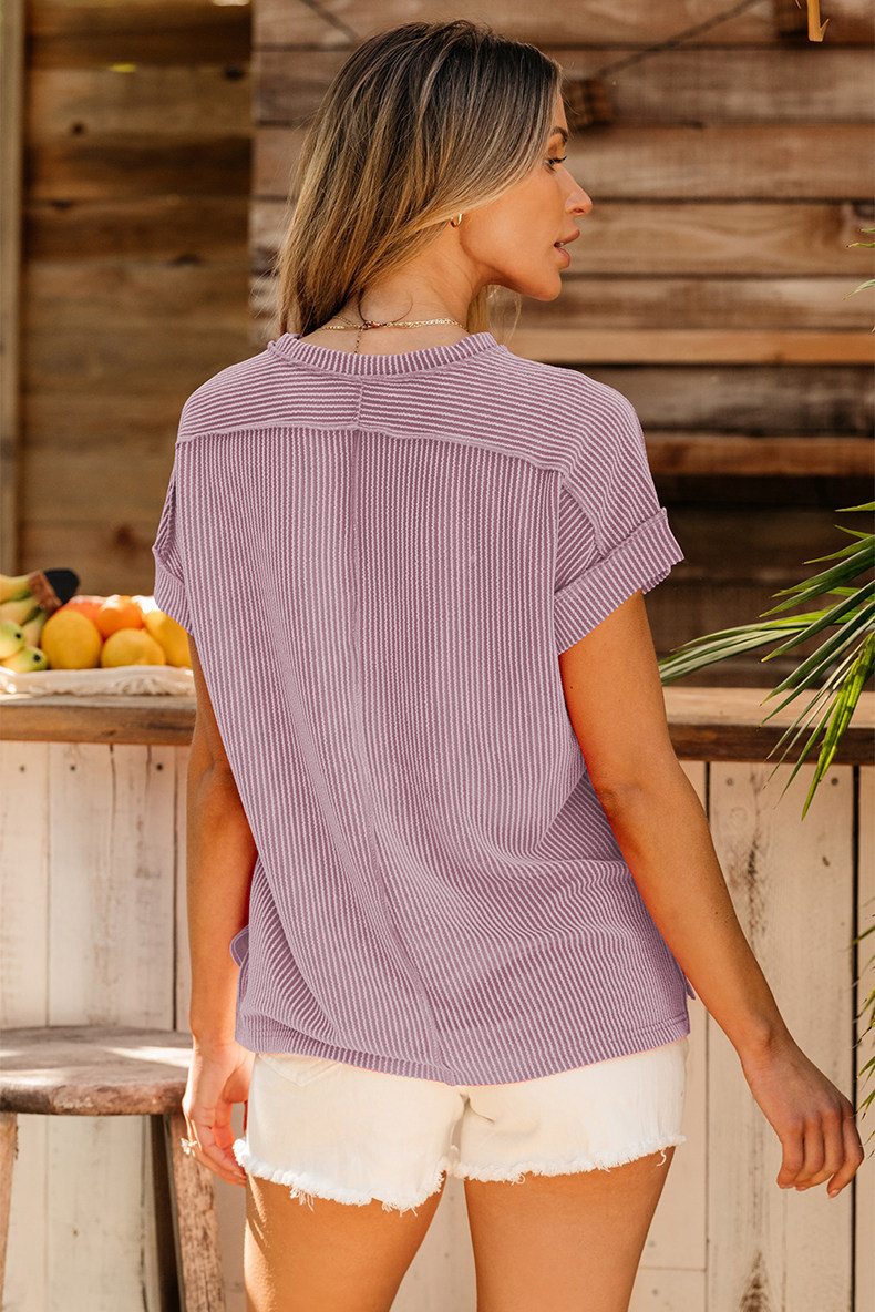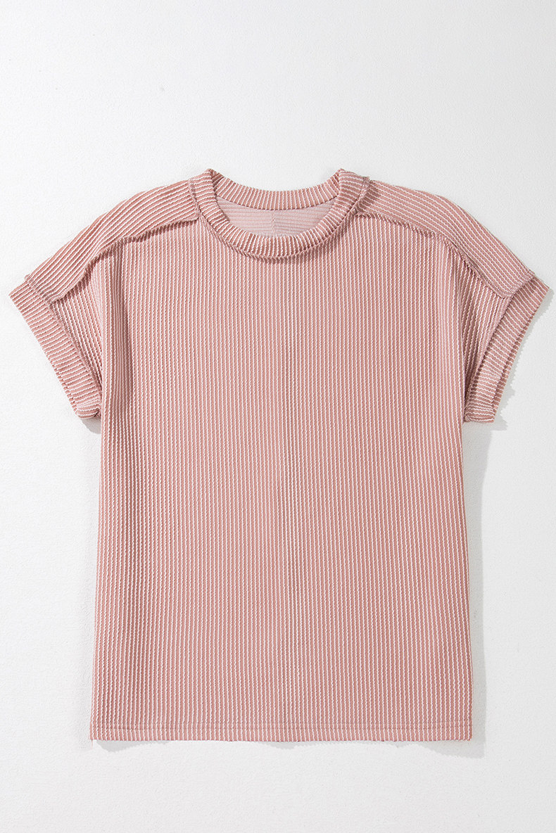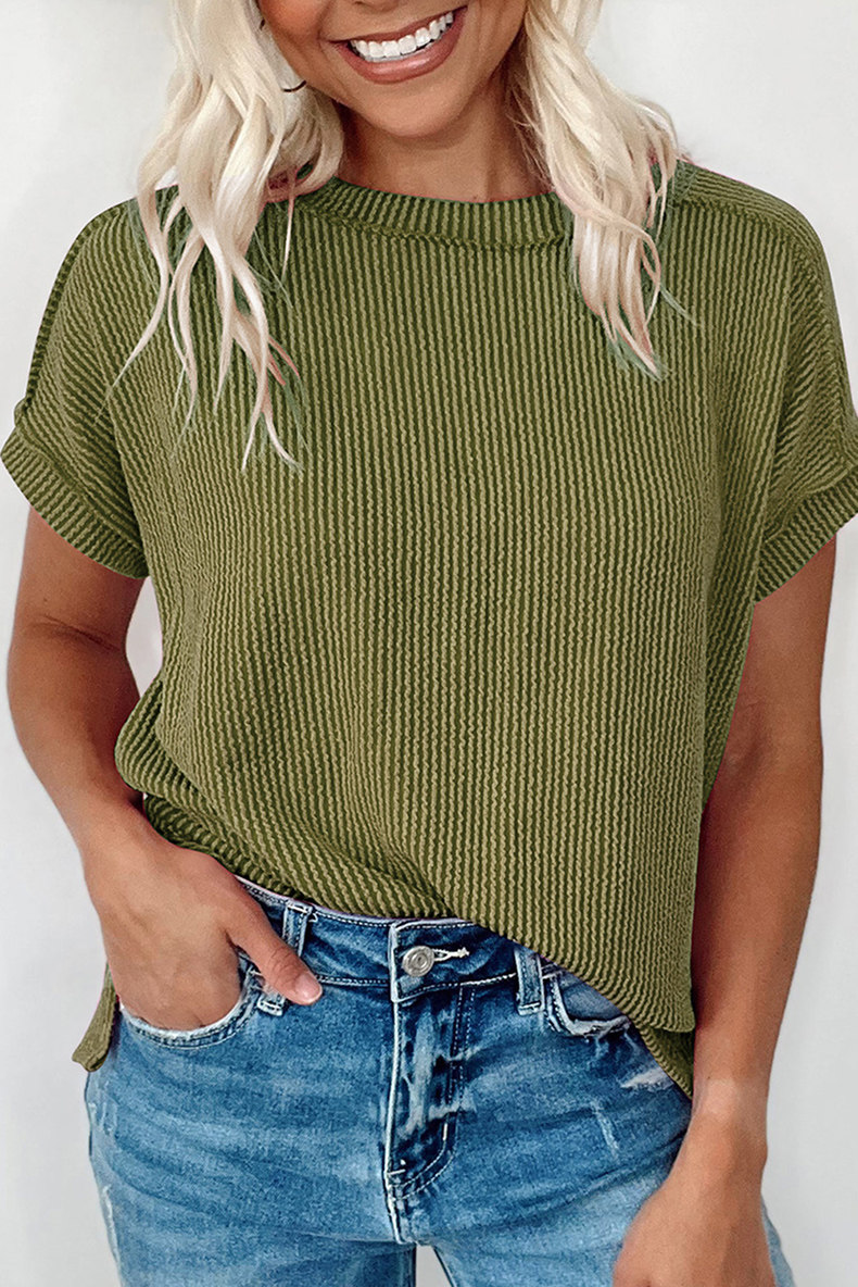 Европейская и американская повседневная свободная и универсальная женская футболка с круглым вырезом и короткими рукавами, лето 2025, новый однотонный текстурированный вязаный пуловер