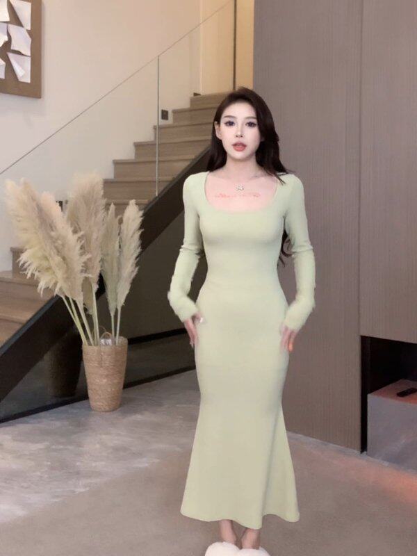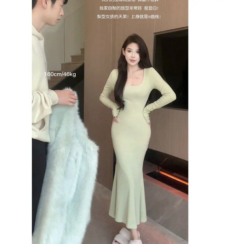 Mermaid dress long sleeve square neck fishtail long dress autumn and winter hot girl style sexy tight slimming hip dress with inner layer