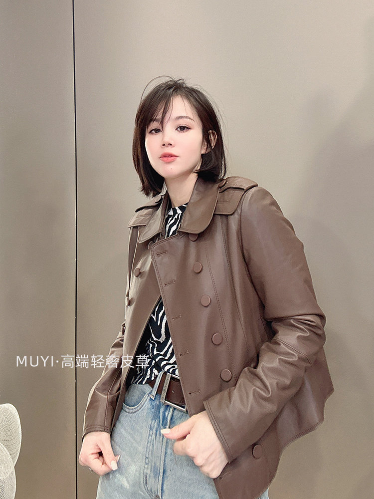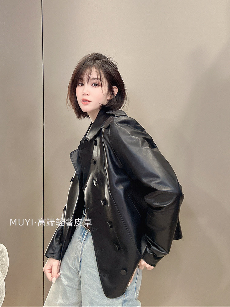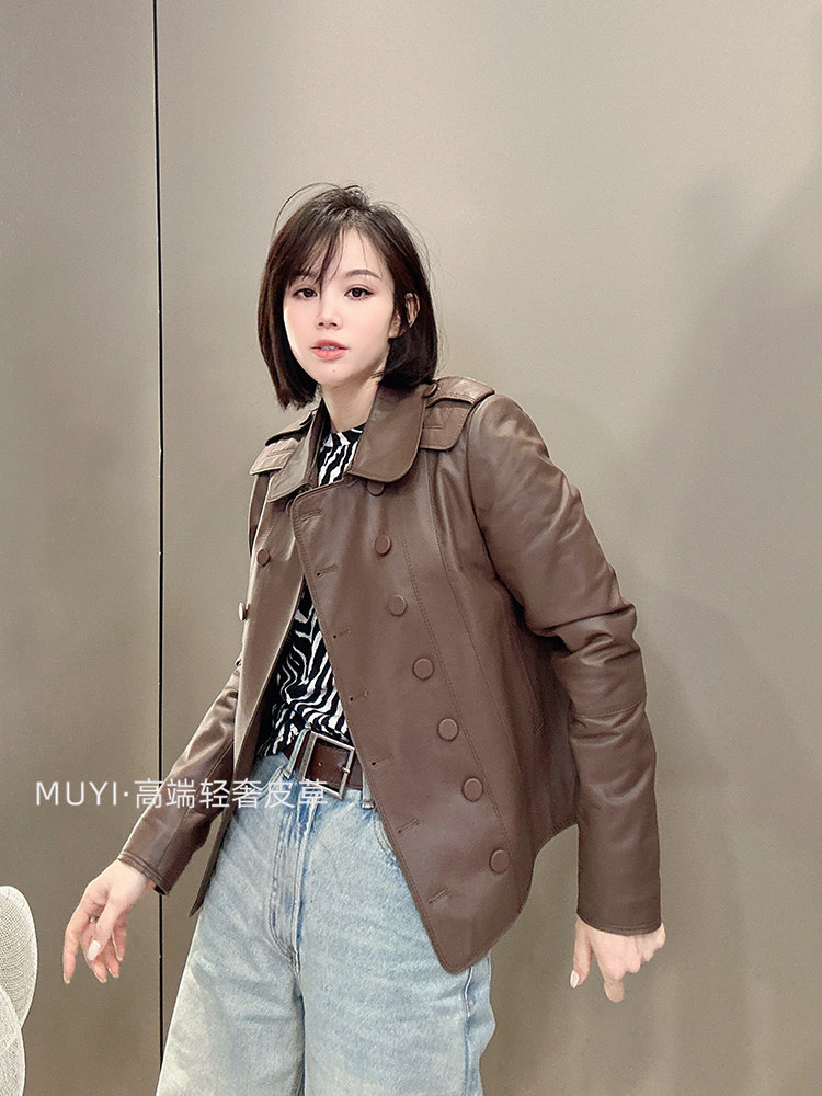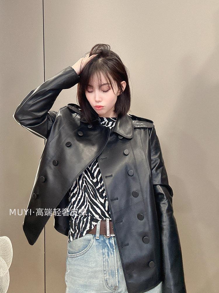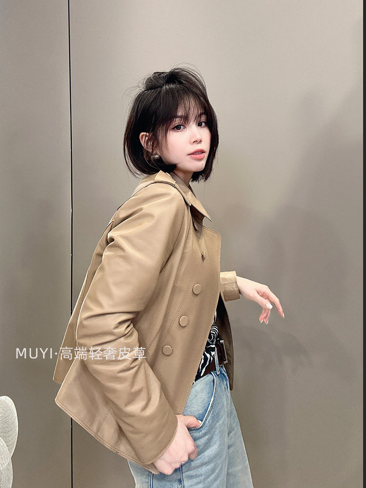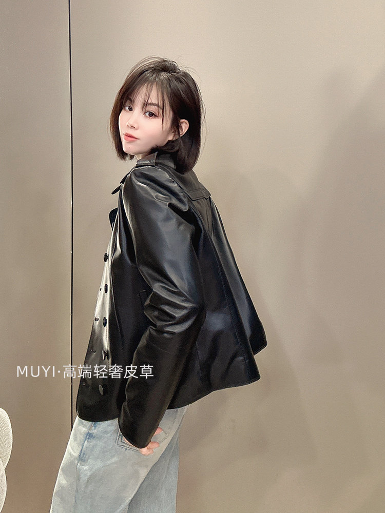 2025 New Double Breasted Genuine Leather Jacket Women's Short Sheepskin Lapel Leather Jacket Slim Slim Motorcycle Jacket