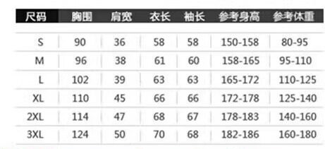 China (cm) 160-165/84-86 165-170 / 88-90 167-172 / 92-96 168-173 / 98-102 170-176 / 106-110