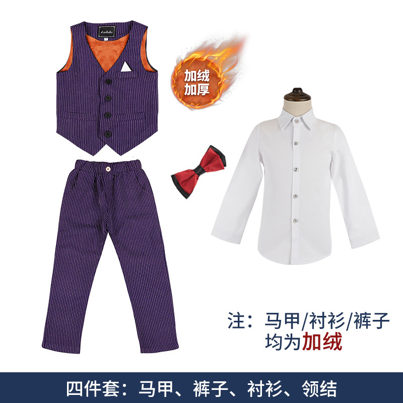 颜色分类 深蓝四件套(马甲+裤子+衬衫+领结),墨绿四件套(马甲+裤子+衬衫+领结),紫色四件套(马甲+裤子+衬衫+领结),深蓝加绒款四件套(马甲+裤子+衬衫+领结),墨绿加绒款四件套(马甲+裤子+衬衫+领结),紫色加绒款四件套(马甲+裤子+衬衫+领结)
