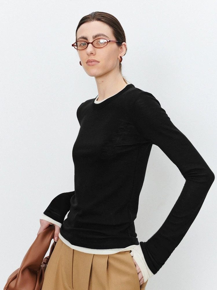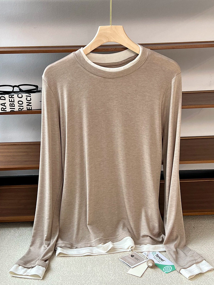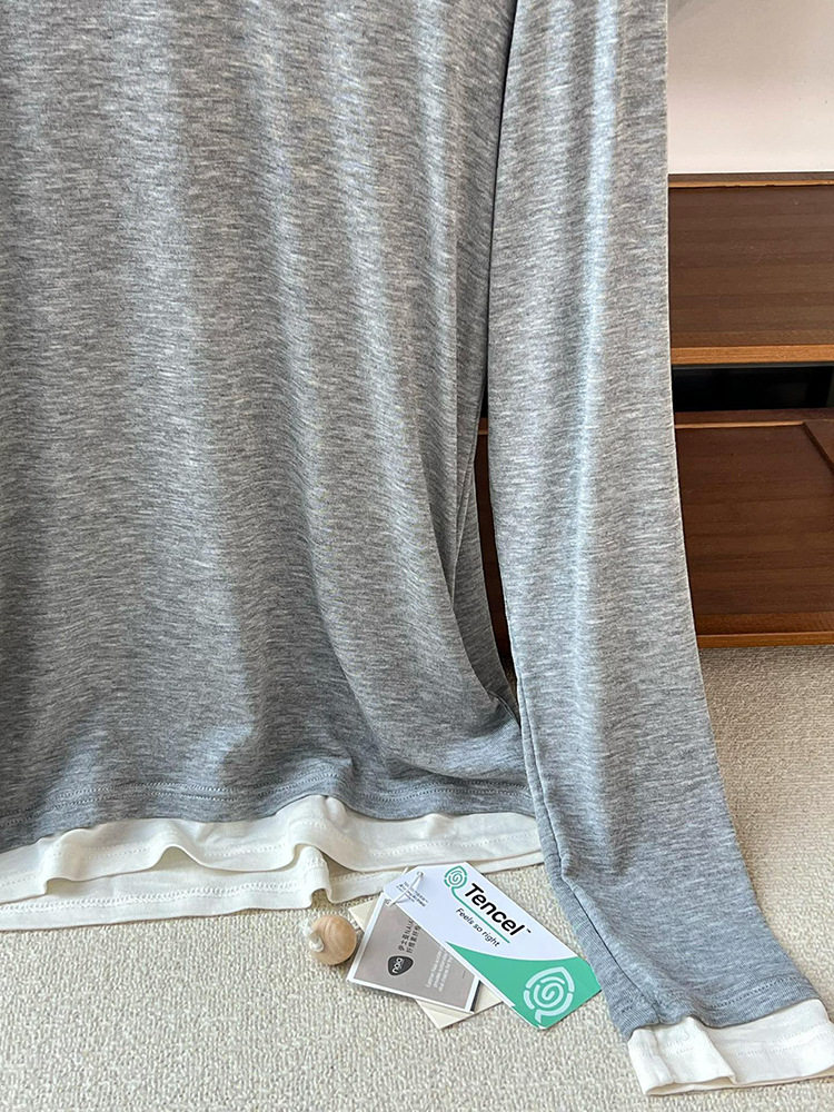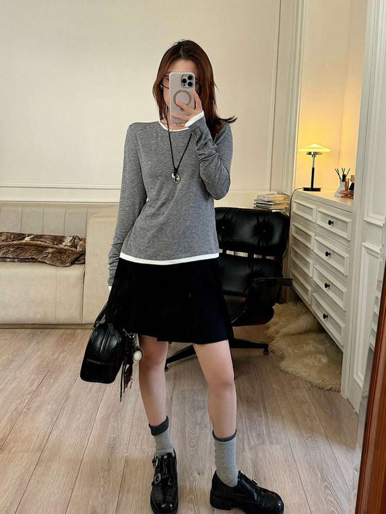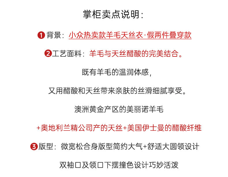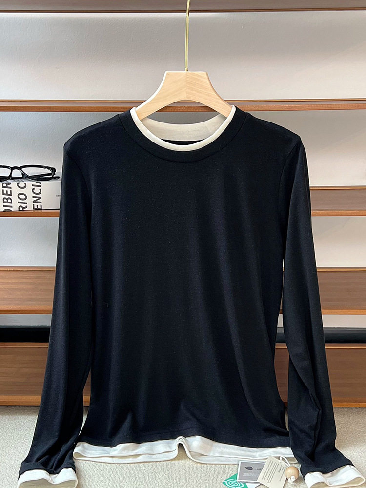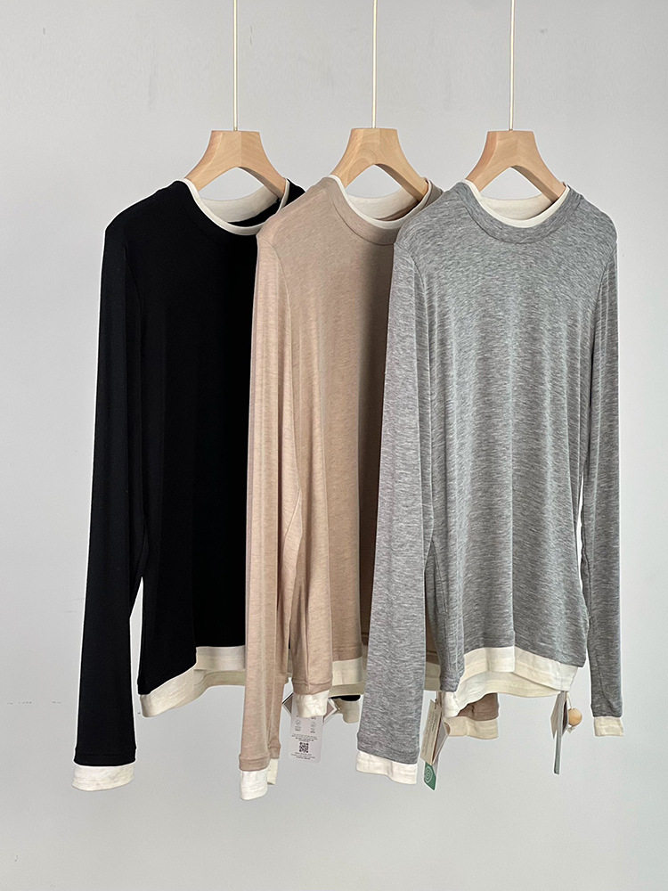 杭州四媛服饰有限公司四媛 简约时尚圆领拼接撞色假两件针织衫长