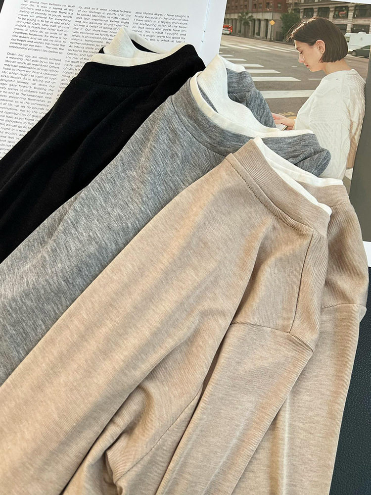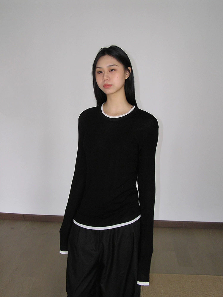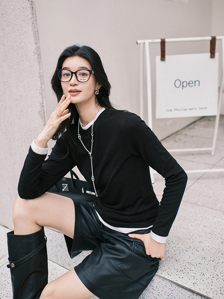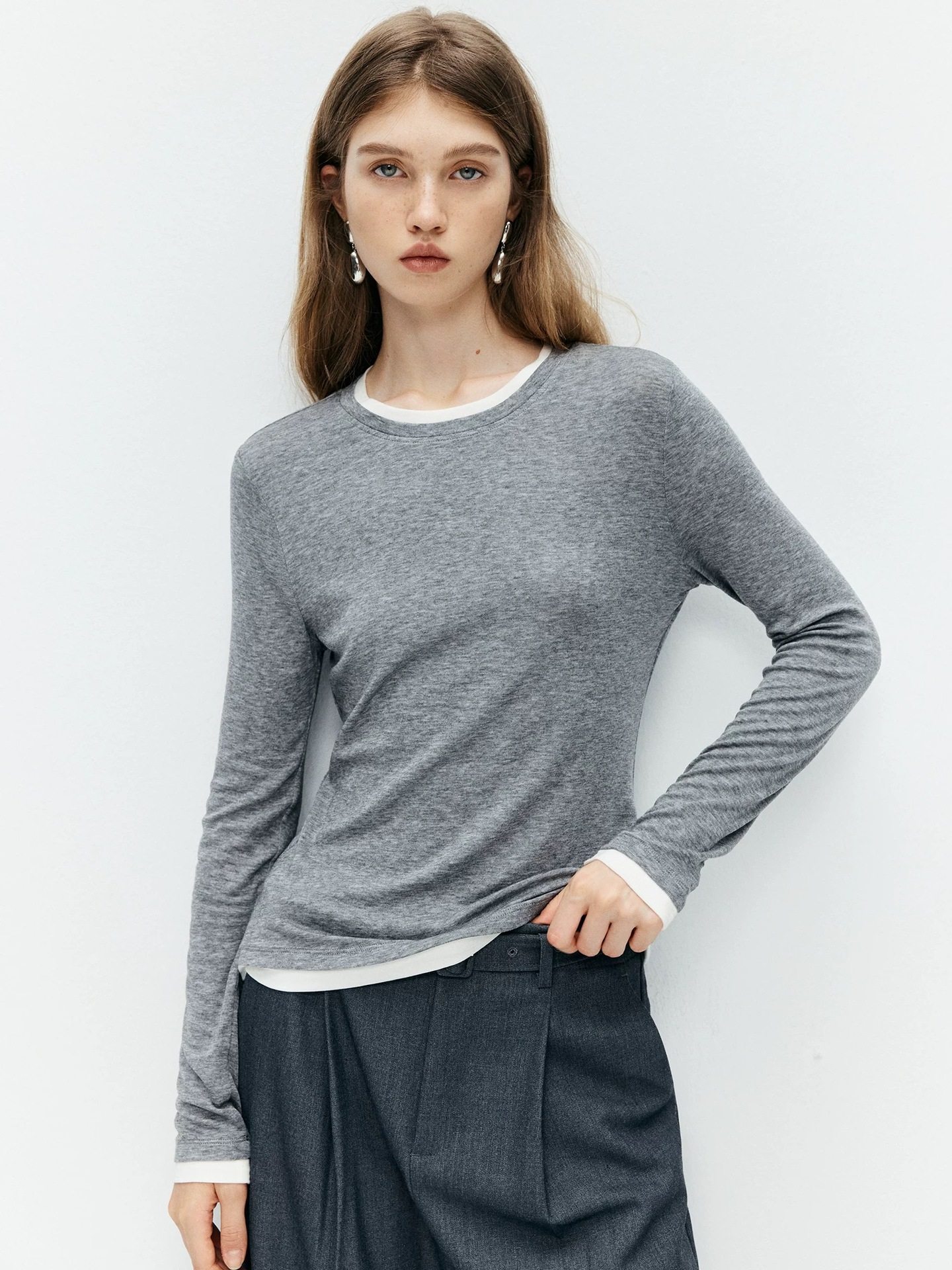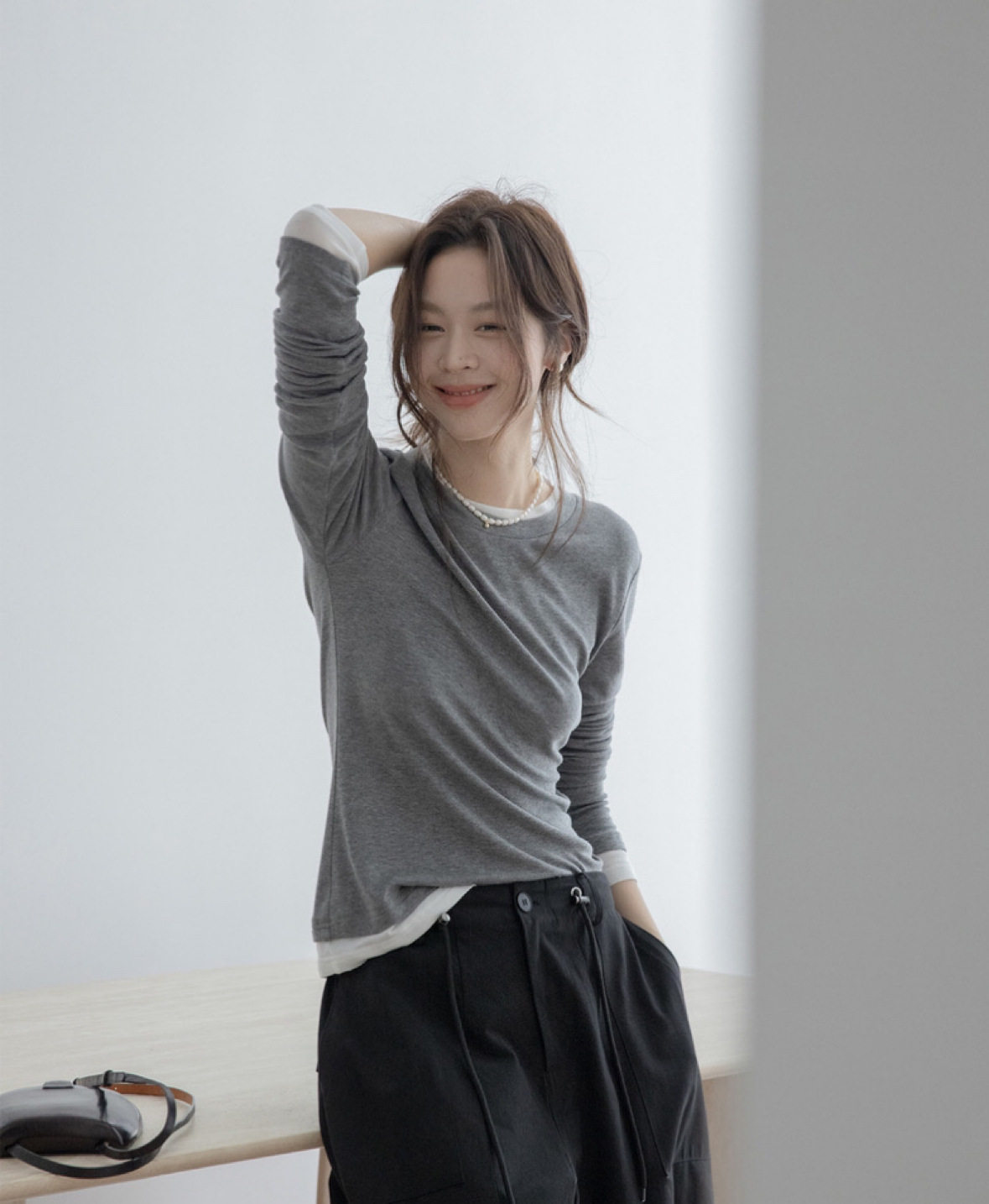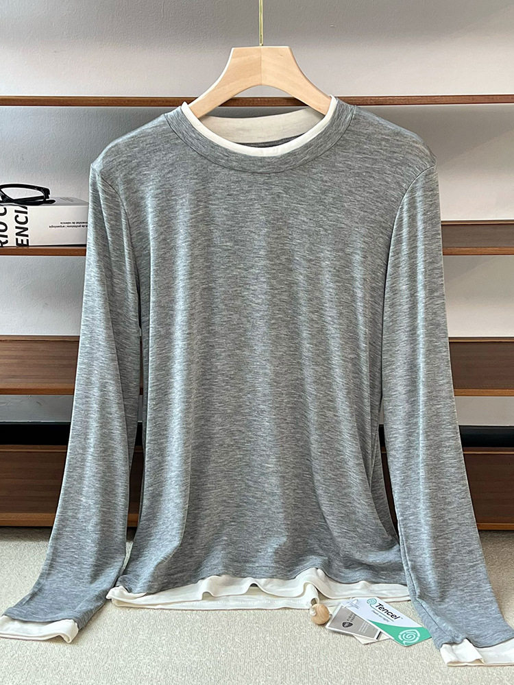 杭州四媛服饰有限公司四媛 简约时尚圆领拼接撞色假两件针织衫长