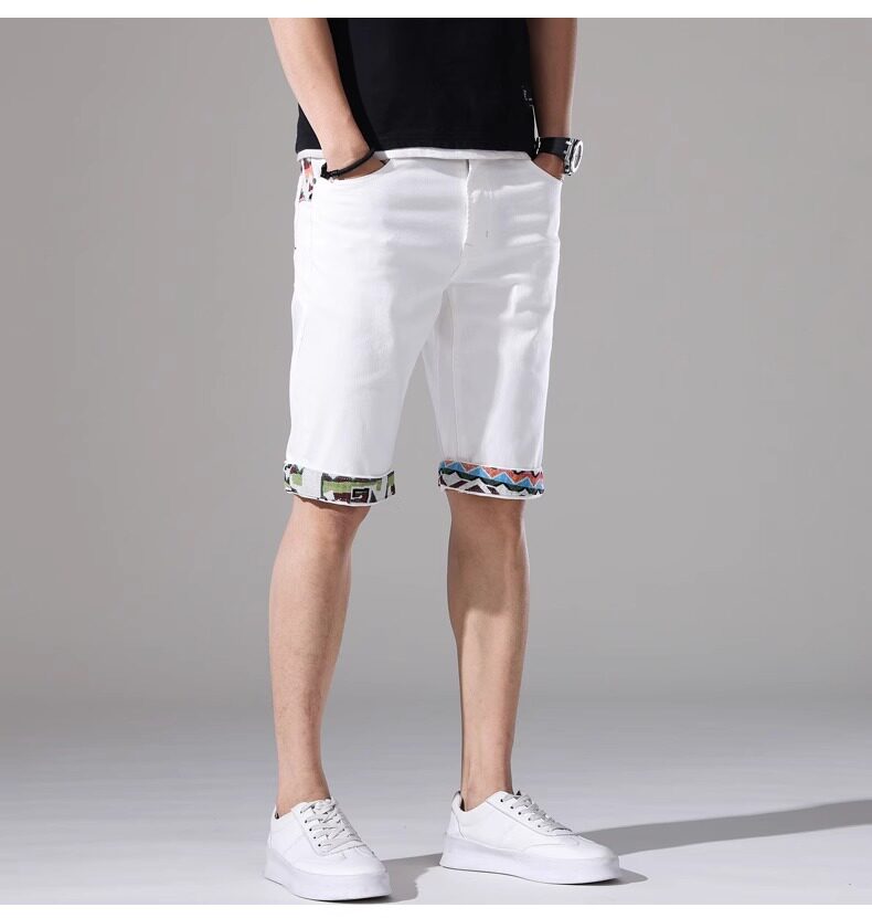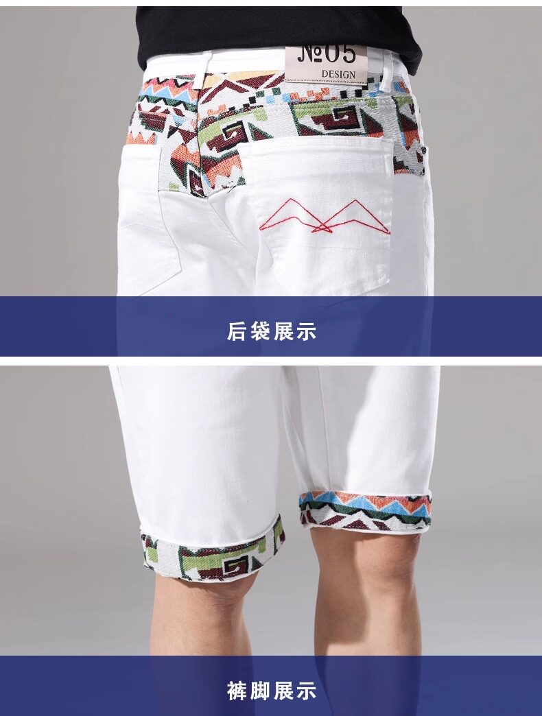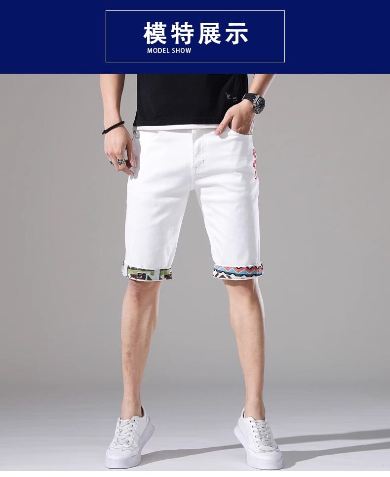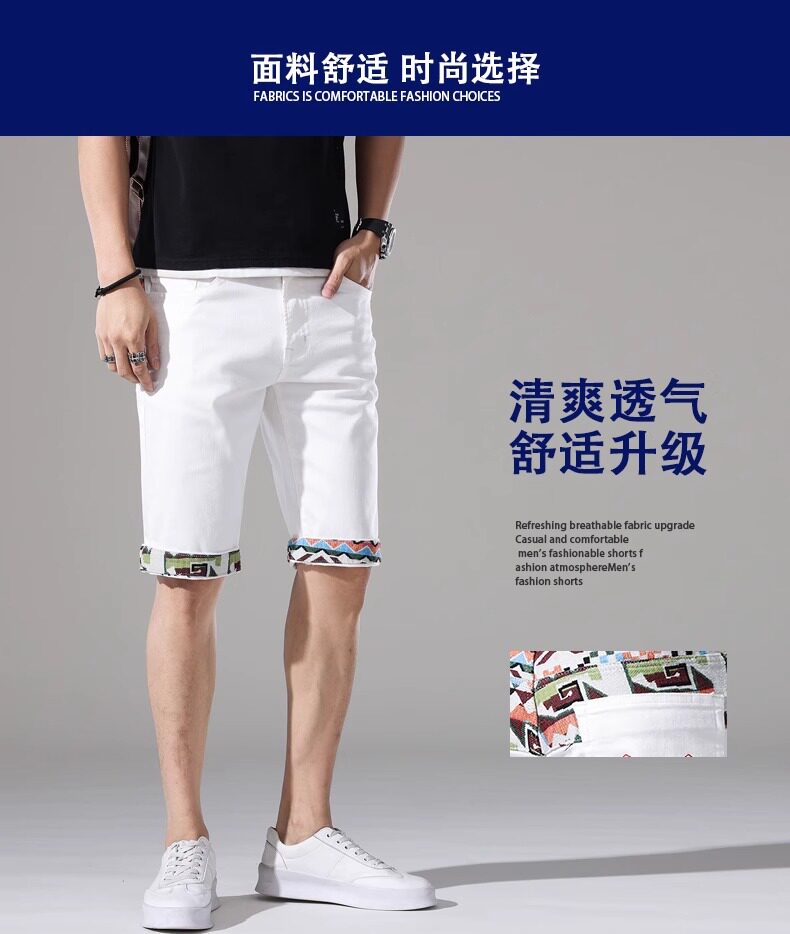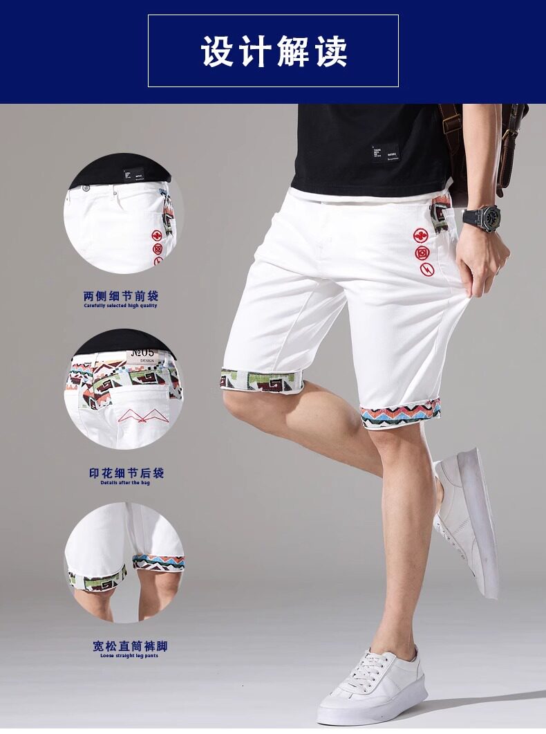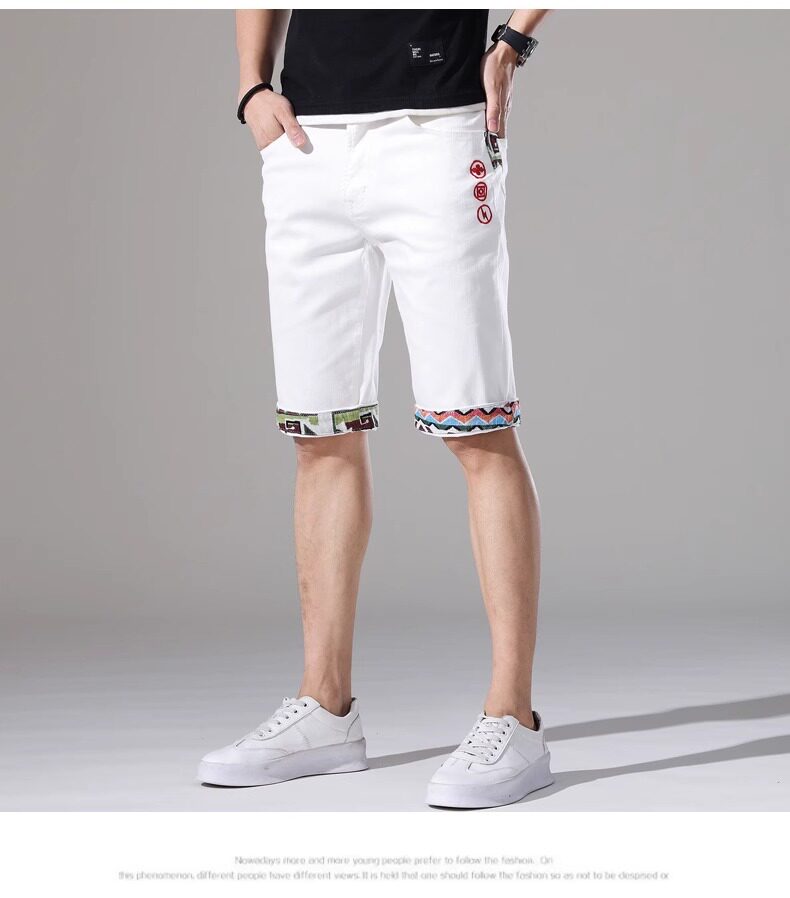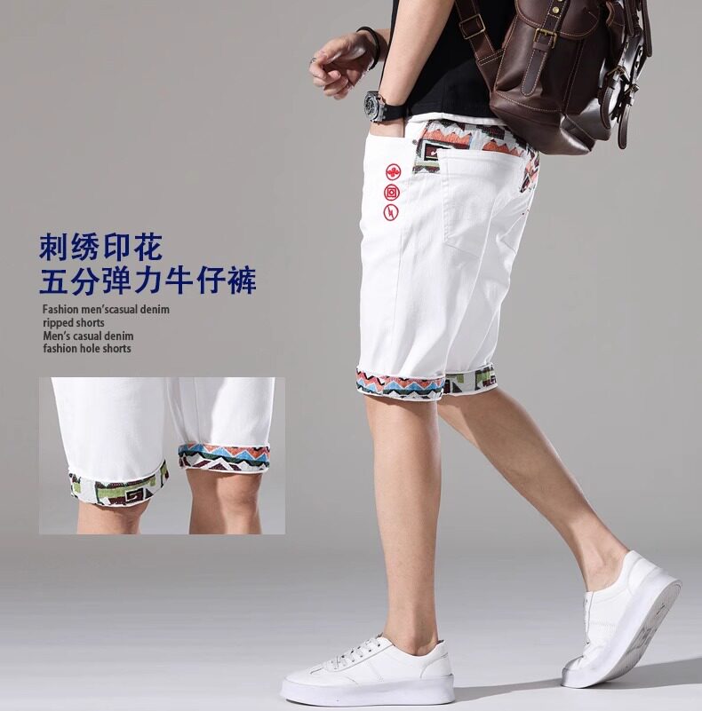 French high-end embroidered white denim shorts men's slim stretch 2024 summer thin medium pants casual five points