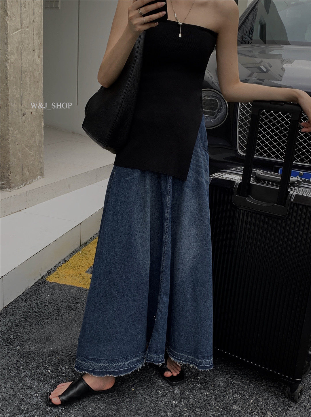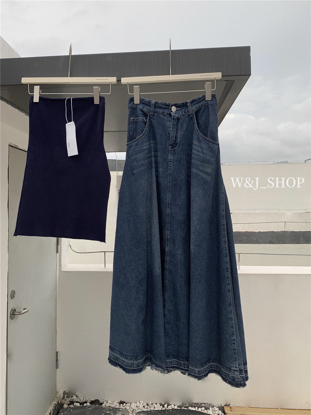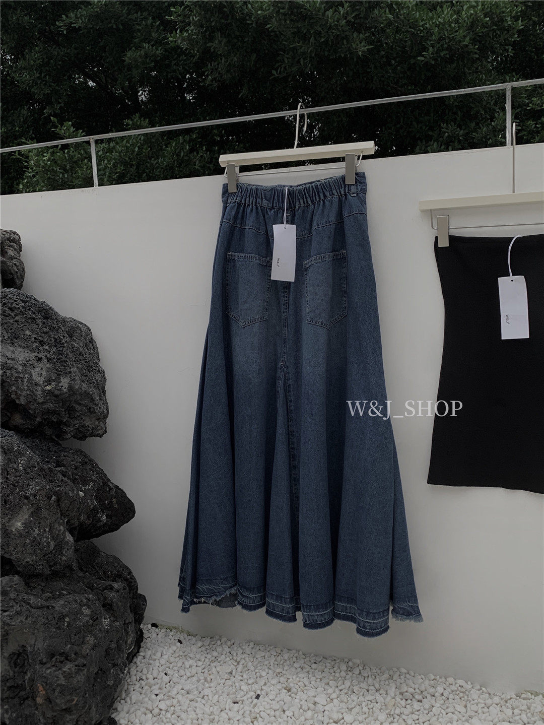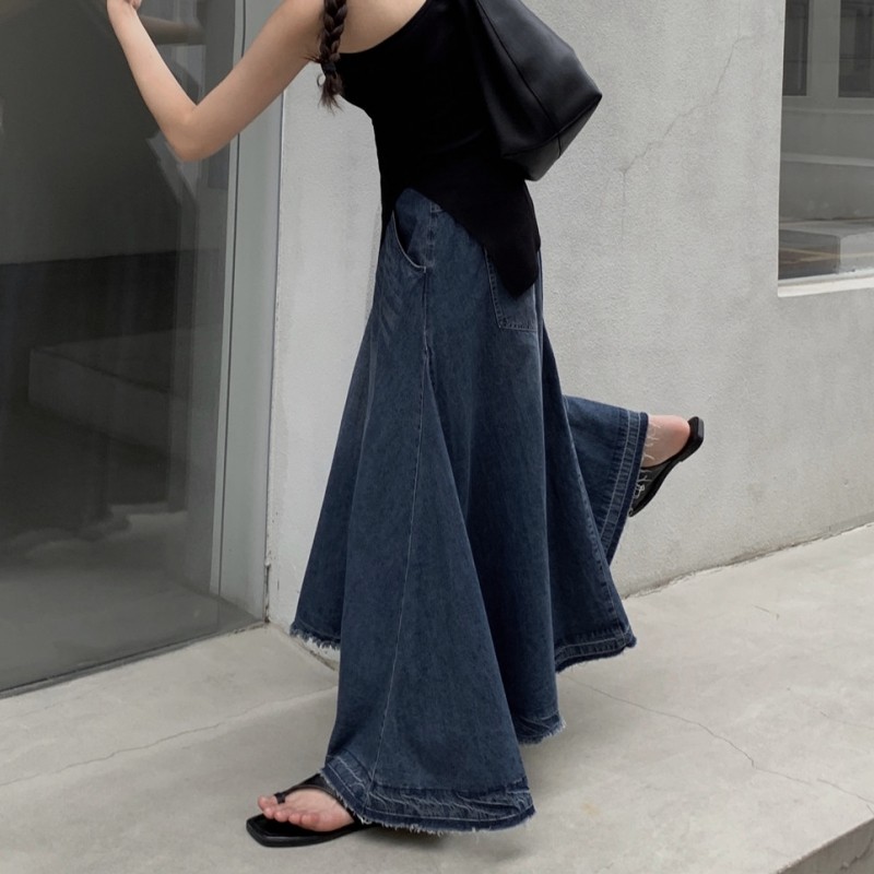 High-end, elegant, high-waisted denim blue, retro-style lazy half-length skirt, niche design, tasseled raw edge skirt