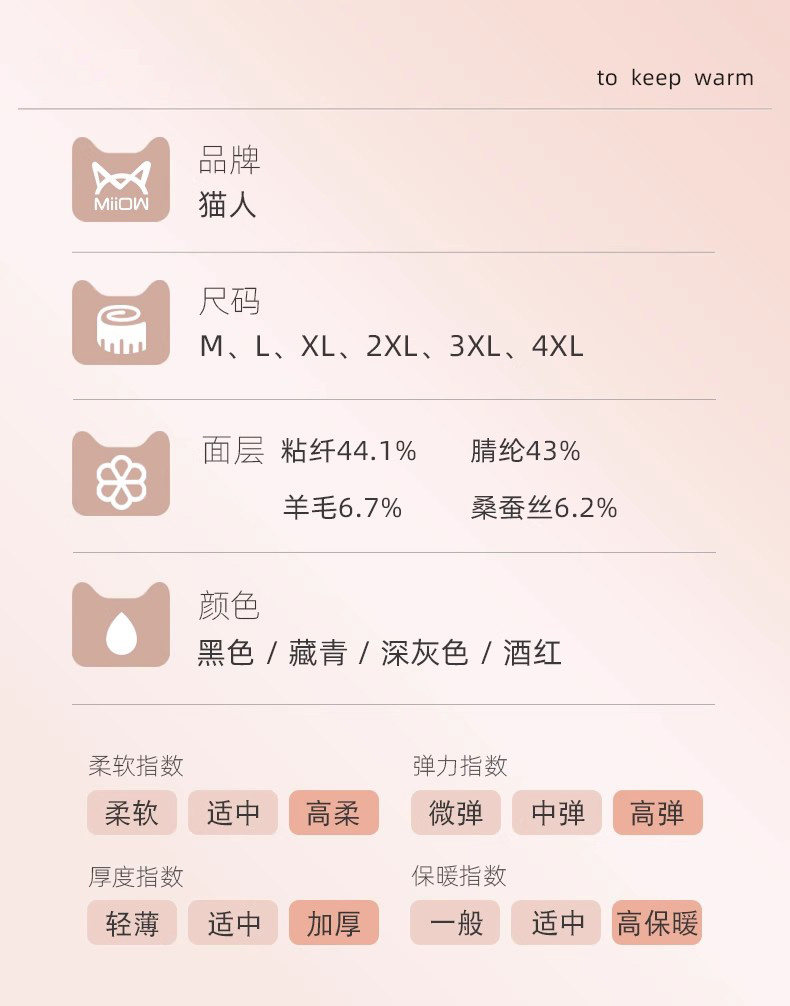 面料材质成分 粘胶纤维(粘纤)44.1% 聚丙烯腈纤维(腈纶)43% 羊毛6.7% 桑蚕丝6.2%