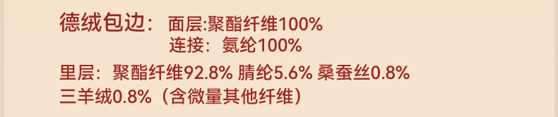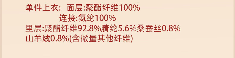 里料材质成分 聚酯纤维92.8% 聚丙烯腈纤维(腈纶)5.6% 山羊绒(羊绒)0.8% 桑蚕丝0.8%