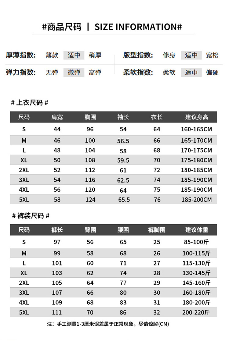 Size S (suitable for 85-100Jin Jin is equal to 0.5kg),M (suitable for 100-115 Jin Jin equals 0.5 kg),L (suitable for 115-130 Jin Jin equals 0.5 kg),XL (suitable for 130-145 Jin Jin equals 0.5 kg),2XL (suitable for 145-160 Jin Jin equals 0.5 kg),3XL (suitable for 160-180Jin Jin equal to 0.5kg),4XL (suitable for 180-200Jin Jin equal to 0.5kg),5XL (suitable for 200-220Jin Jin equal to 0.5kg)