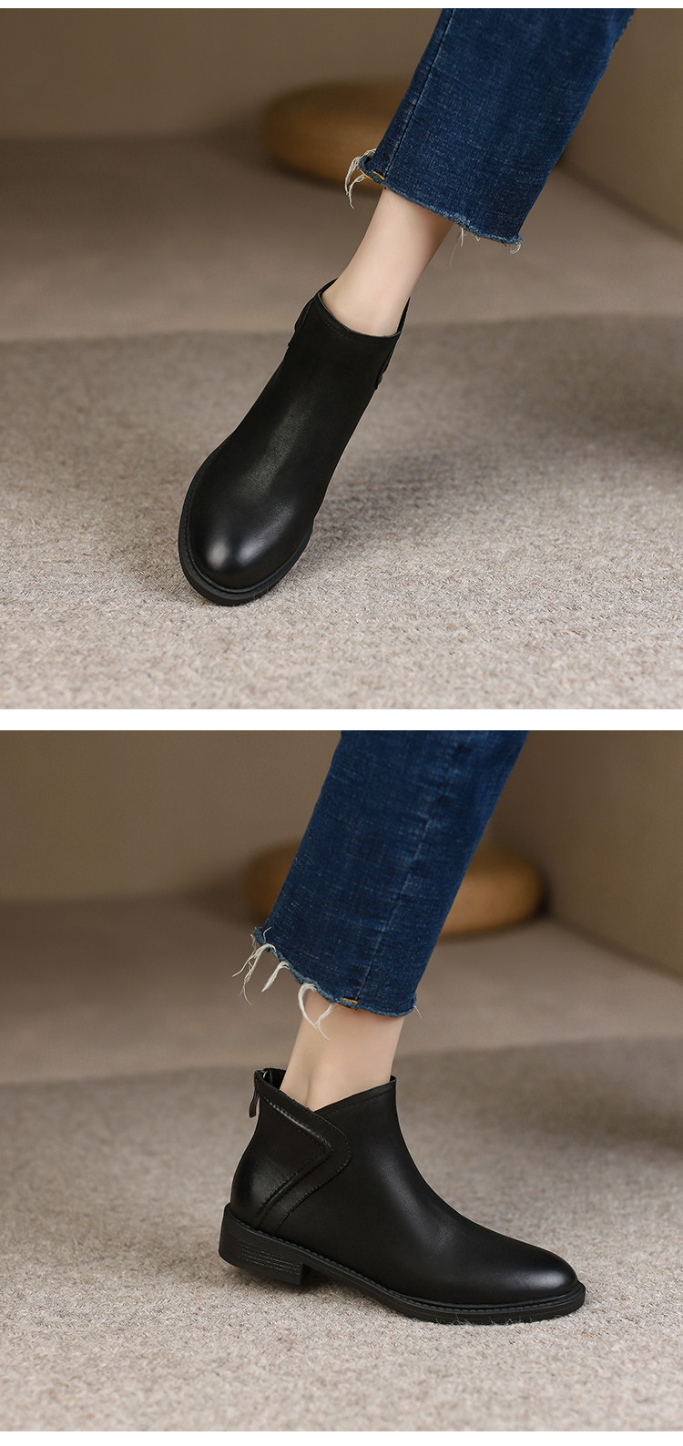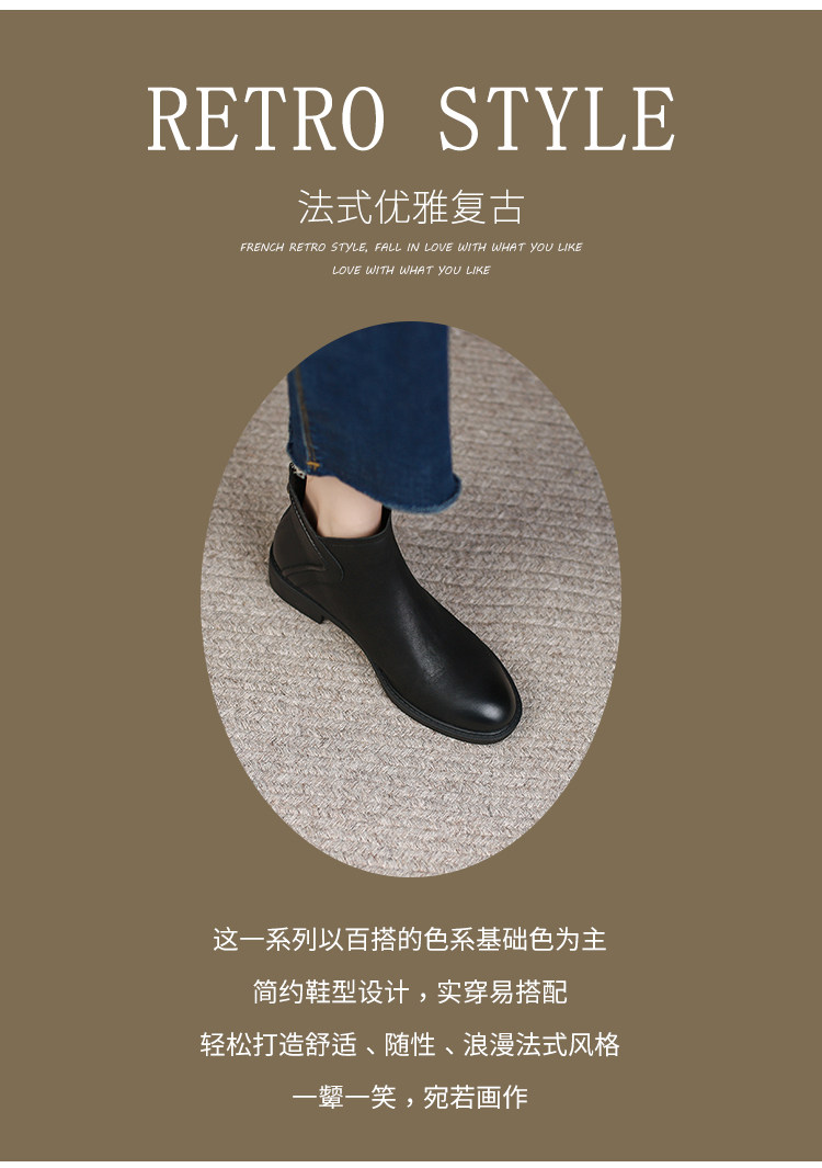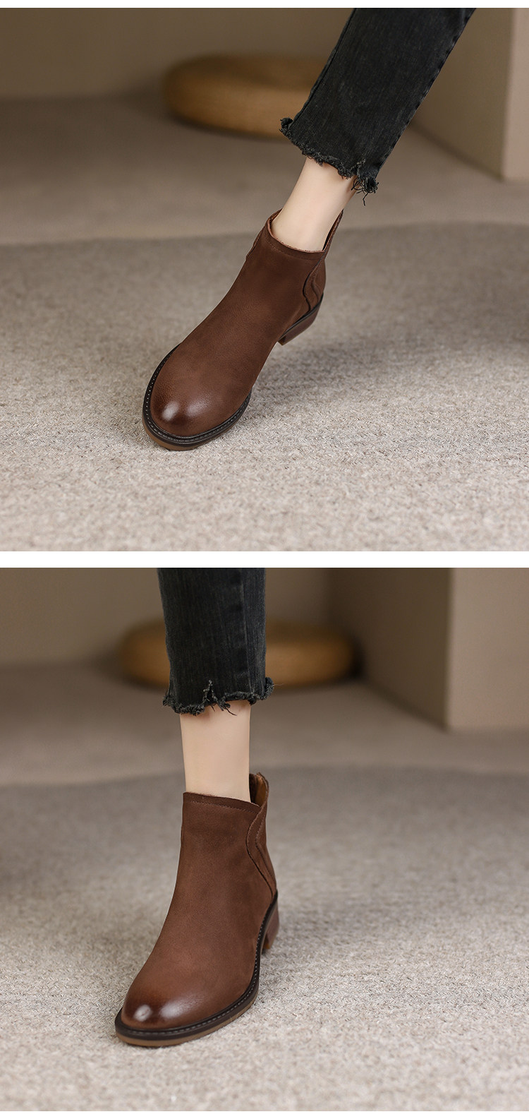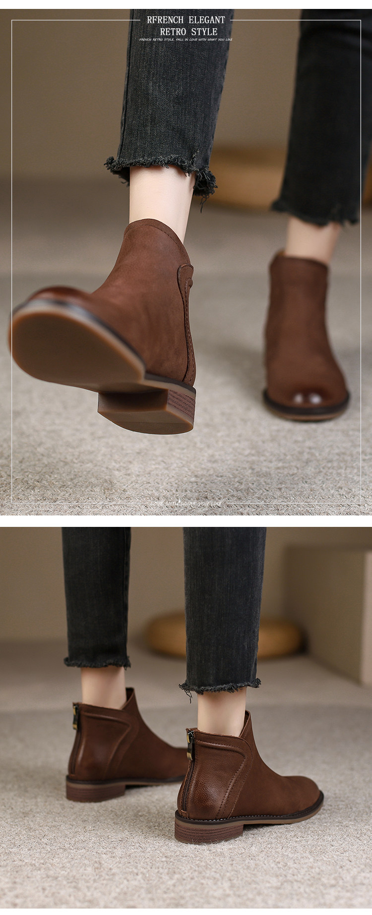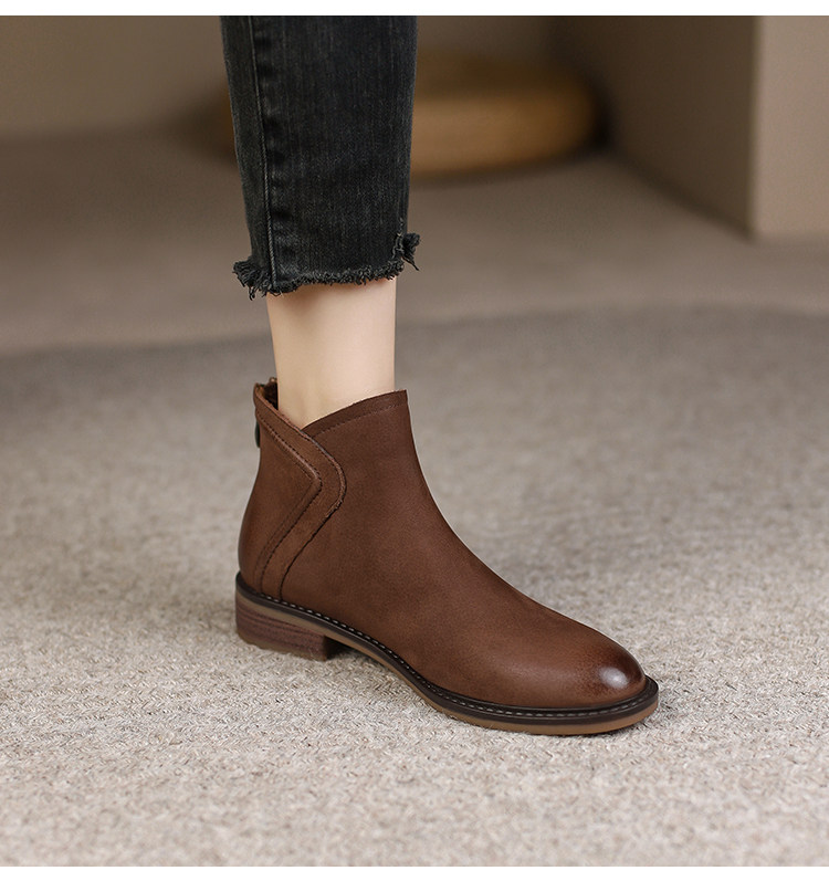 Genuine leather French retro polished short boots for women in autumn and winter, comfortable soft sole mid-heel ankle boots, round toe thick heel Chelsea boots