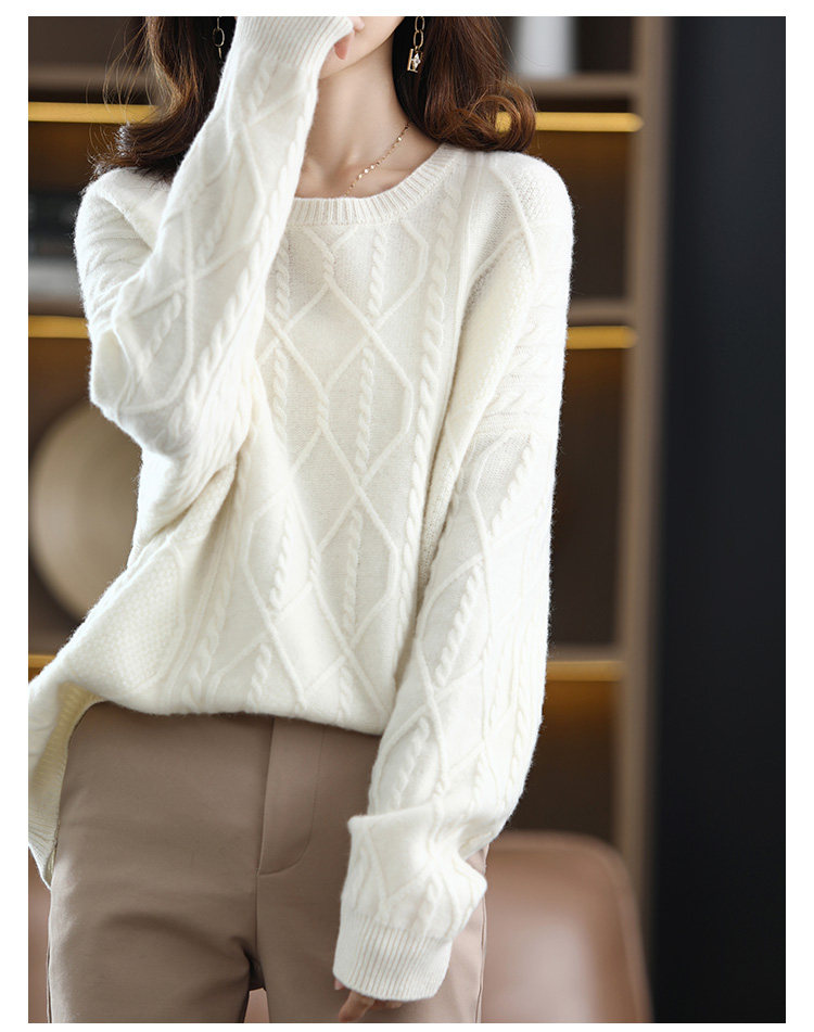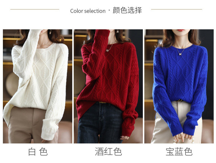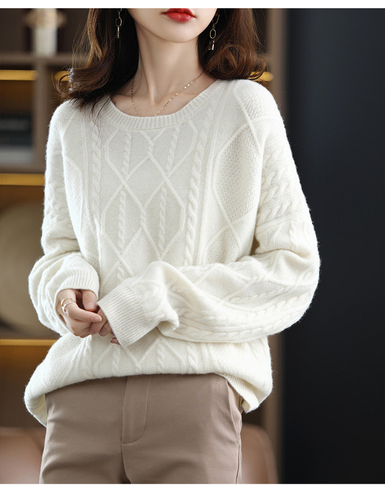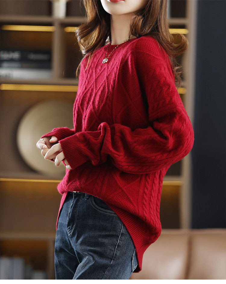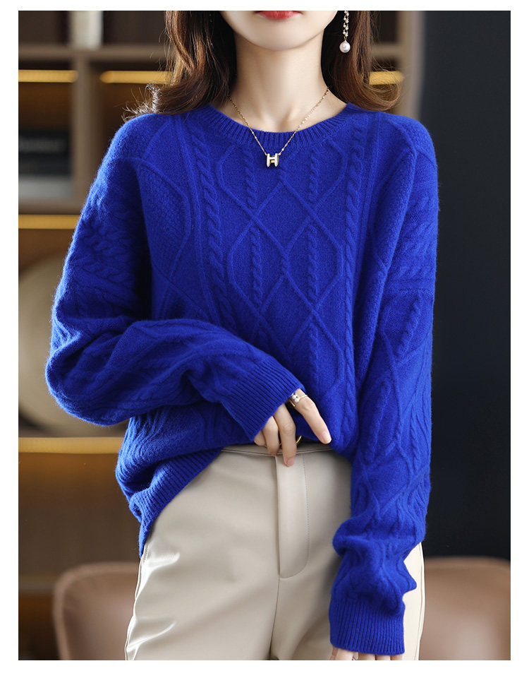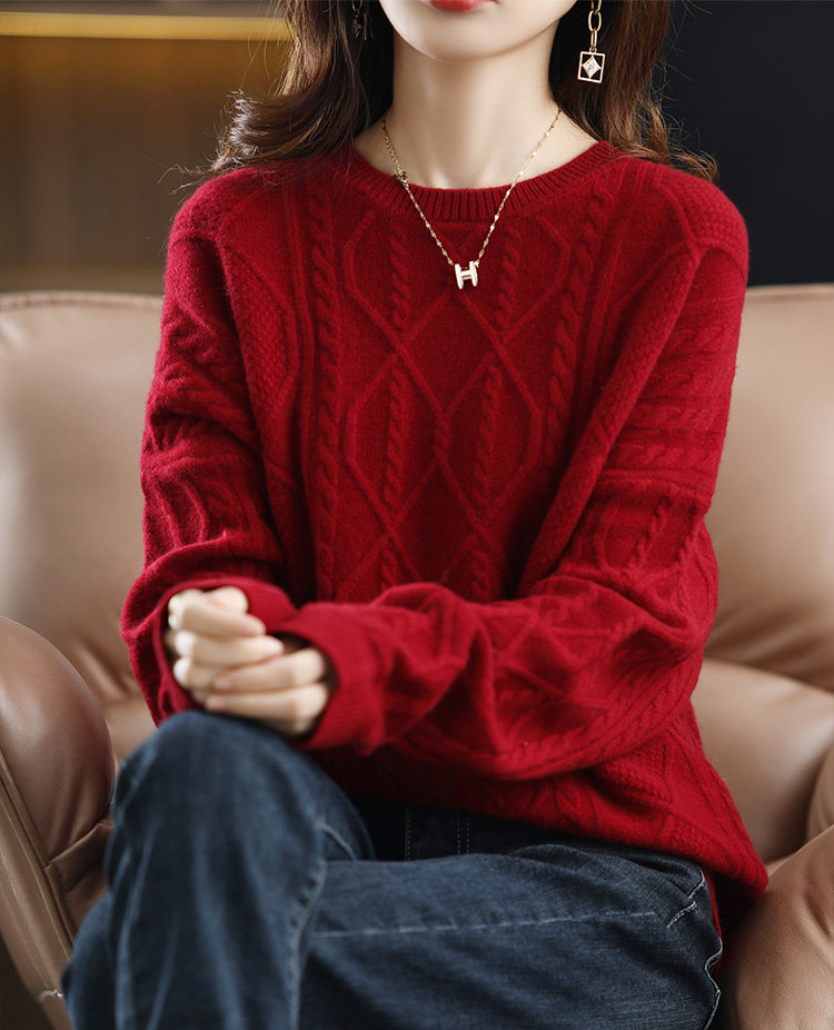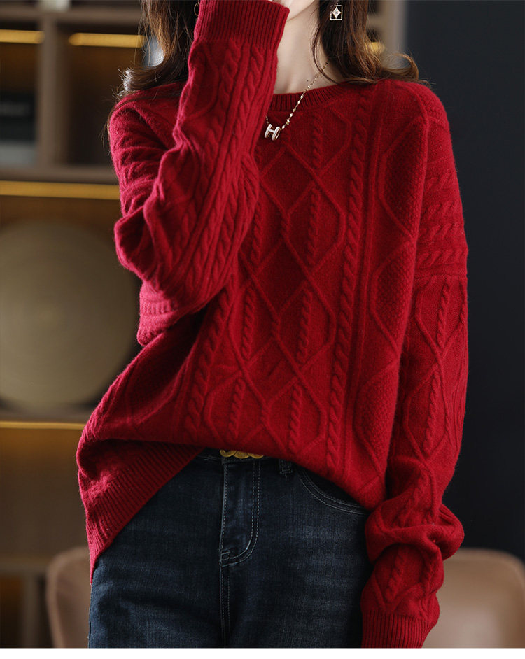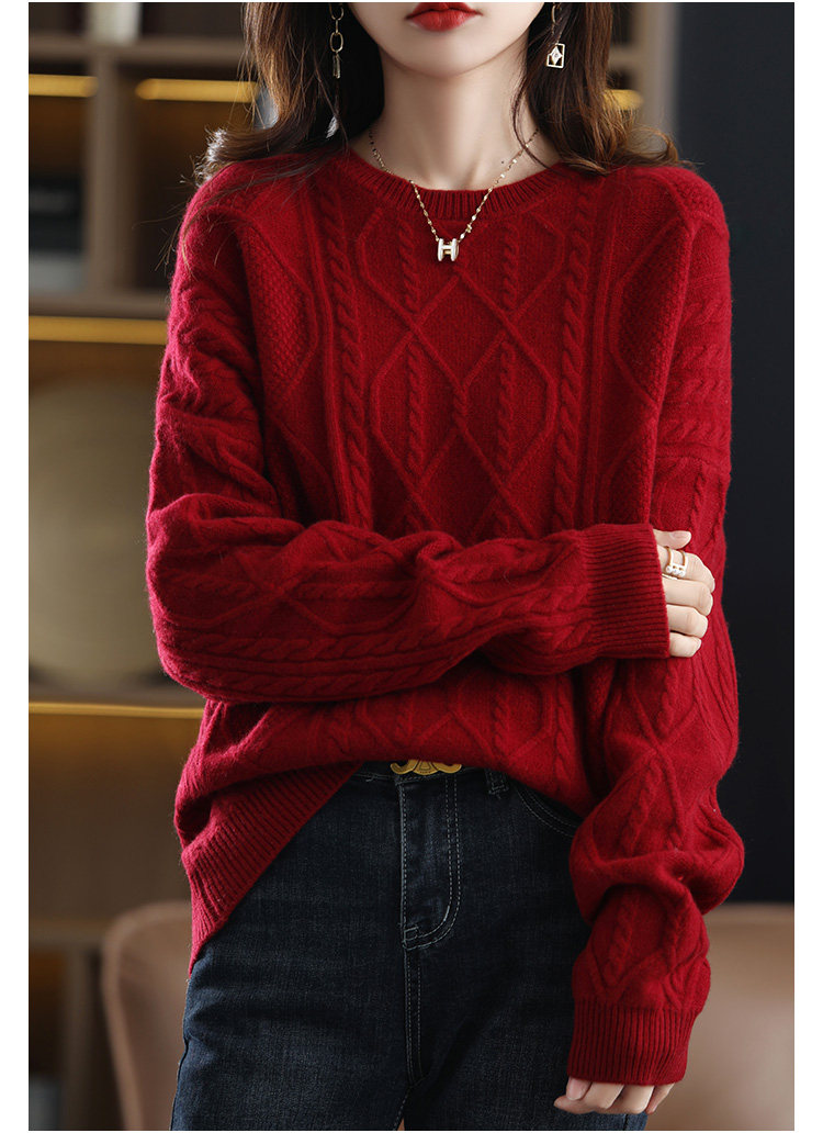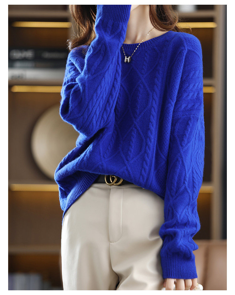 New autumn and winter cashmere sweater for women, round neck cable tie, loose thickened sweater, solid color pullover, pure woolen sweater