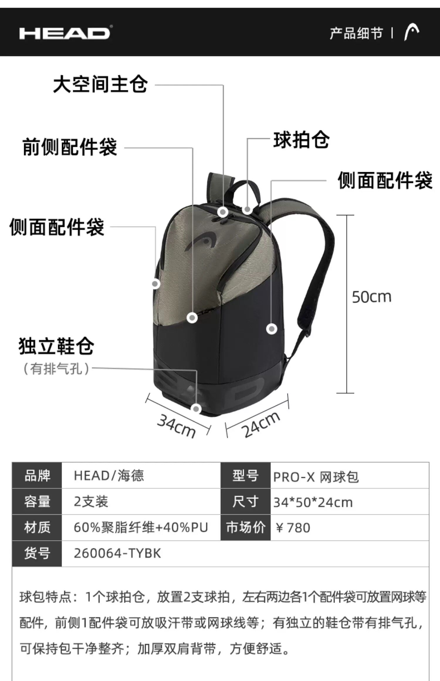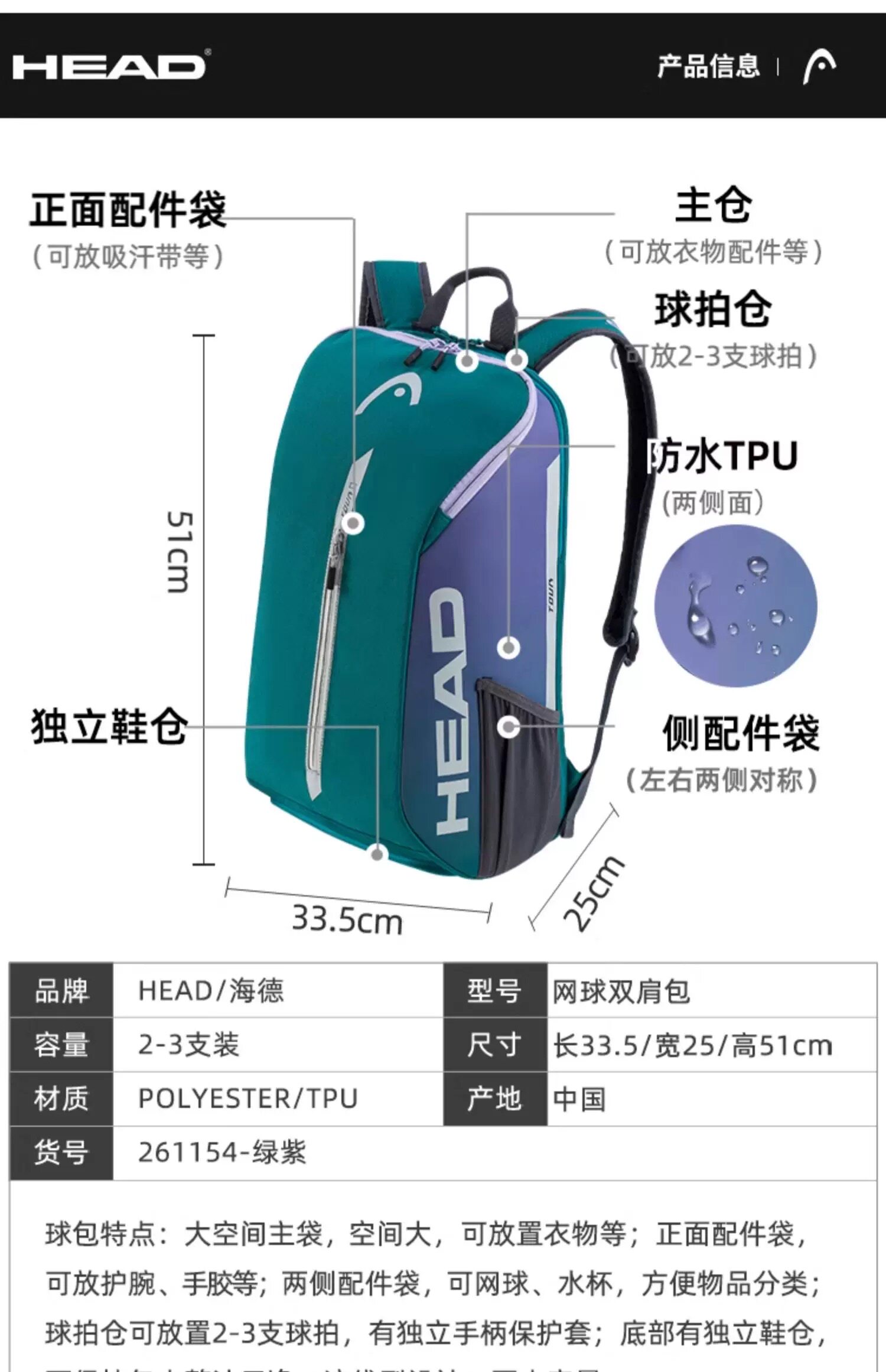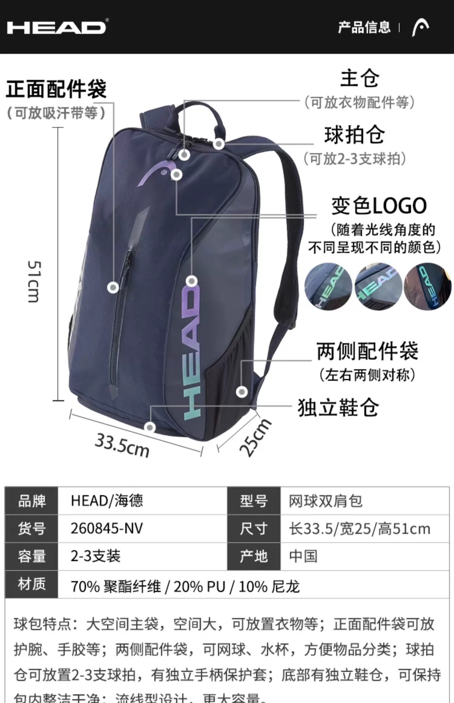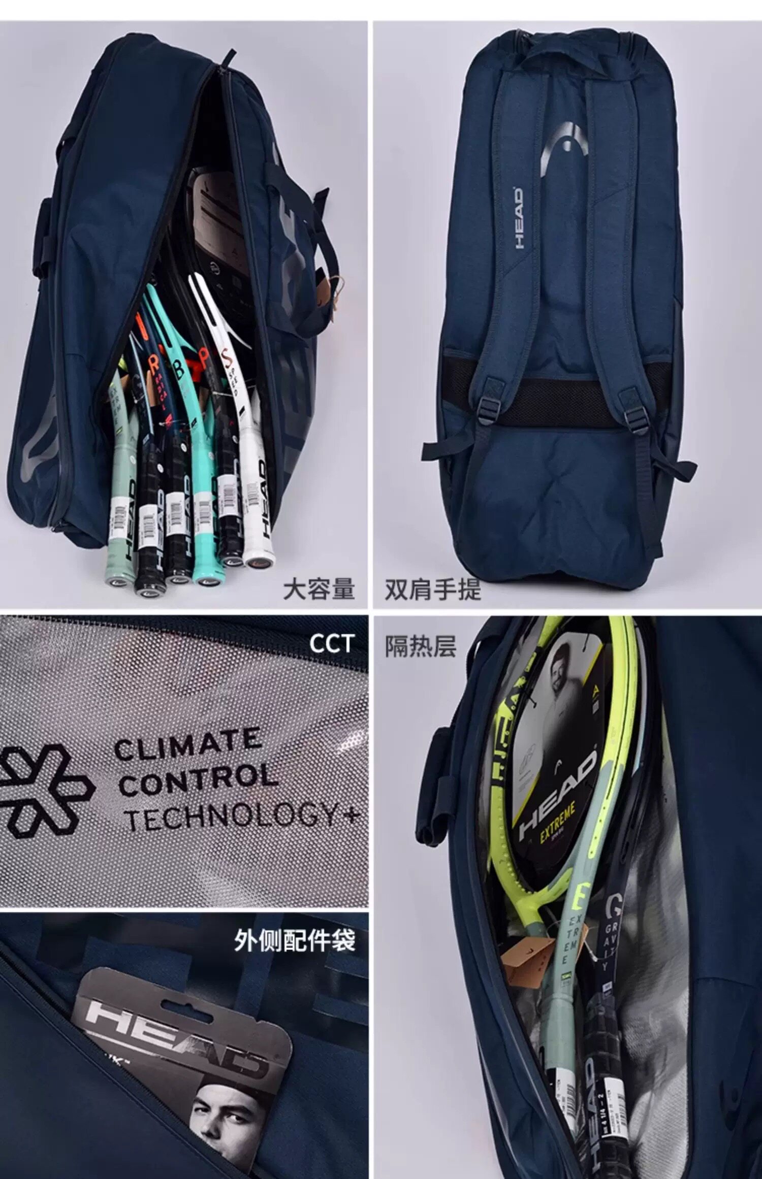 Genuine HEAD tennis bag, badminton bag, men's and women's single shoulder portable three-use multi-functional sports backpack
