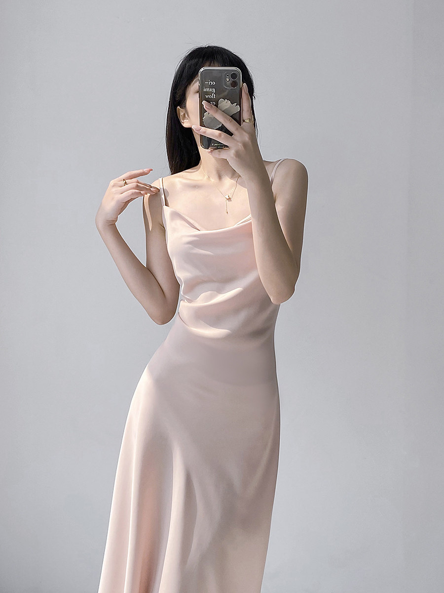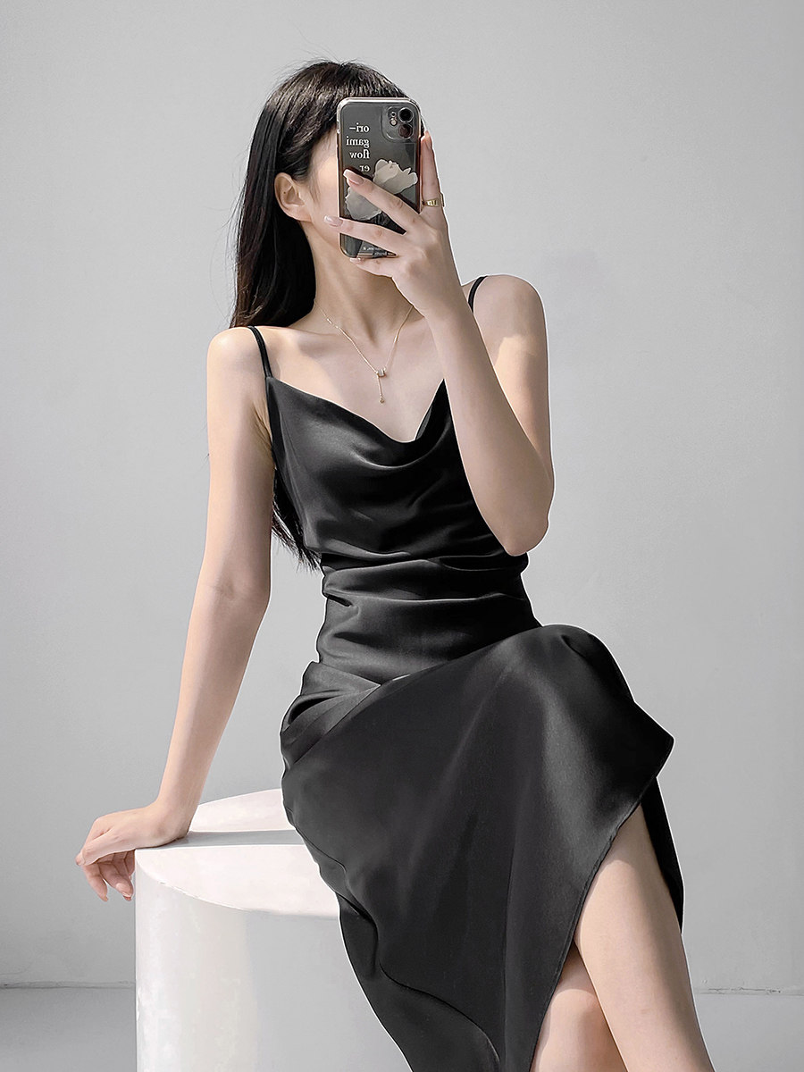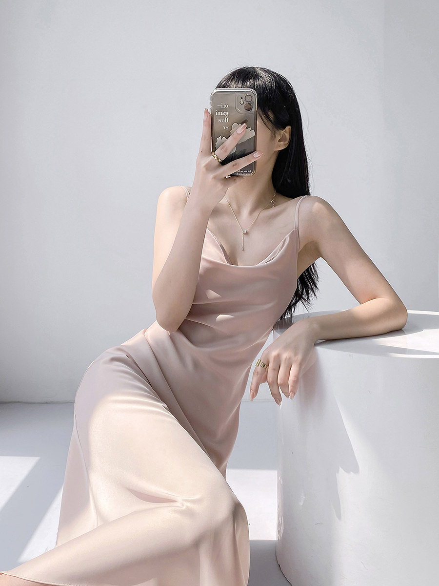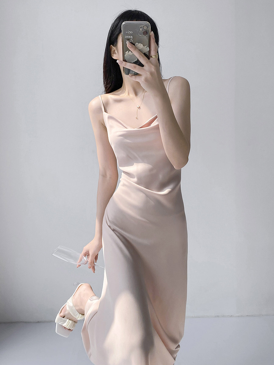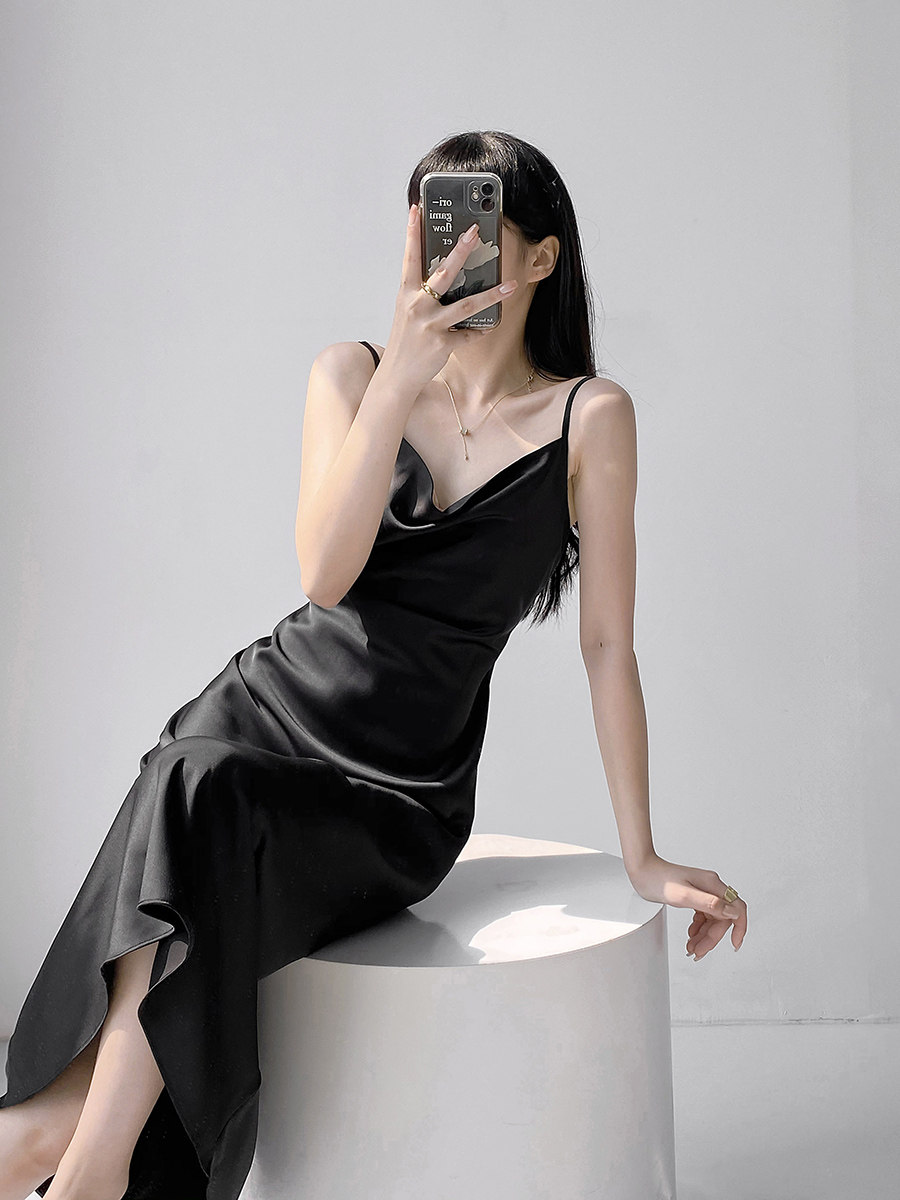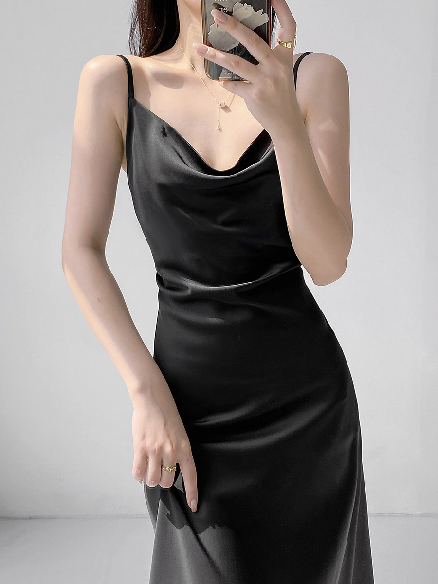 Lady's satin dress, acetic acid-flavored collar, high-end niche, sexy suspender dress, suit with long skirt