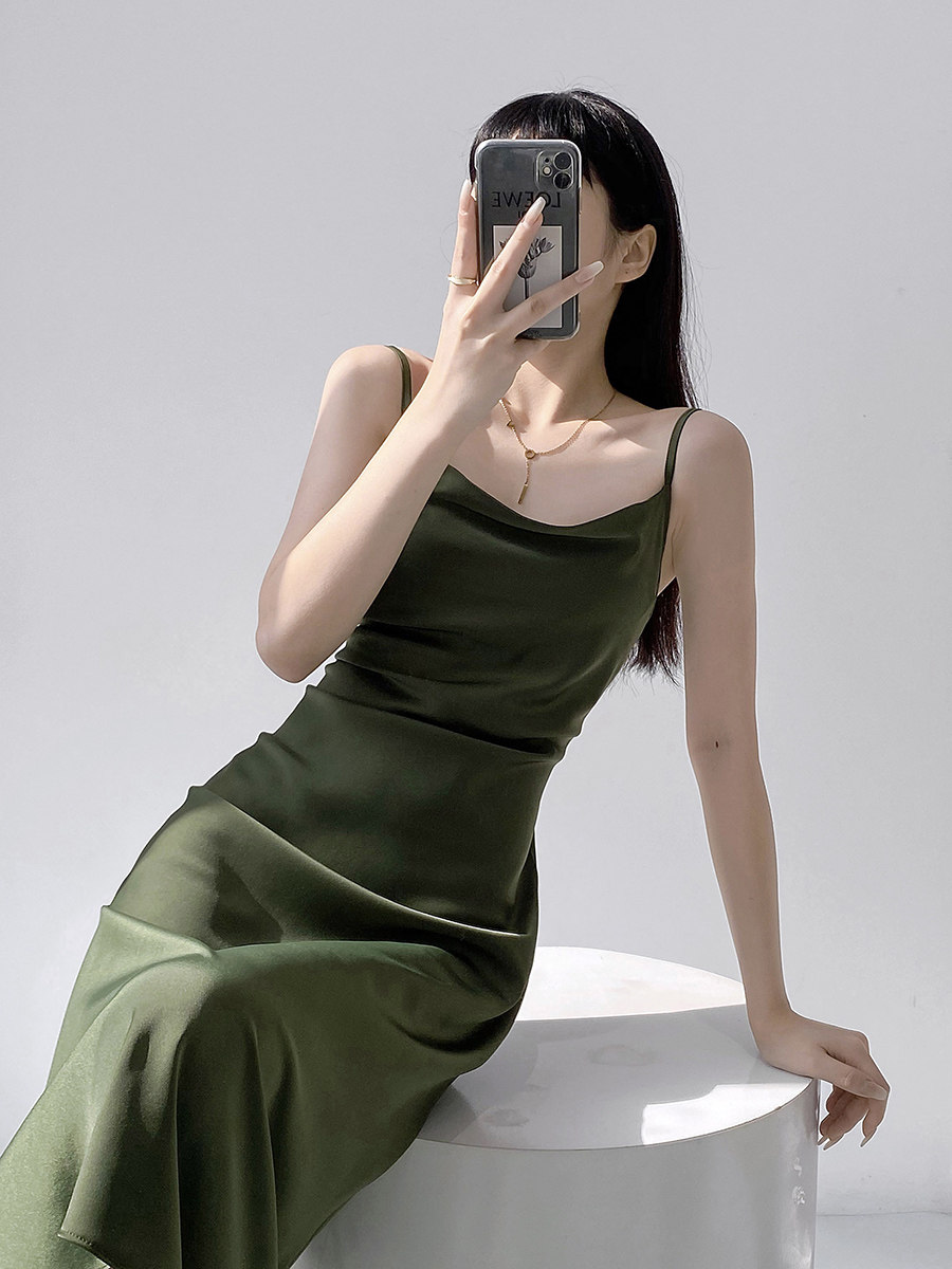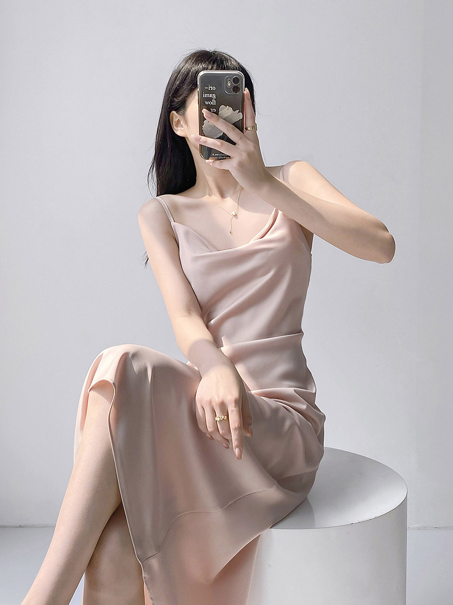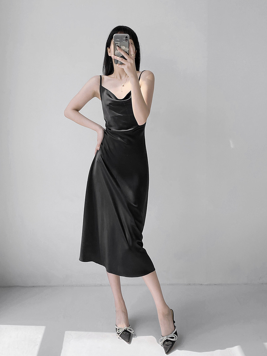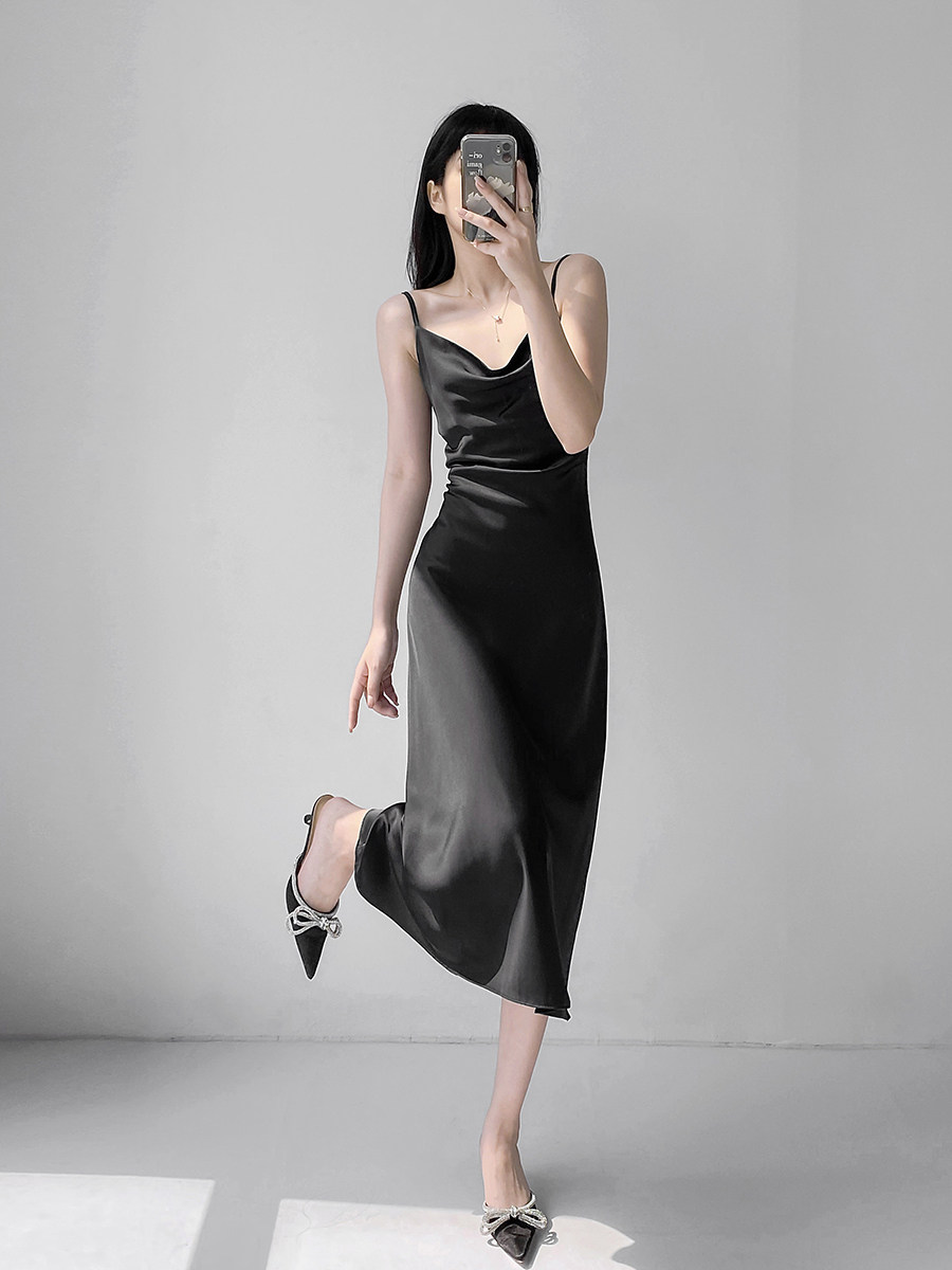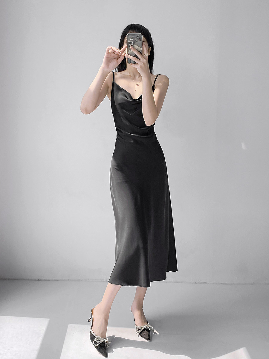 Lady's satin dress, acetic acid-flavored collar, high-end niche, sexy suspender dress, suit with long skirt