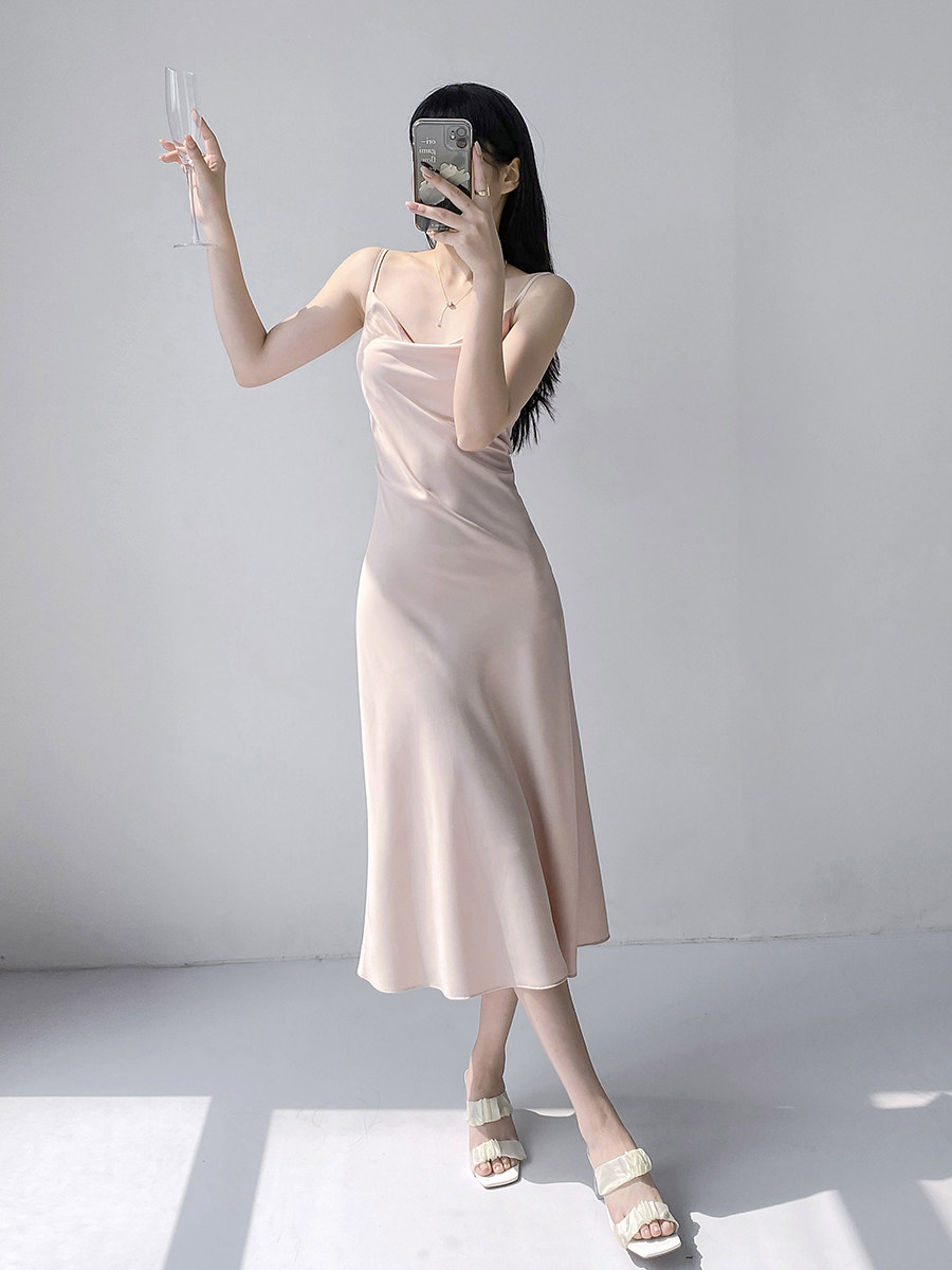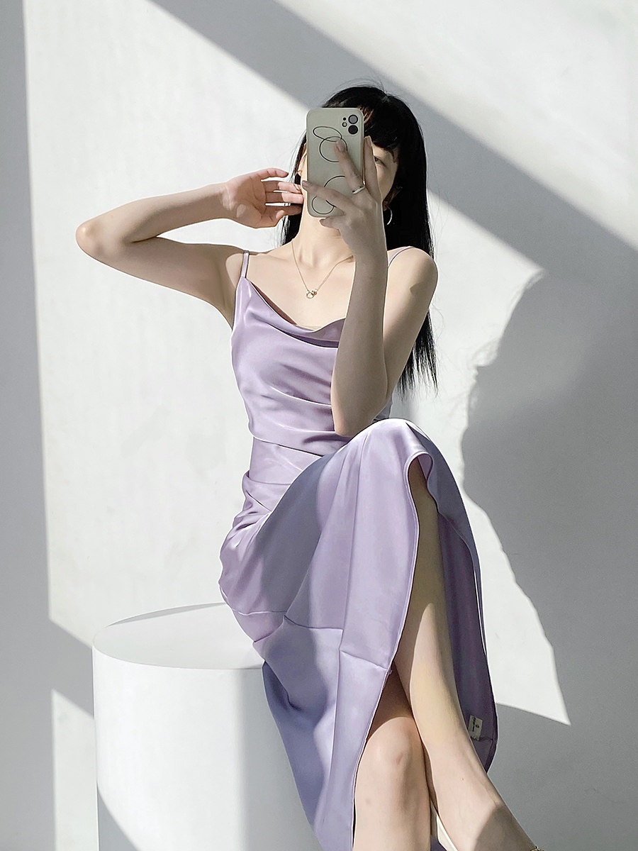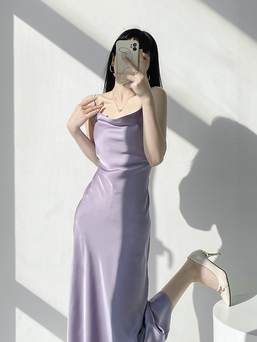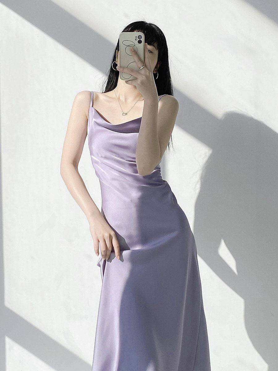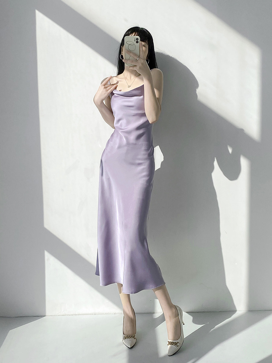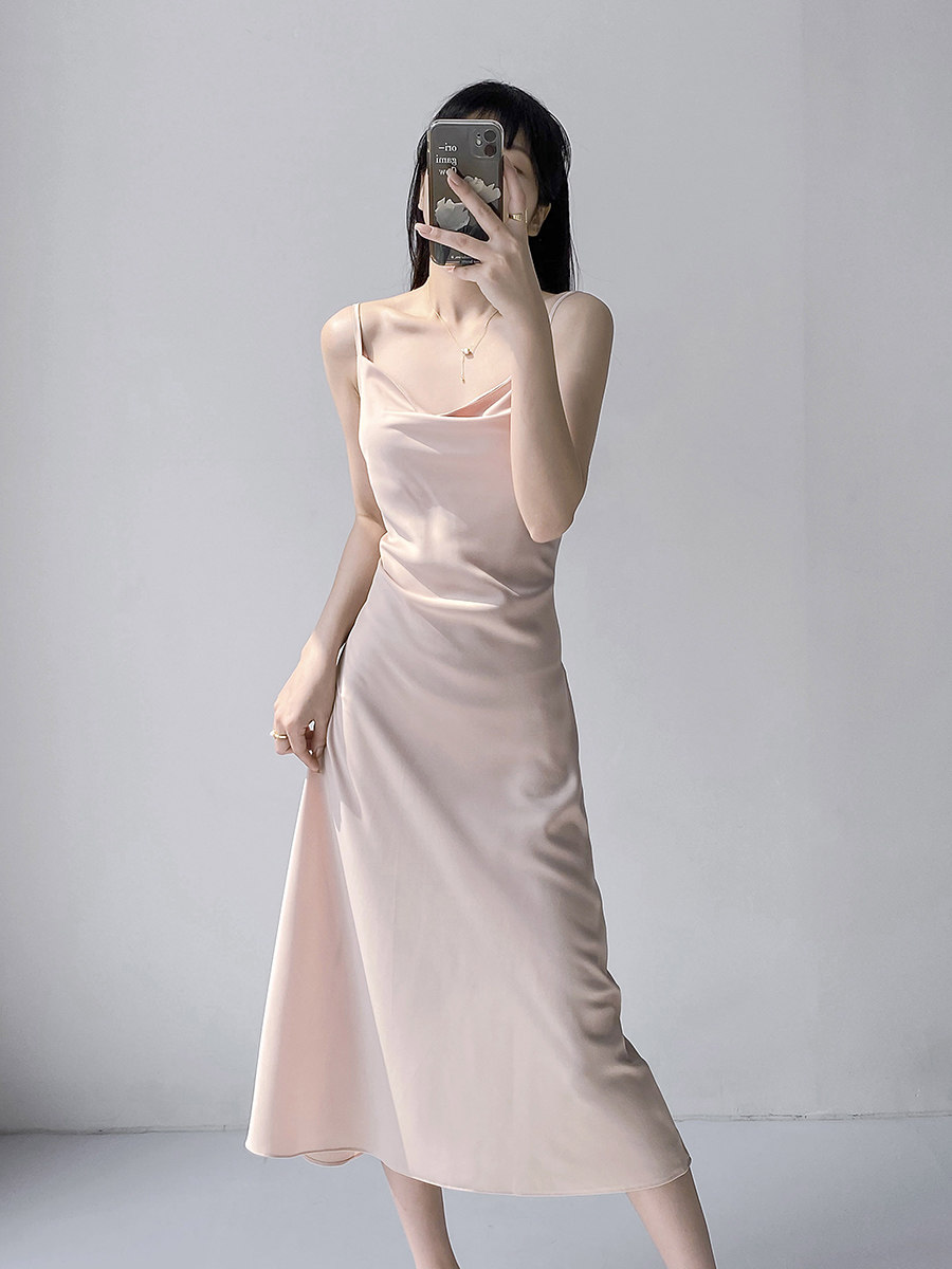 Lady's satin dress, acetic acid-flavored collar, high-end niche, sexy suspender dress, suit with long skirt