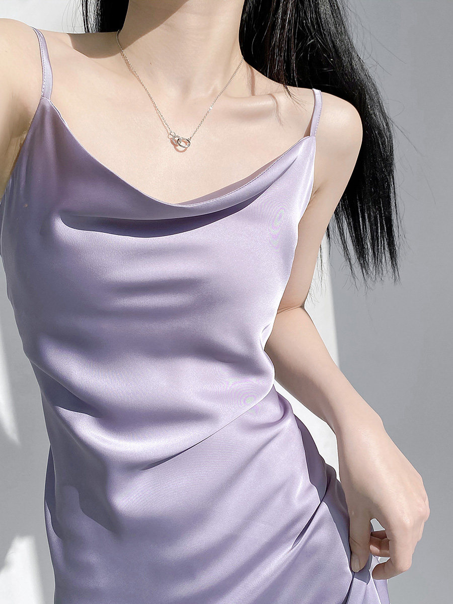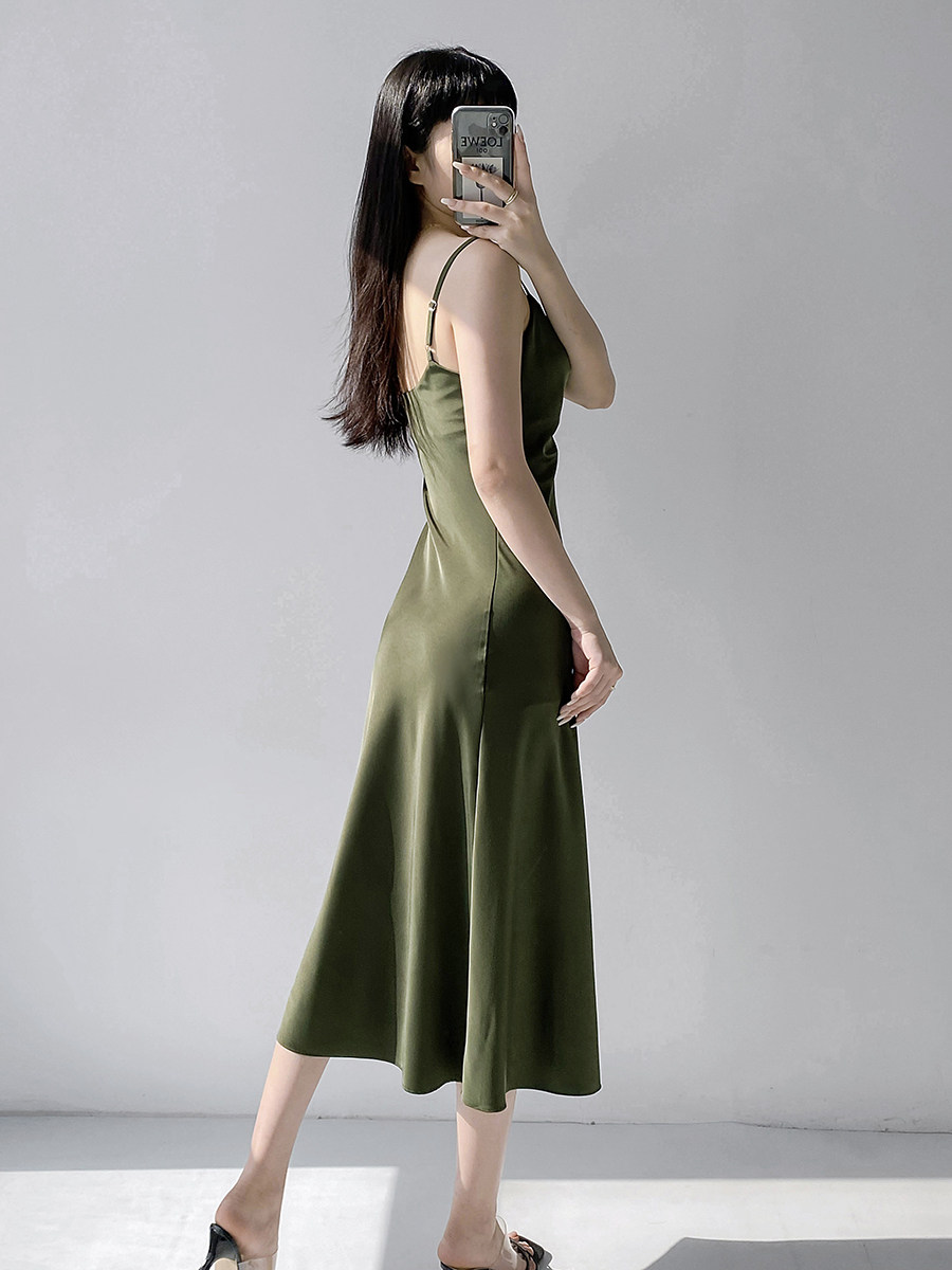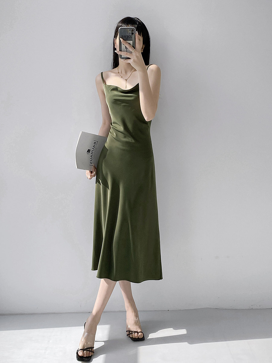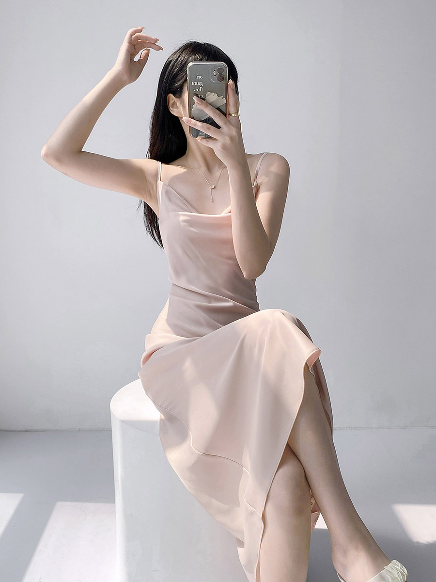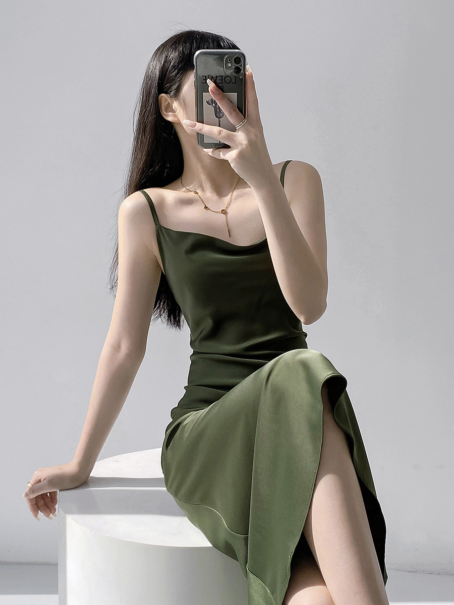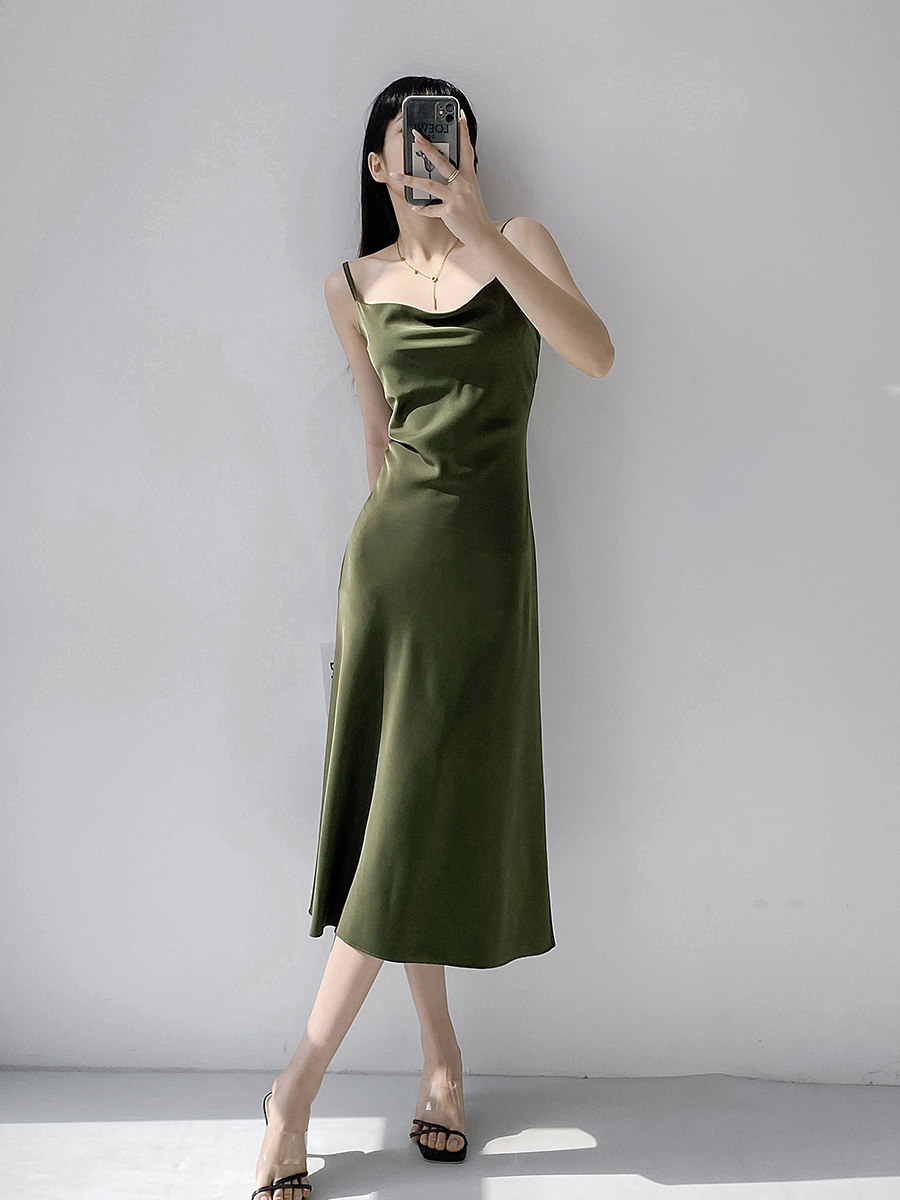 Lady's satin dress, acetic acid-flavored collar, high-end niche, sexy suspender dress, suit with long skirt