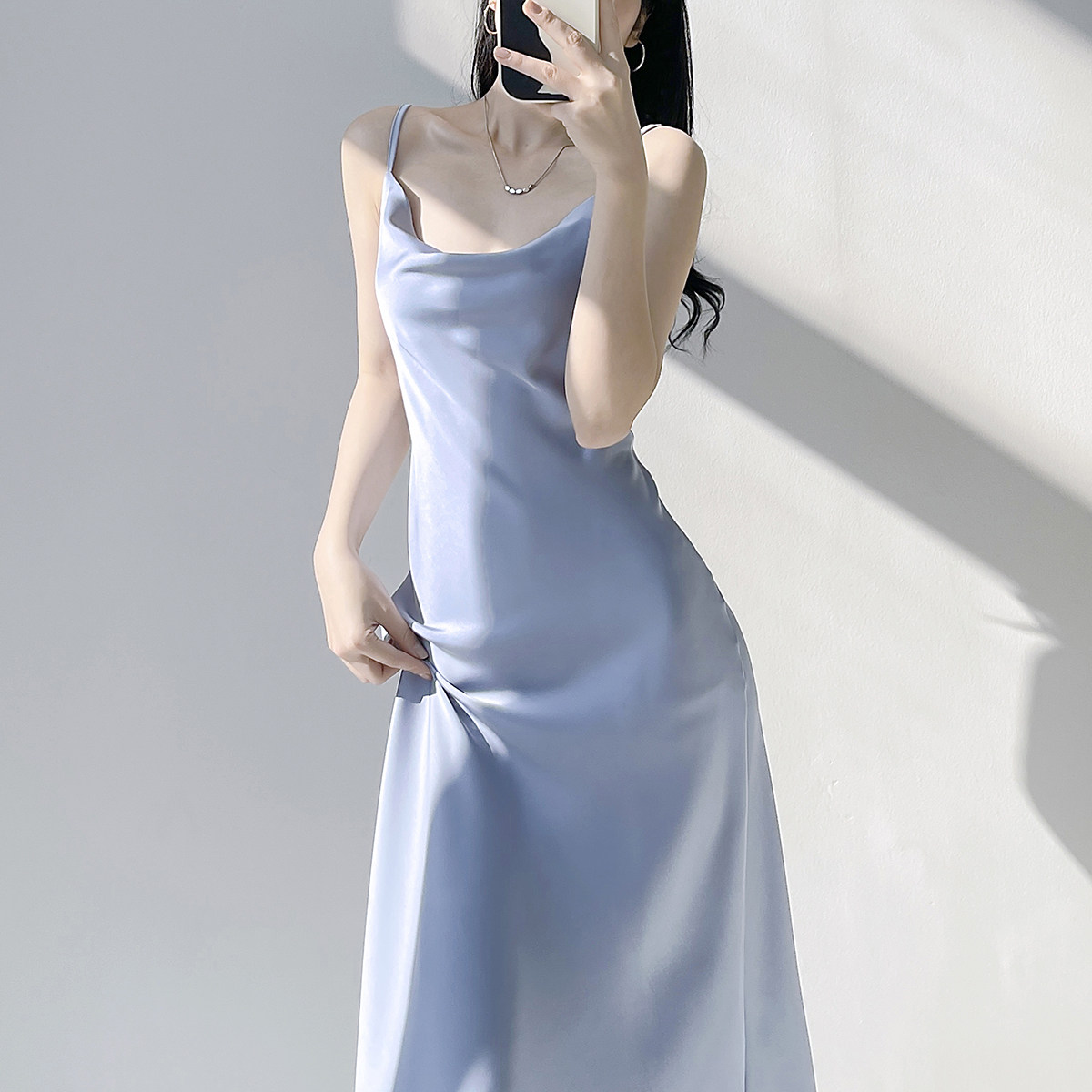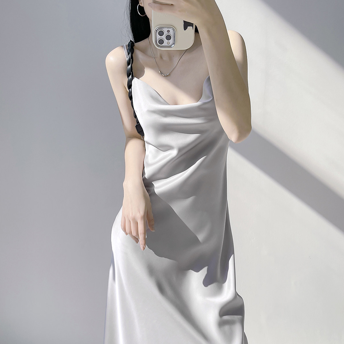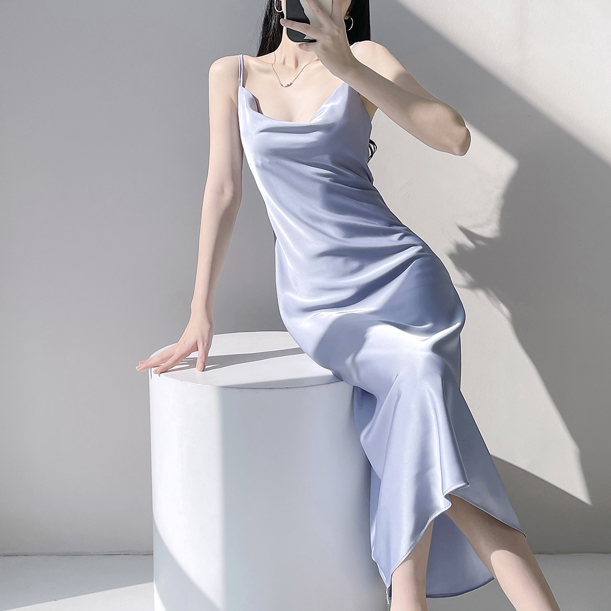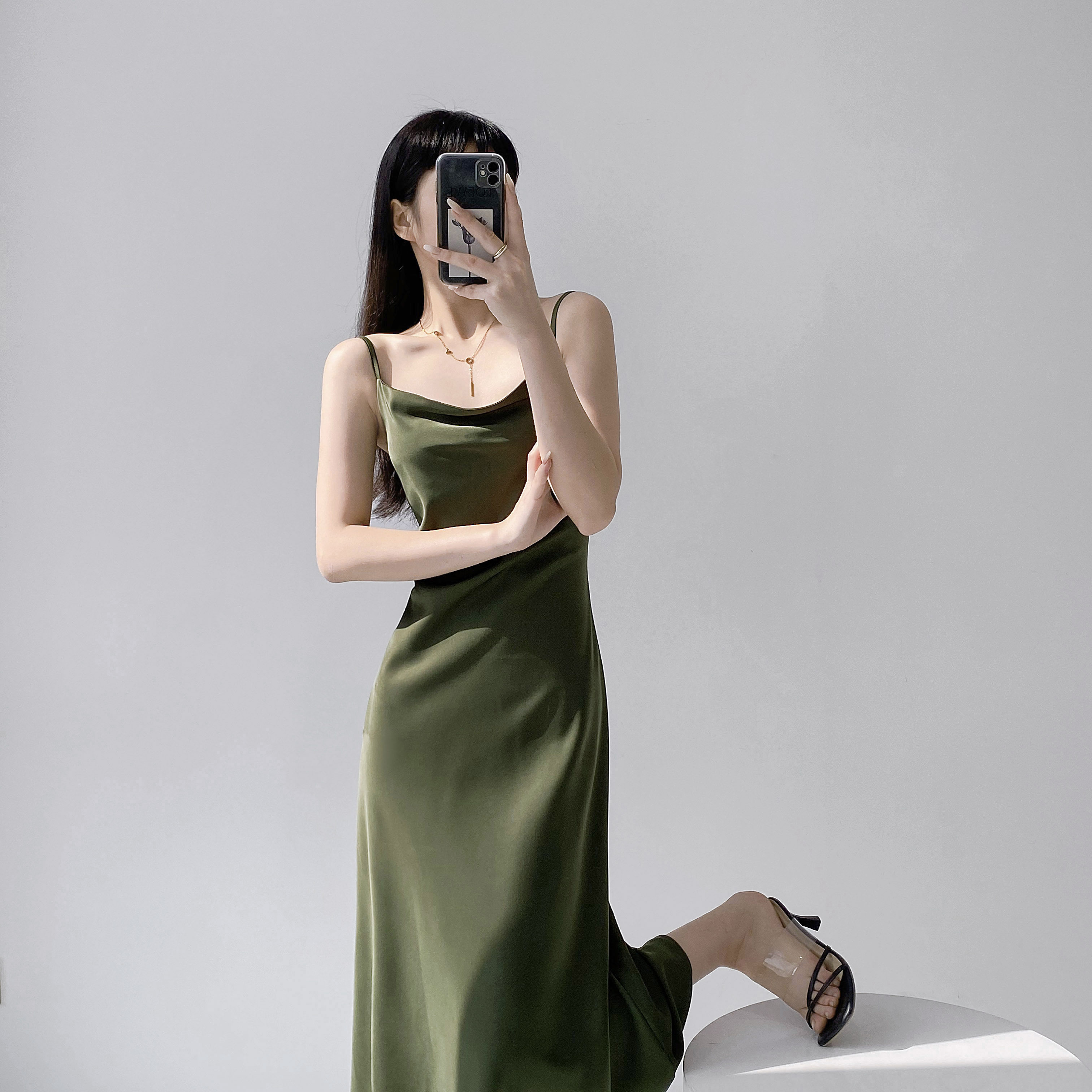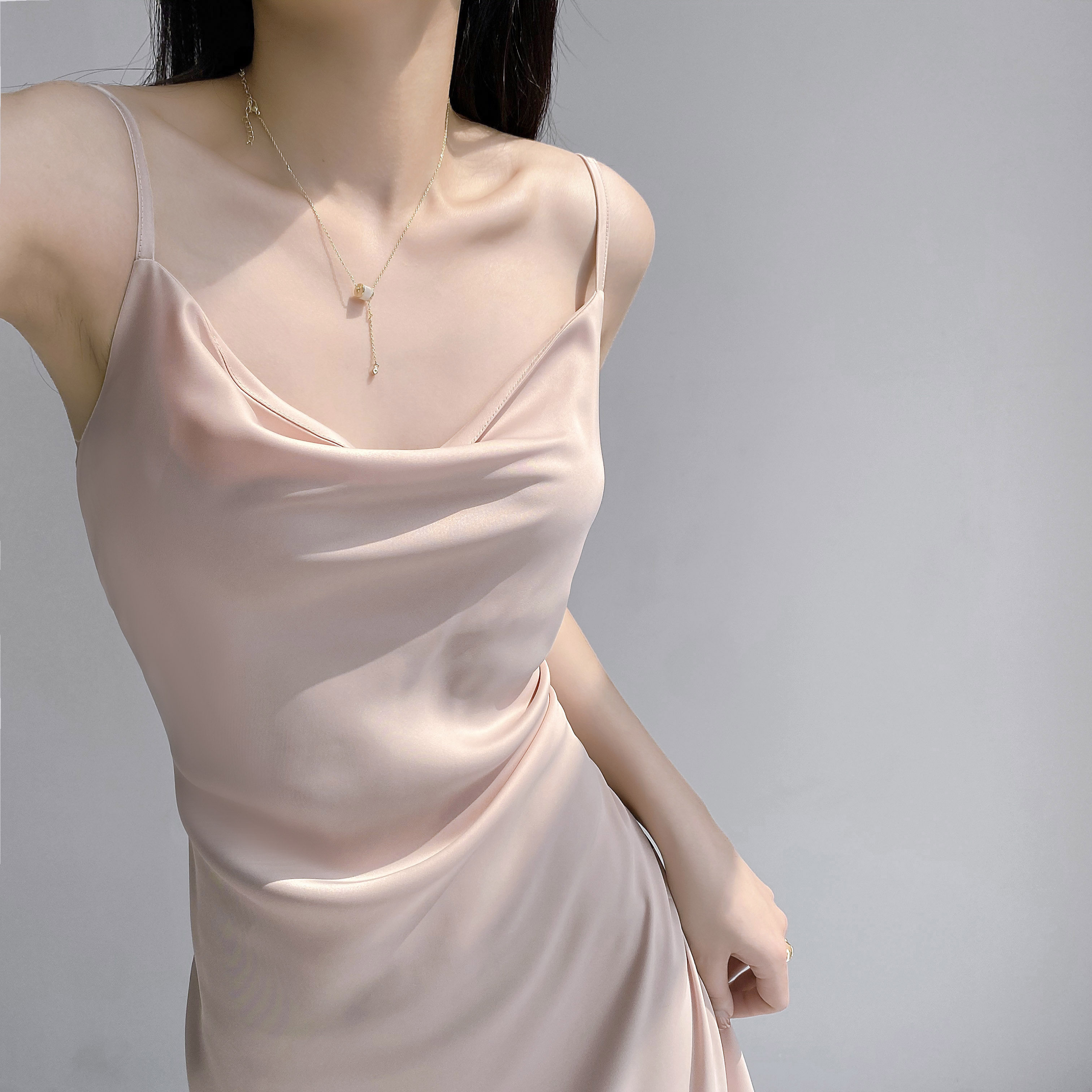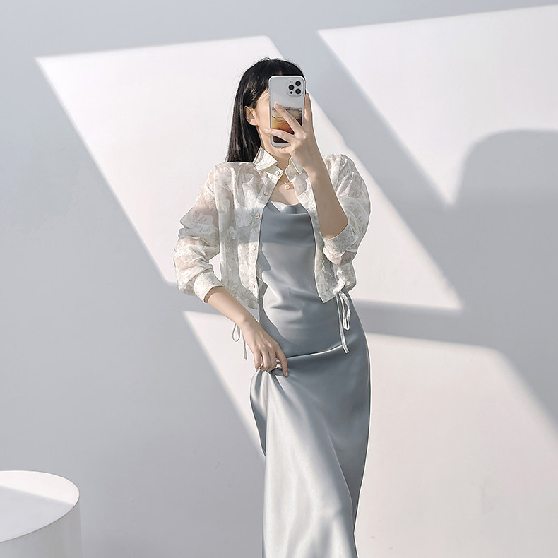 Lady's satin dress, acetic acid-flavored collar, high-end niche, sexy suspender dress, suit with long skirt