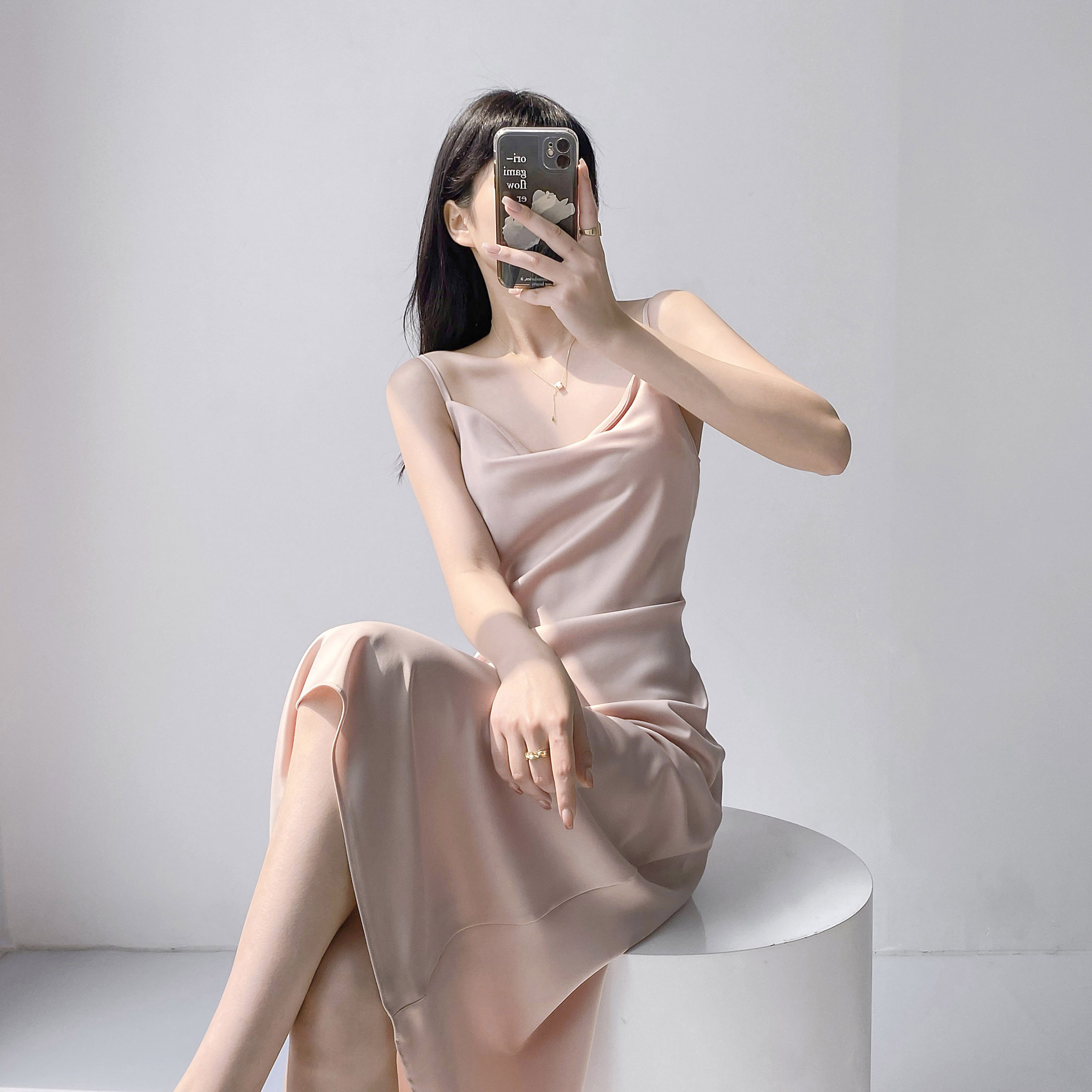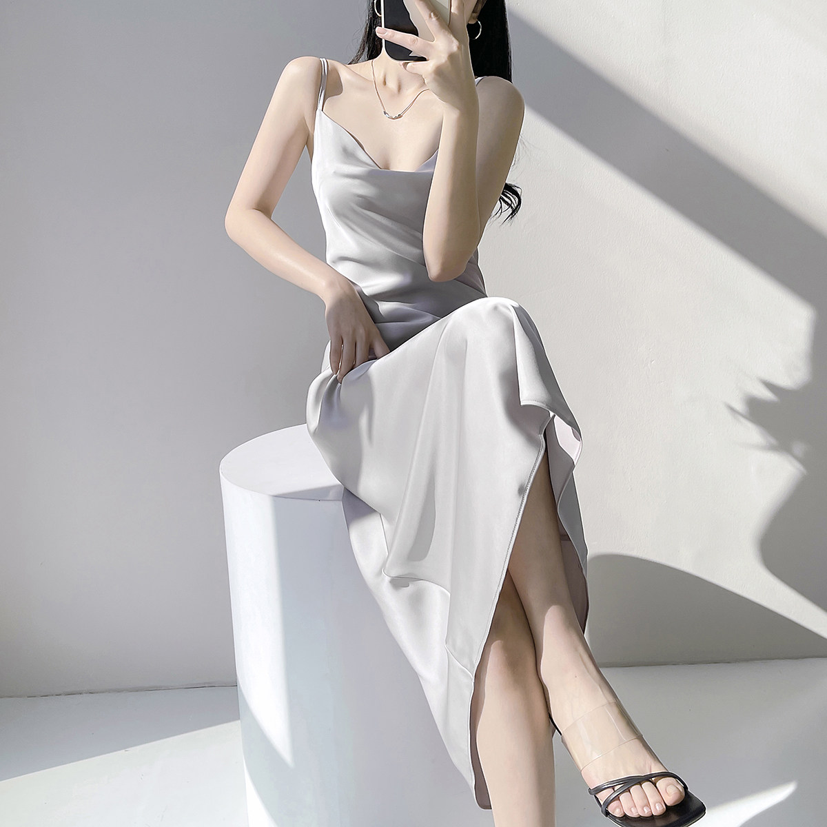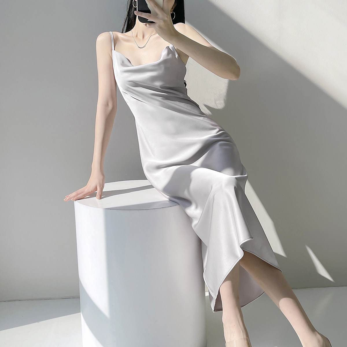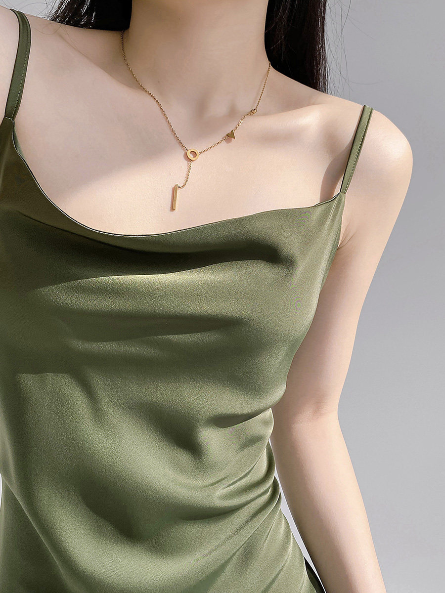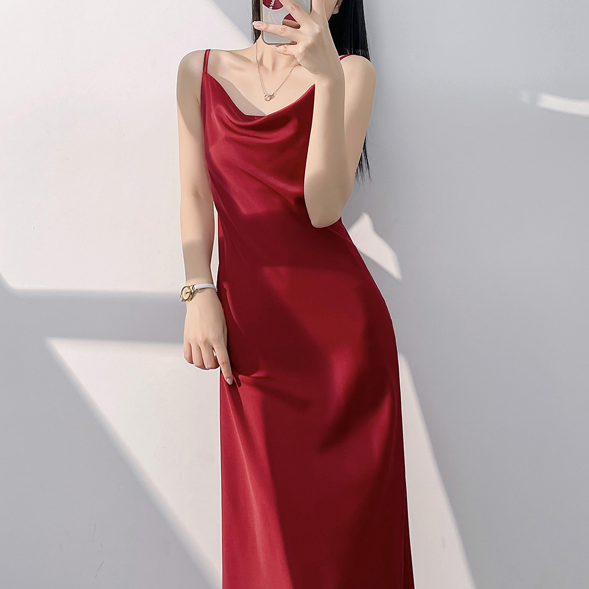 Lady's satin dress, acetic acid-flavored collar, high-end niche, sexy suspender dress, suit with long skirt