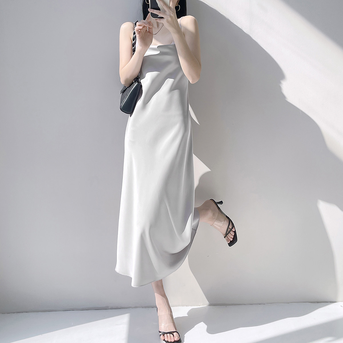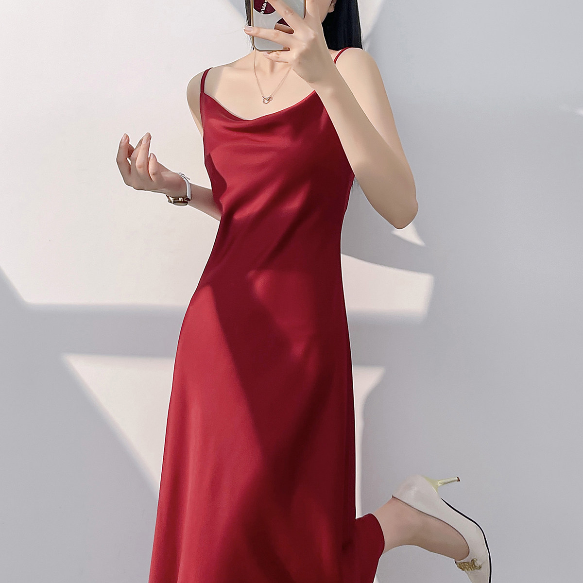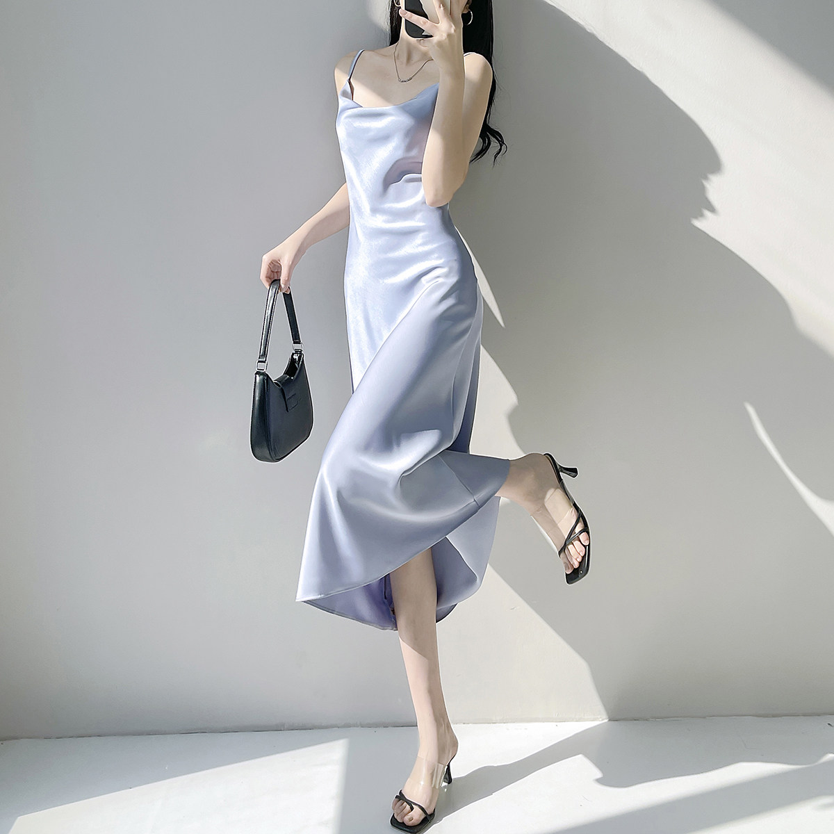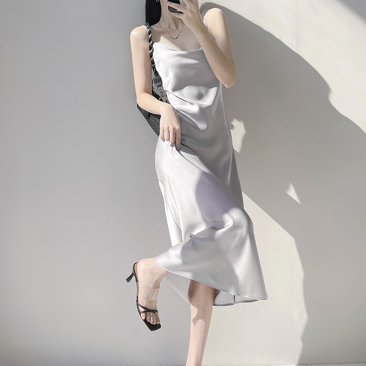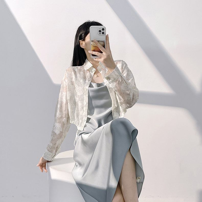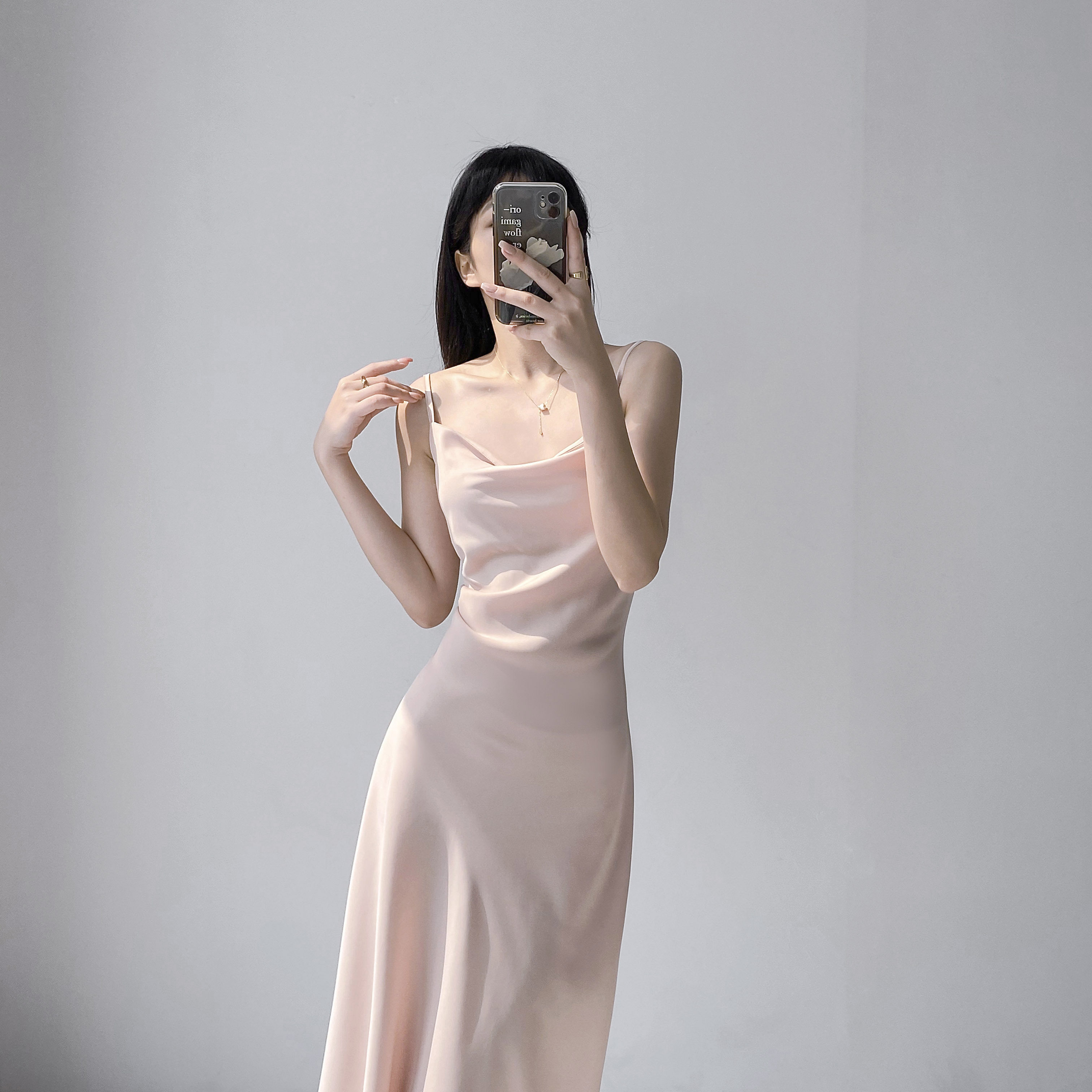 Lady's satin dress, acetic acid-flavored collar, high-end niche, sexy suspender dress, suit with long skirt